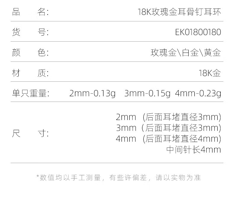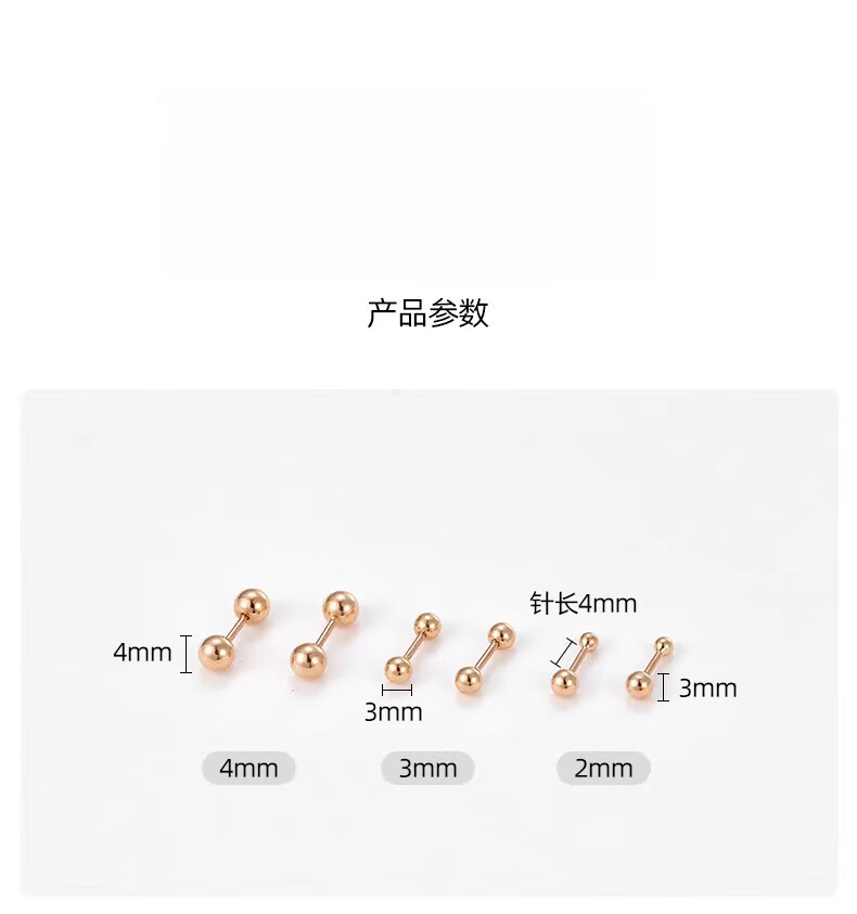 Tan Jin 18K color gold ear bone nails, round bead screws, short needle cochlear nails, rose gold, no need to take off and stack earrings for bathing and sleeping, 18K gold solid earrings, 2mm, single