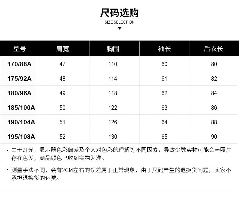 China (cm) 165 / 88-90 170 / 96-98 175 / 108-110 180 / 118-122 185 / 126-130