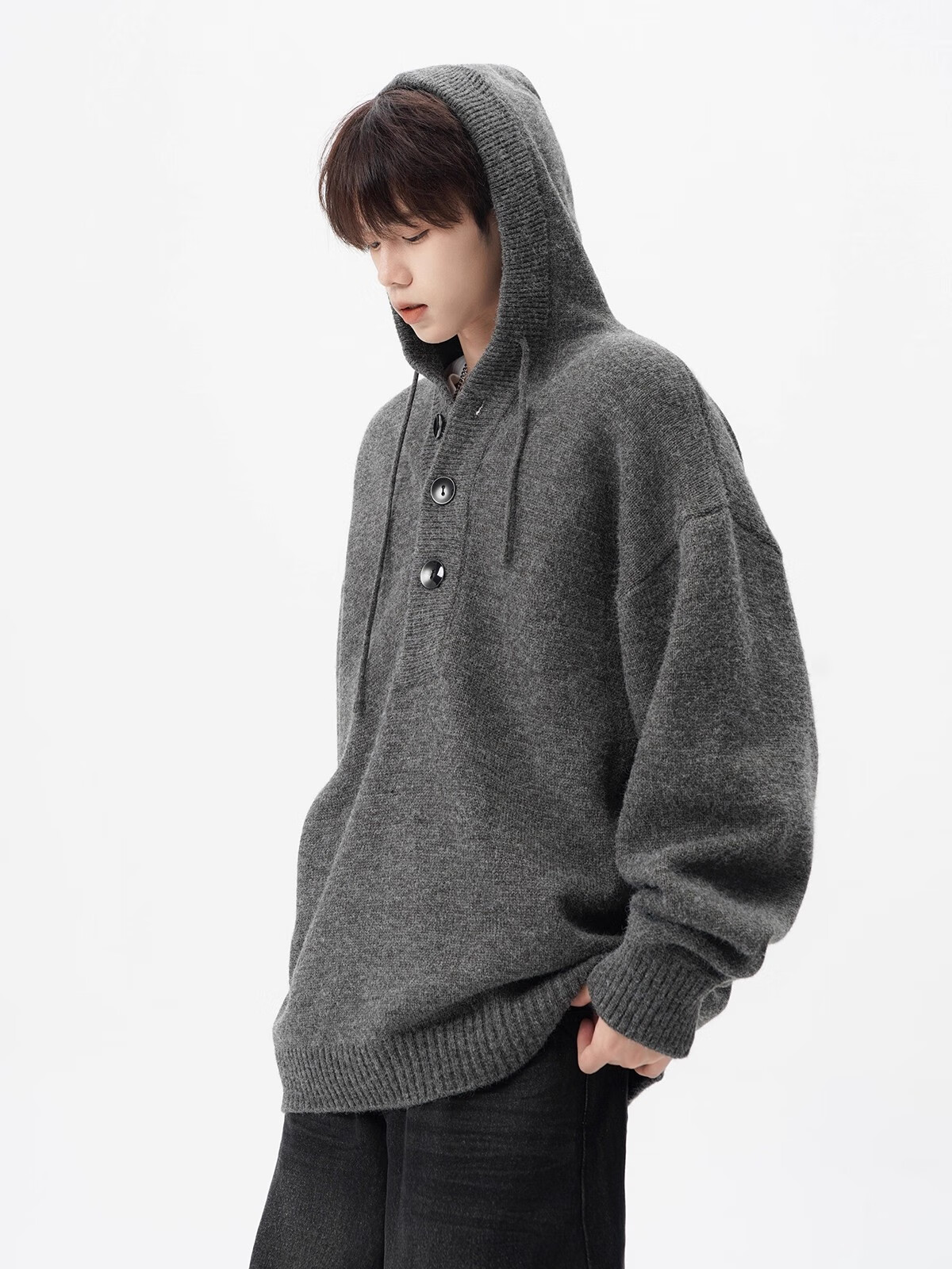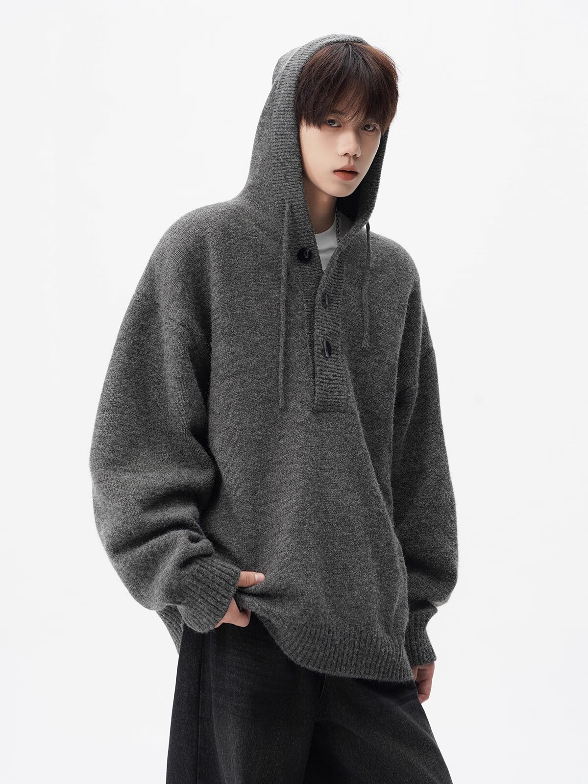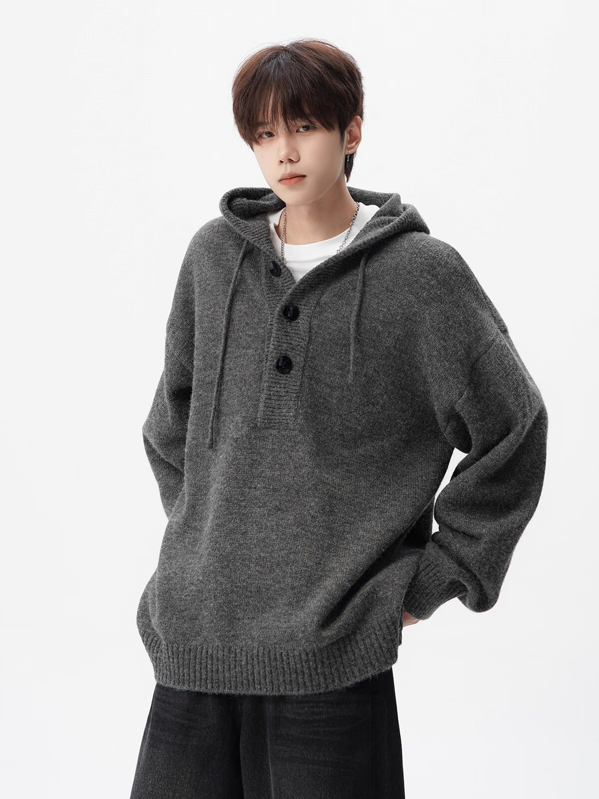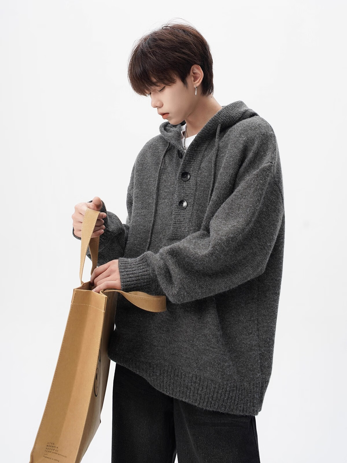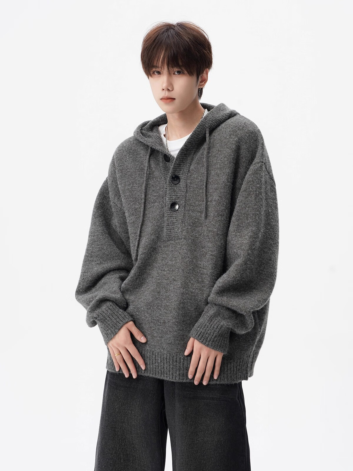 OEMG American heavyweight hooded sweater for men in autumn and winter trendy high-end knitted sweater button top lazy jacket gray XL recommended 110-130Jin Jin equals 0.5 kg
