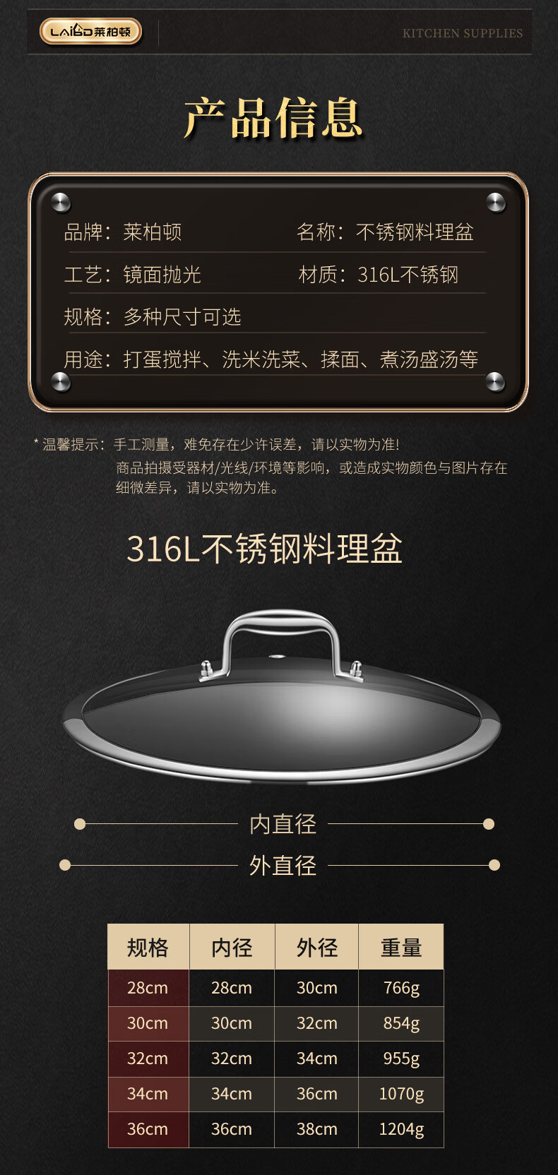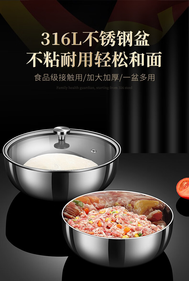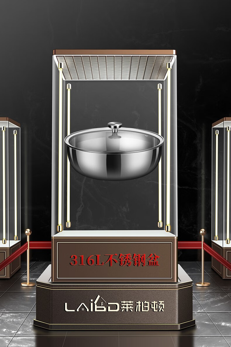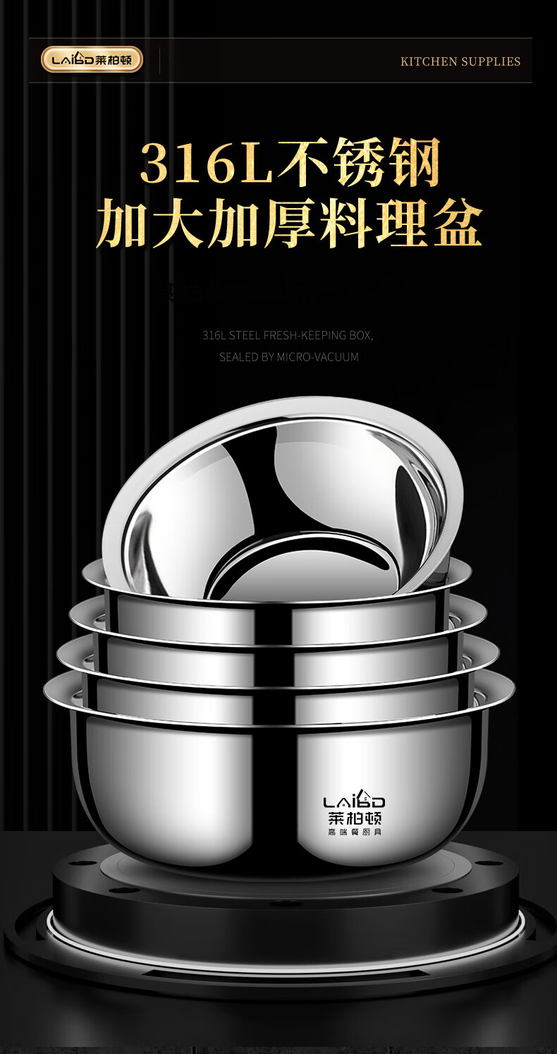 Laberton 316 stainless steel basin and basin with lid food grade household thickening dough kneading vegetable basin washing bottle basin inner diameter 36cm basin + tempered glass lid 13.5L