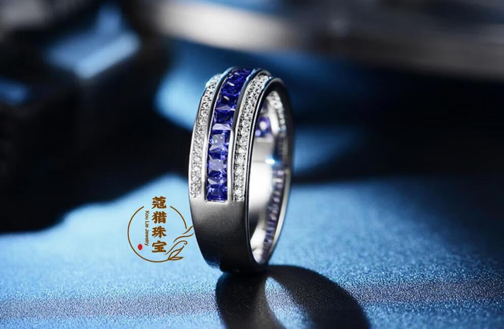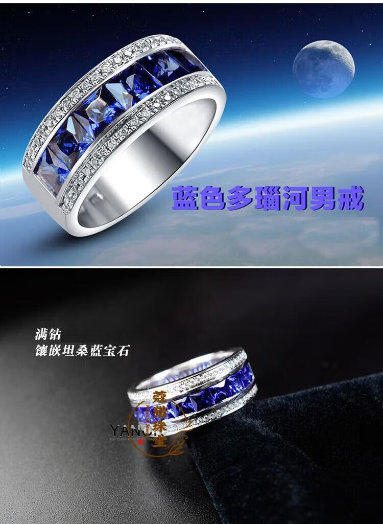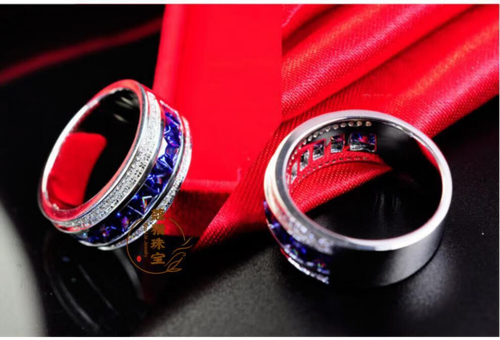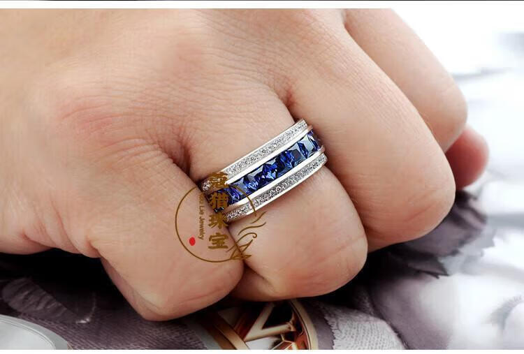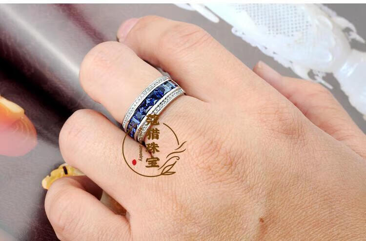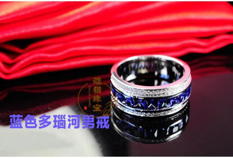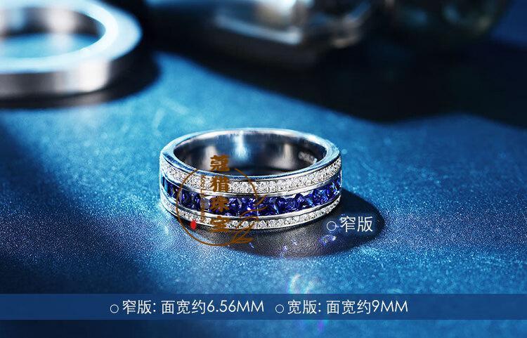 Fat Donglai's same moissanite diamond ring for men, sapphire ring for men, single row of diamonds, imitation tanzanite silver, platinum plated, customized full circle narrow version, default blue - 10~15 days