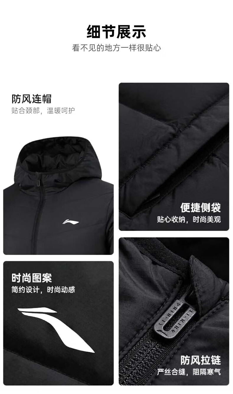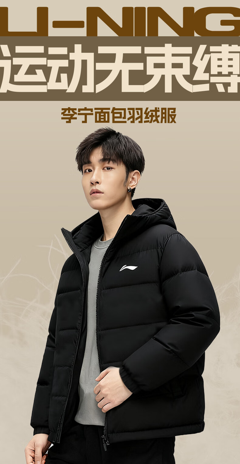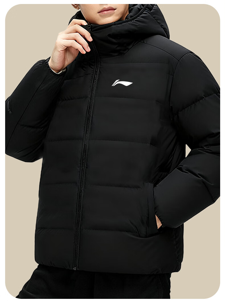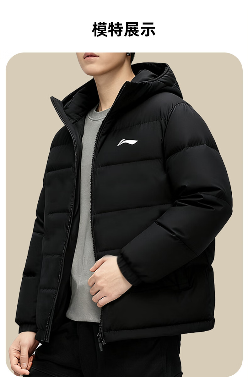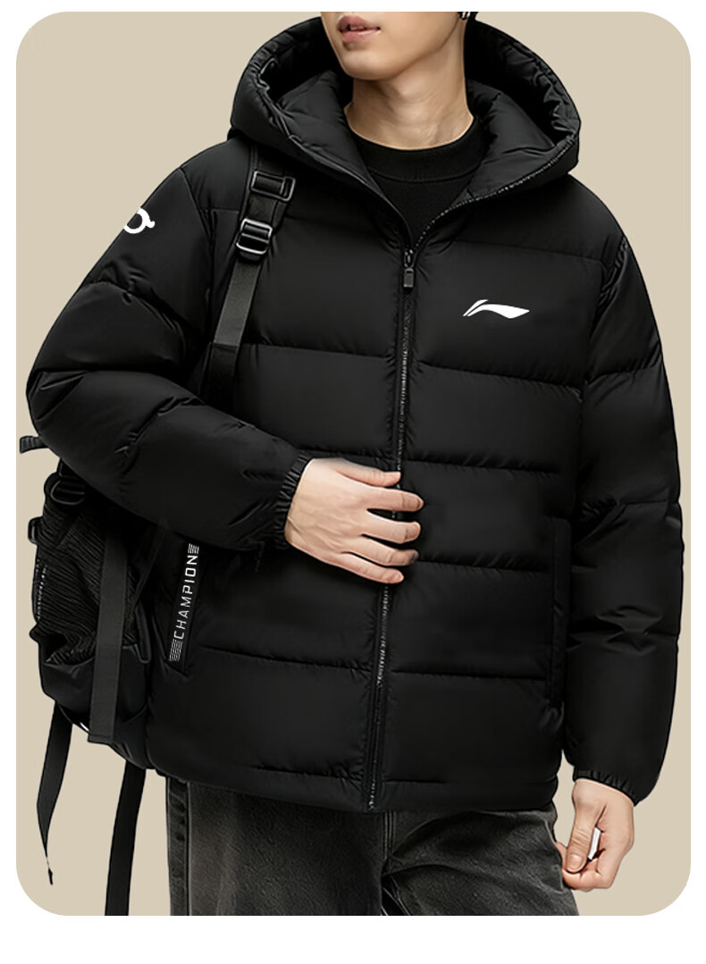 Li Ning Duck Down Jacket Men's 2025 Casual Short Winter Plush Down Hooded Windproof Warm and Versatile Jacket for Men Black (Thick Duck Down Style) XL