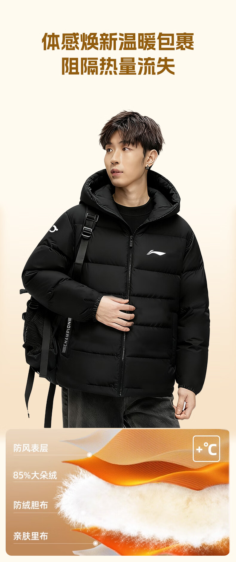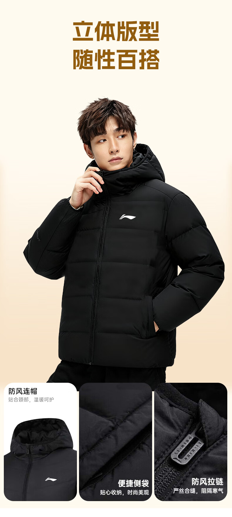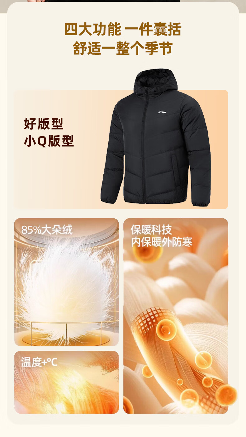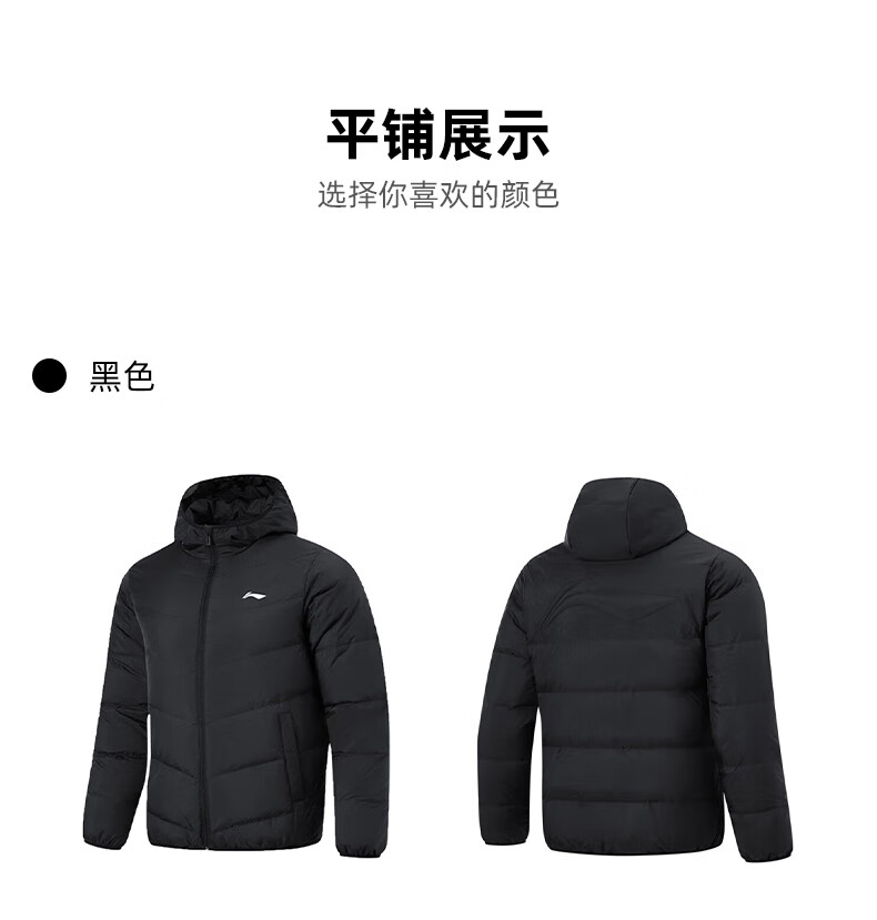Li Ning Duck Down Jacket Men's 2025 Casual Short Winter Plush Down Hooded Windproof Warm and Versatile Jacket for Men Black (Thick Duck Down Style) XL