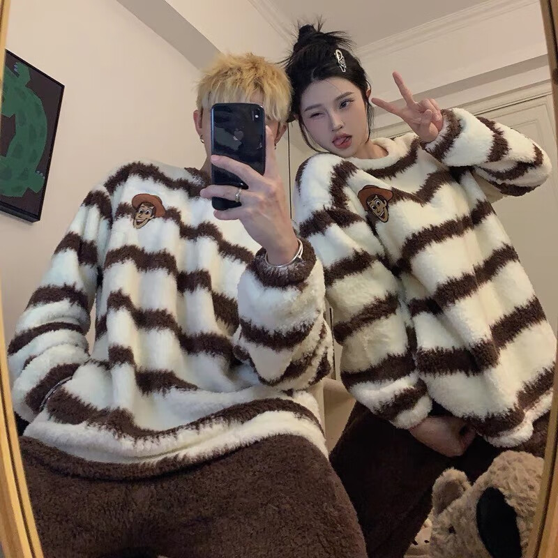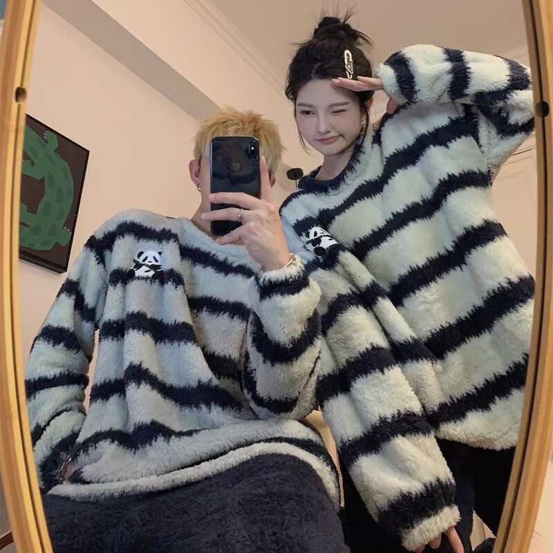 Mengdong Korean Stitch Cartoon Couple Pajamas for Men and Women Autumn and Winter Plus Velvet Thickened Striped Plush Home Clothes Two-piece Set TM#8920 Striped Stitch 2XL Men's Style (145-170 Jin Jin is equal to 0.5 kg)