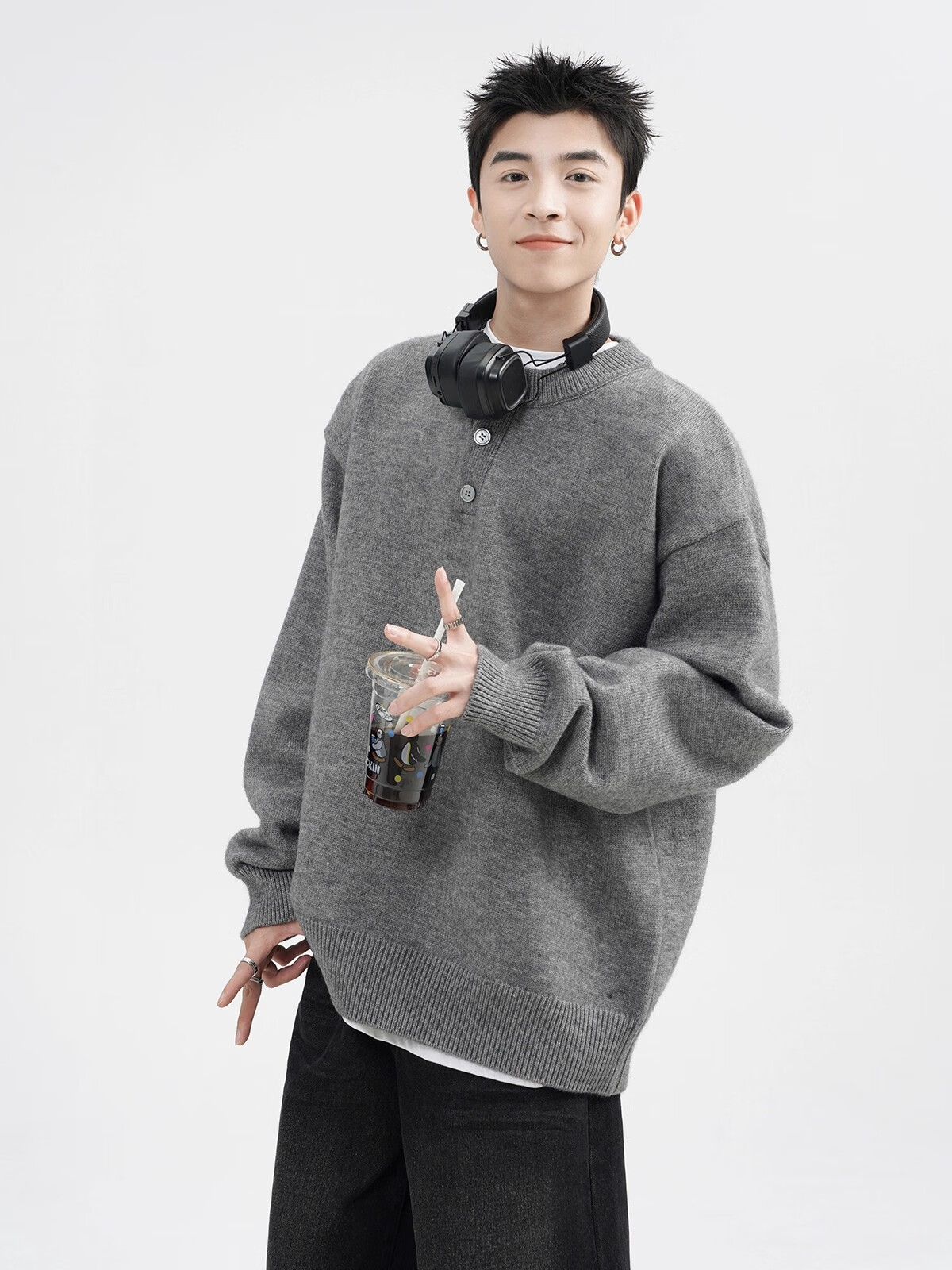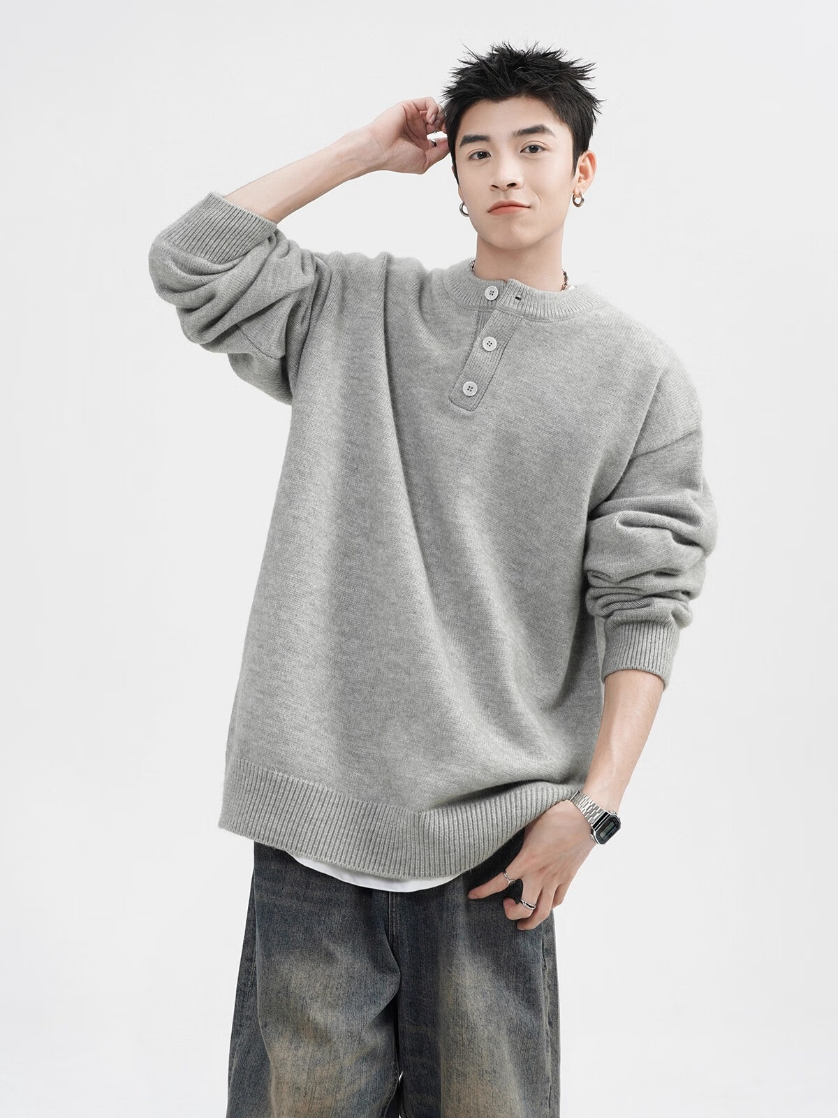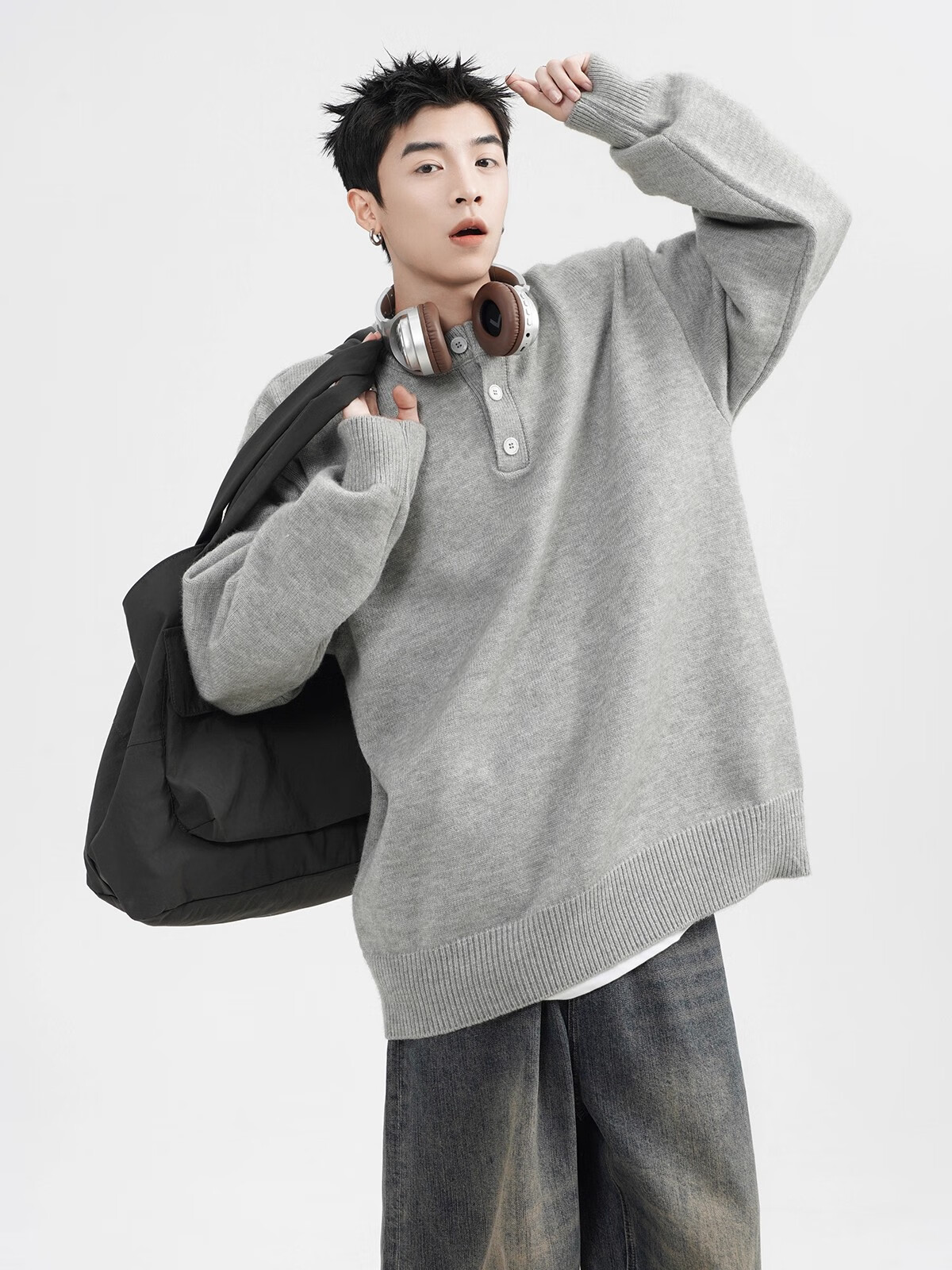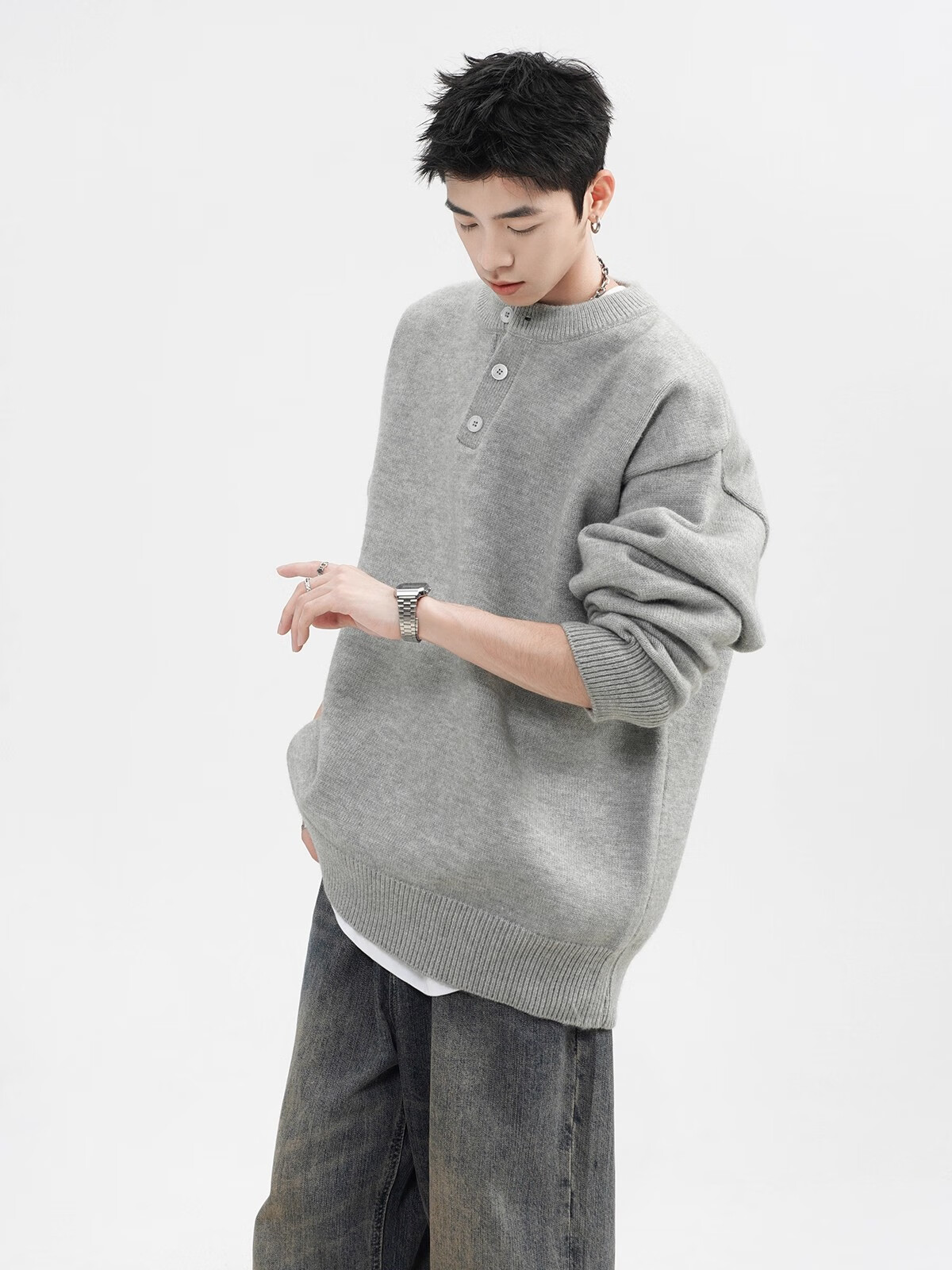 OEMG Henry collar sweater men's autumn new retro top versatile high-end casual sweater jacket dark gray XL recommended 110-130Jin Jin equals 0.5 kg