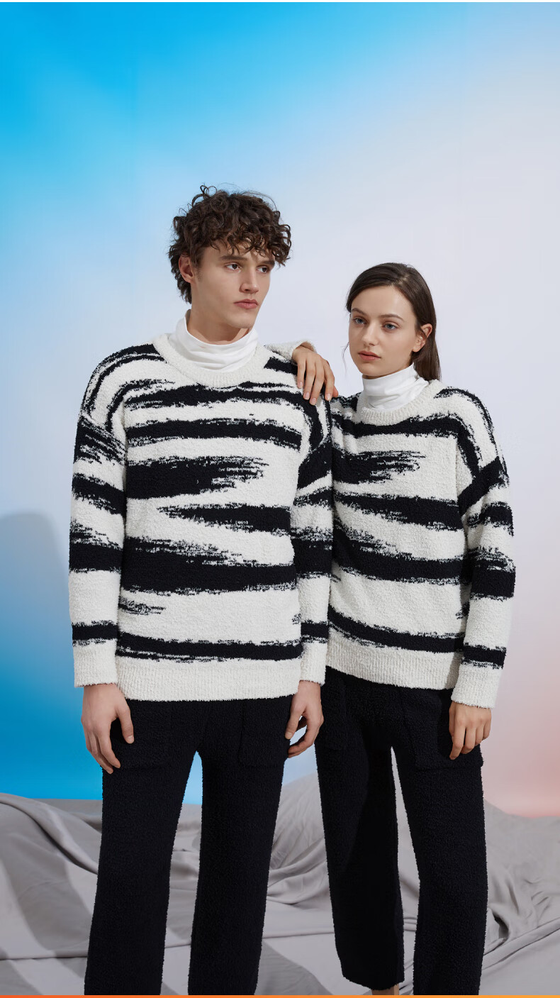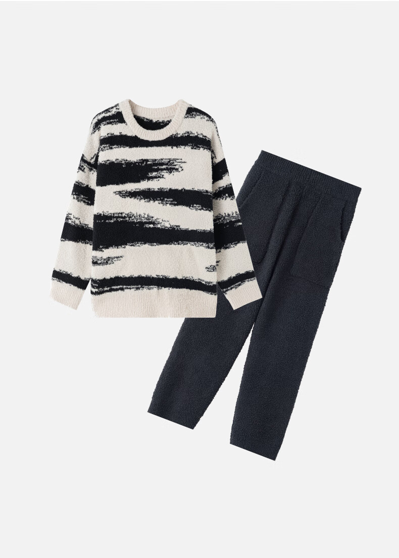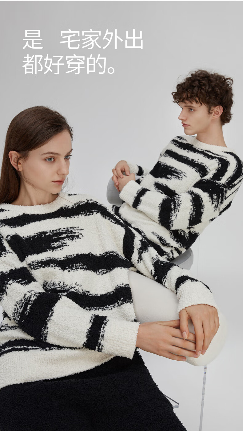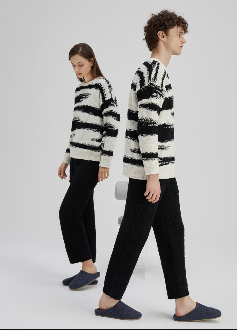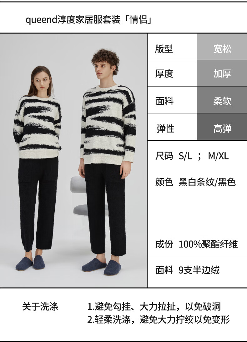Chundu Soft Half Velvet Couple Pajamas Women's Winter Thickened Coral Velvet Long Sleeve Home Clothes Men's Winter Suit Can Be Weared Outside Black and White Stripes/Black (Male) M (Suitable for M-L sizes)