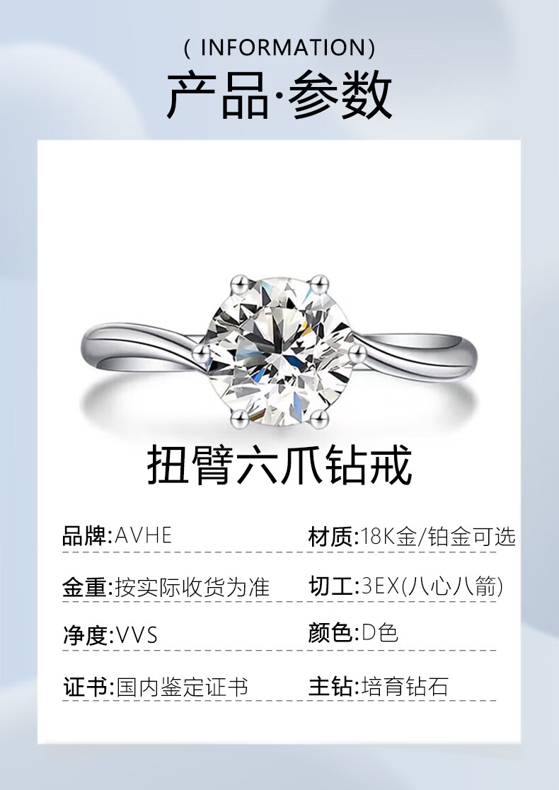 AVHE cultured diamond platinum ring with twisted arm and six claws, please order wedding gift Qixi Festival platinum laboratory diamond ring in stock. Platinum ring + 30 points diamond (D/VVS/3EX/N) No. 9-20 circle (circle number can be noted)