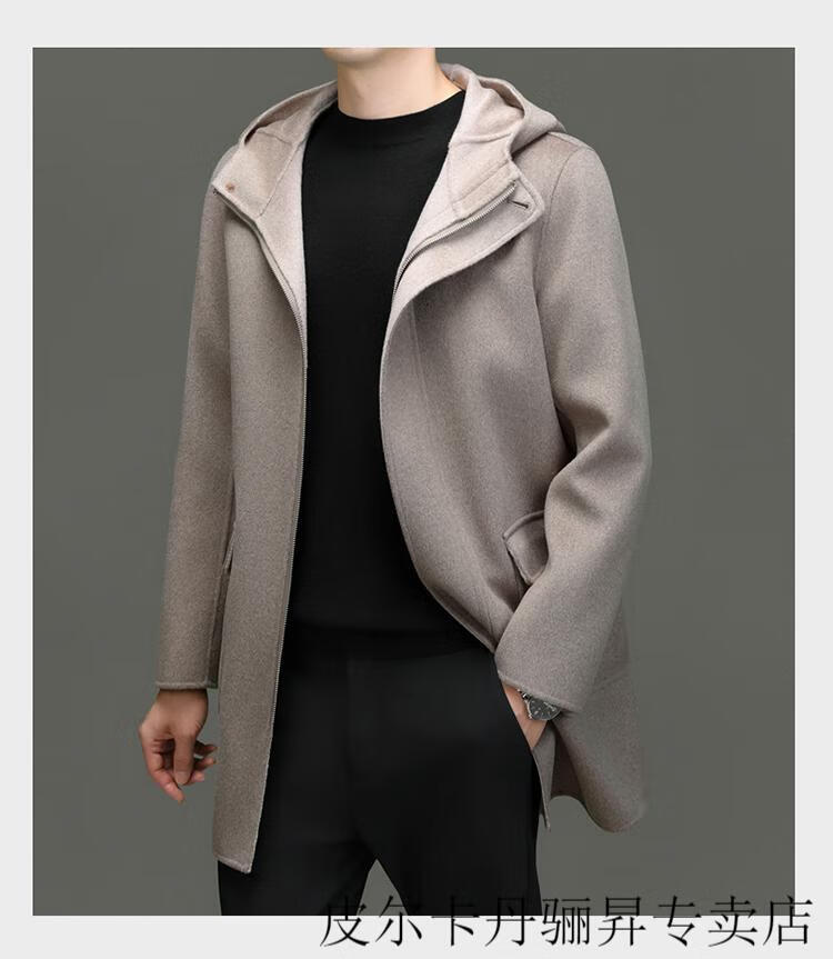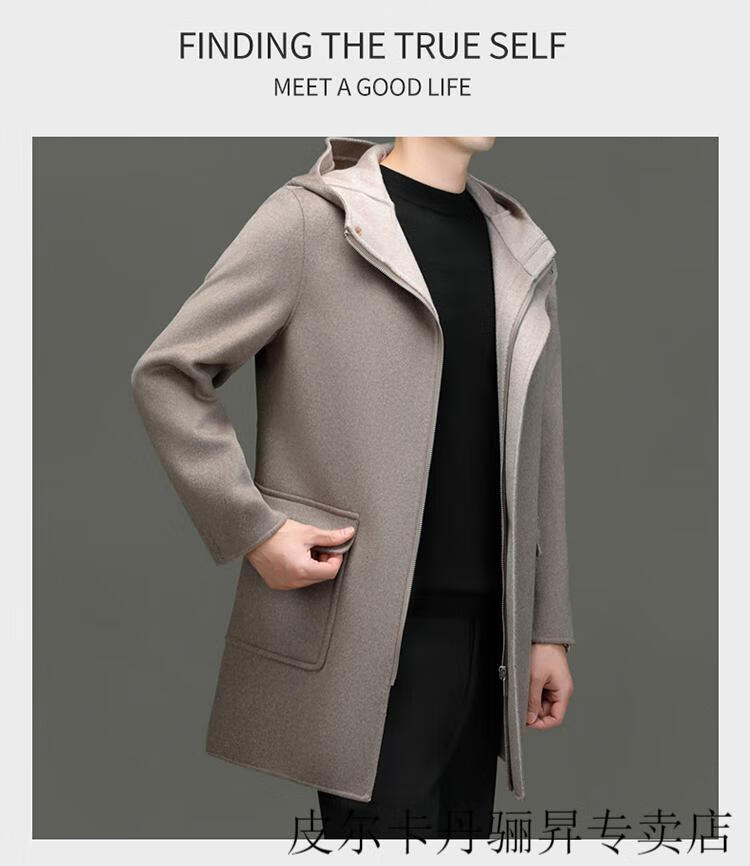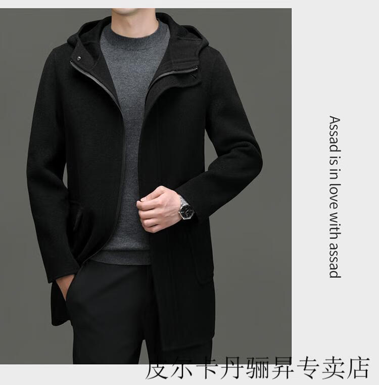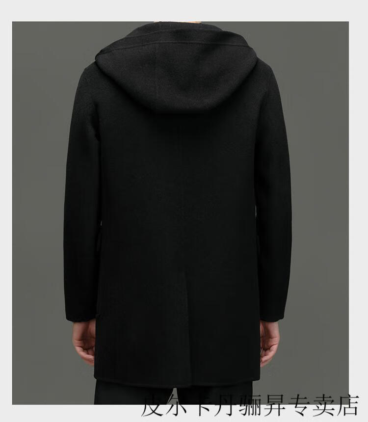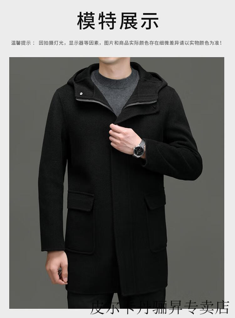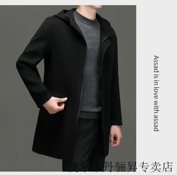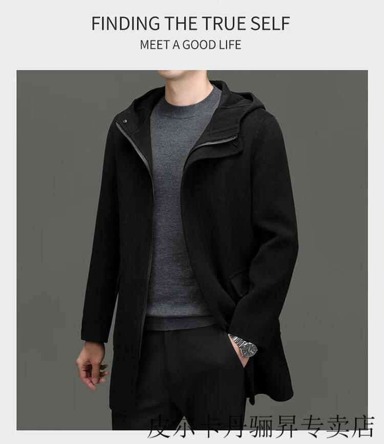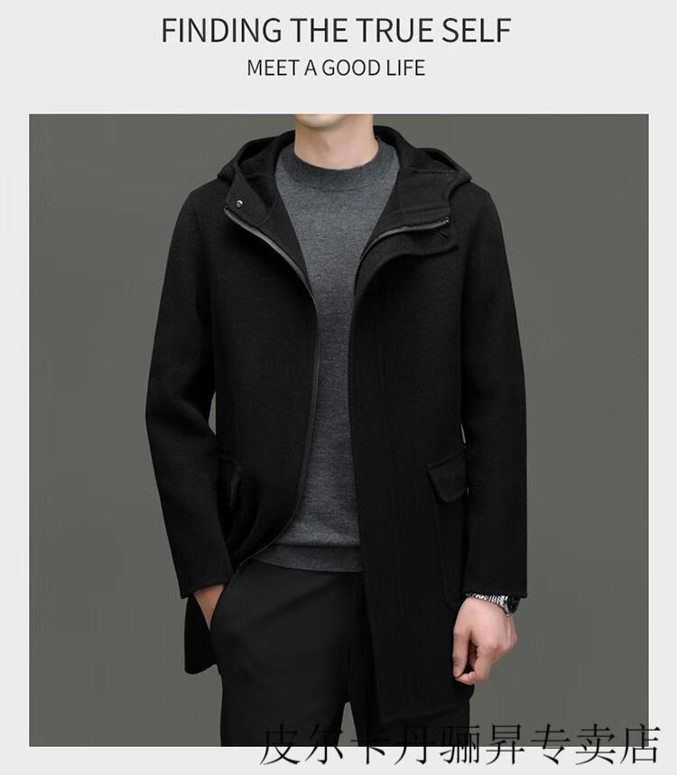 Pierre Cardin brand 100% wool hooded woolen coat men's autumn and winter mid-length double-sided woolen coat casual wool windbreaker black M recommended 110-130Jin Jin equals 0.5 kg