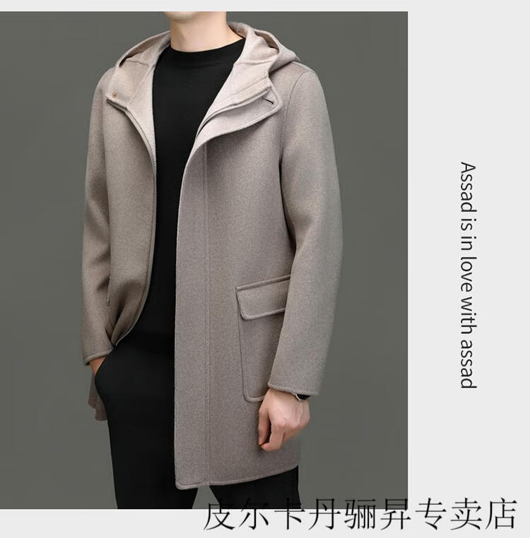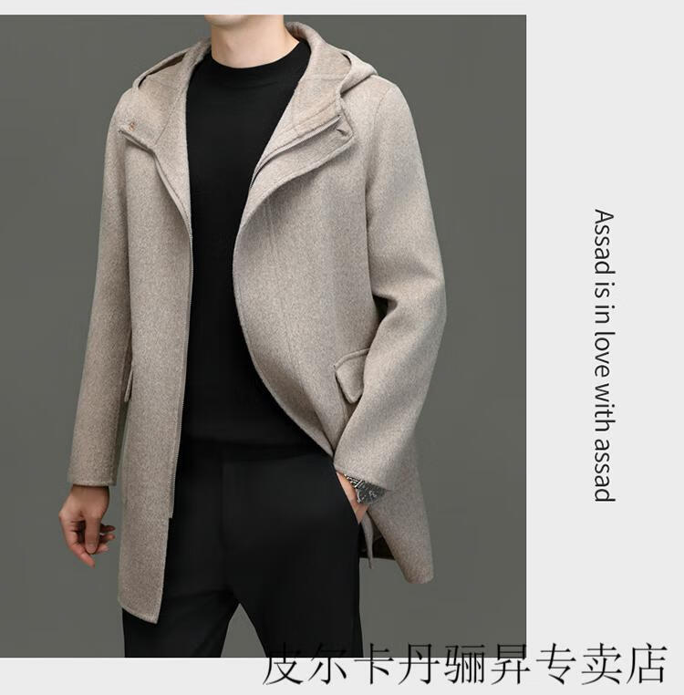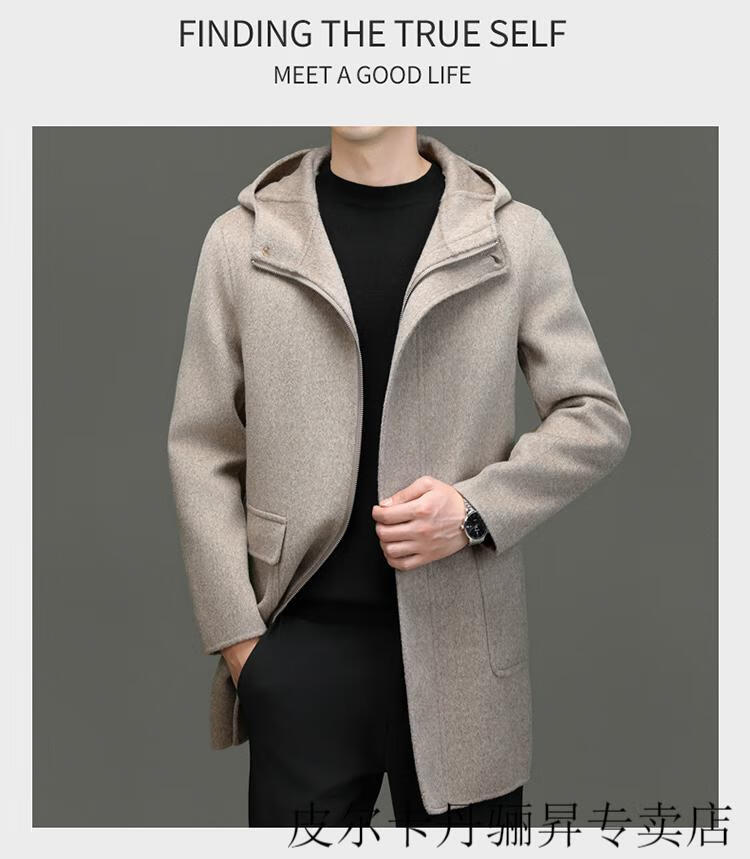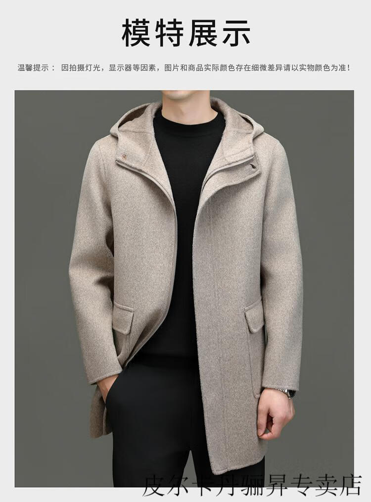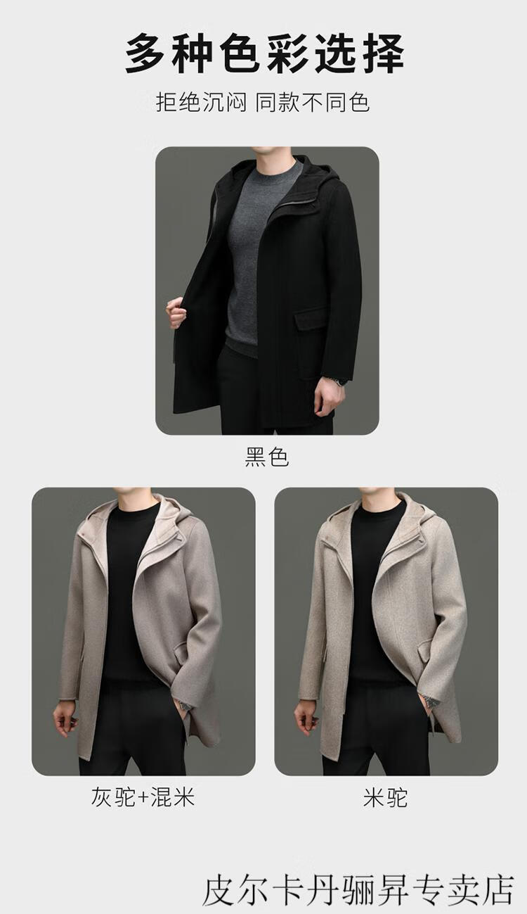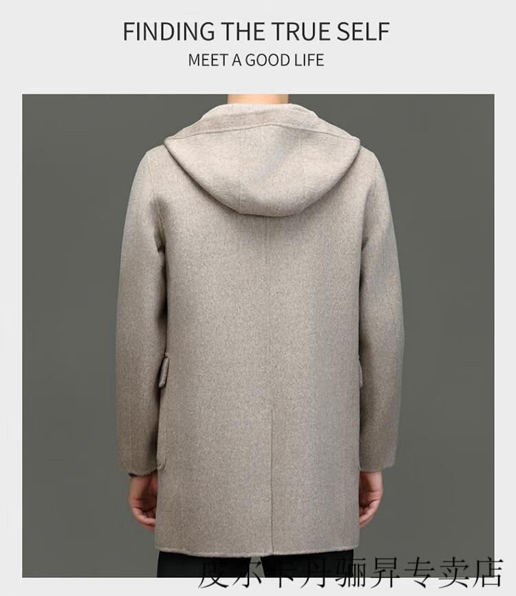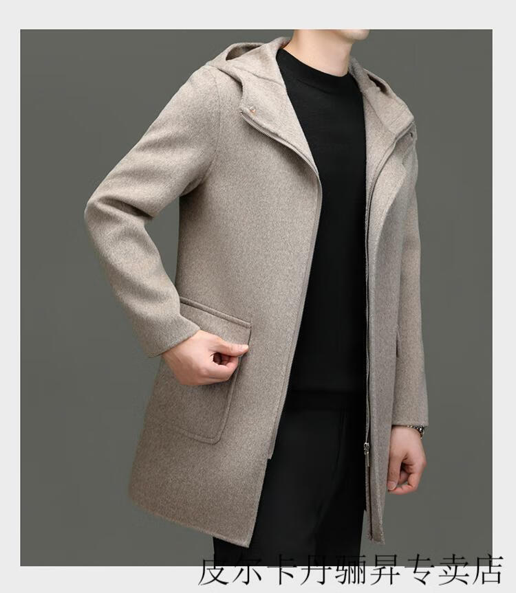Pierre Cardin brand 100% wool hooded woolen coat men's autumn and winter mid-length double-sided woolen coat casual wool windbreaker black M recommended 110-130Jin Jin equals 0.5 kg
