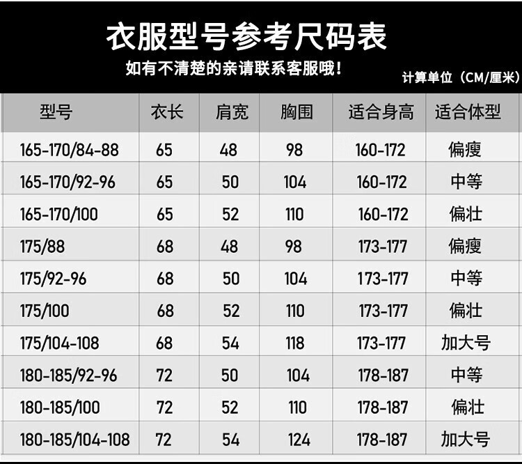 China (cm) 160-165/84-86 165-170 / 88-90 167-172 / 92-96 168-173 / 98-102 170-176 / 106-110