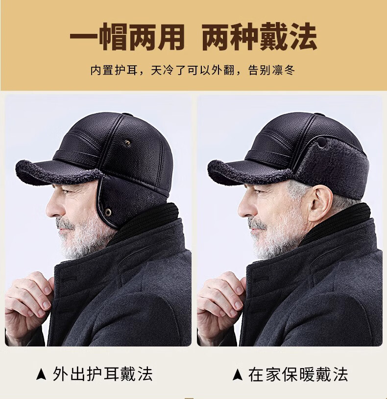 Woodpecker middle-aged and elderly men's winter thickened velvet and warm leather hat for dad, grandpa and the elderly, windproof and ear-protecting duck cap, black, gift box, one size fits all, collect and purchase, priority delivery