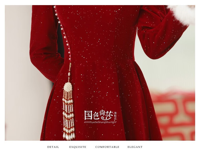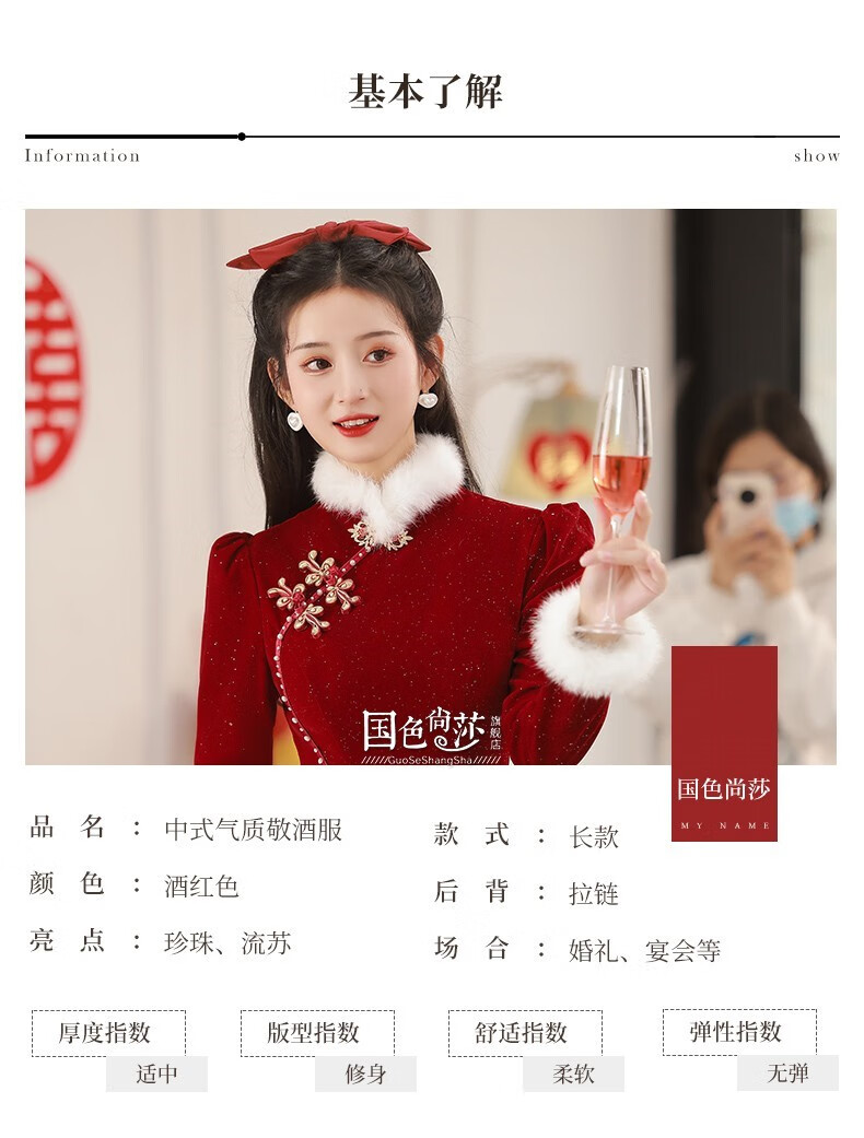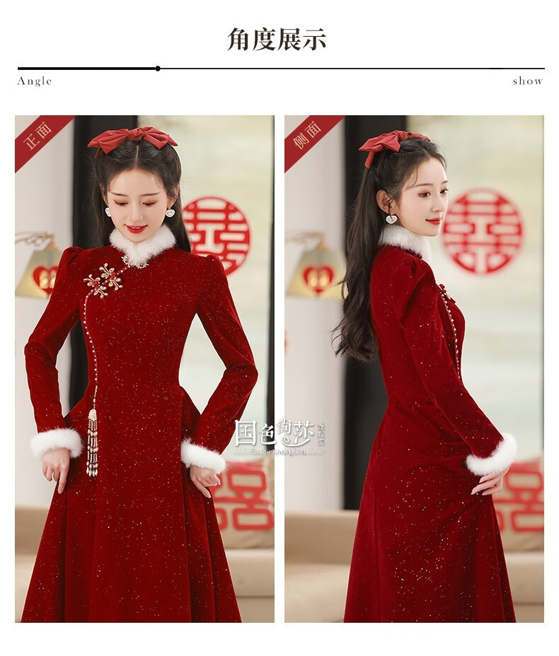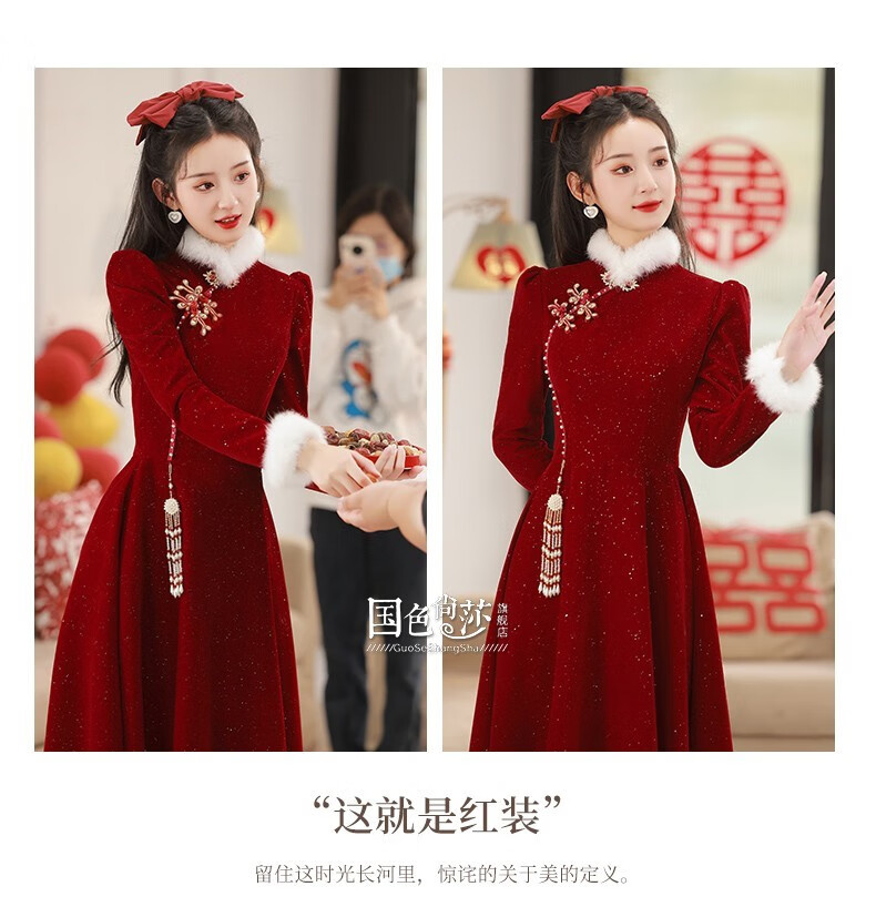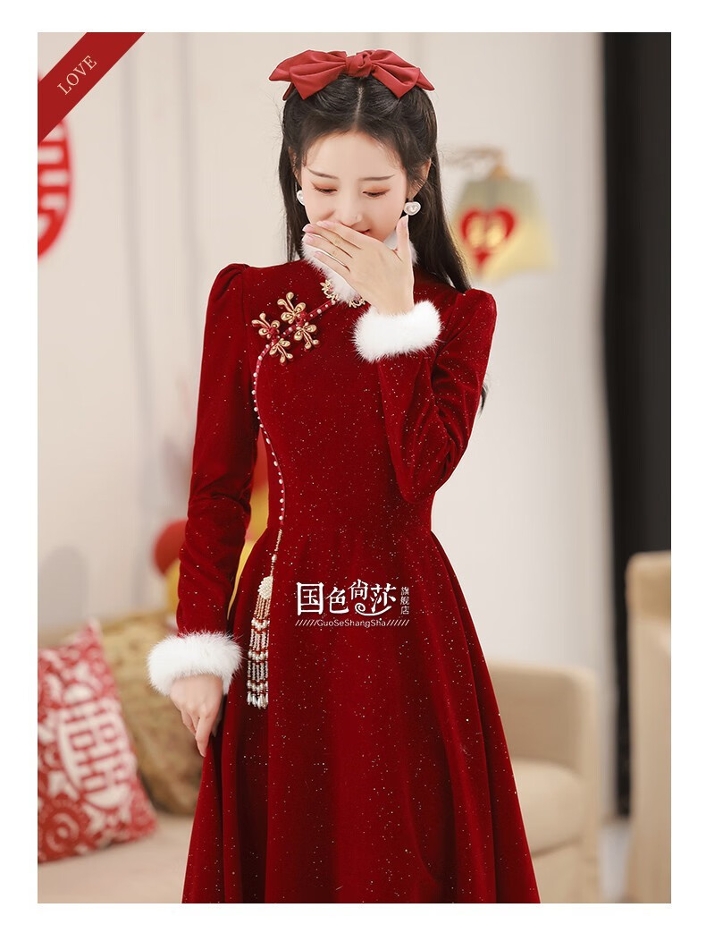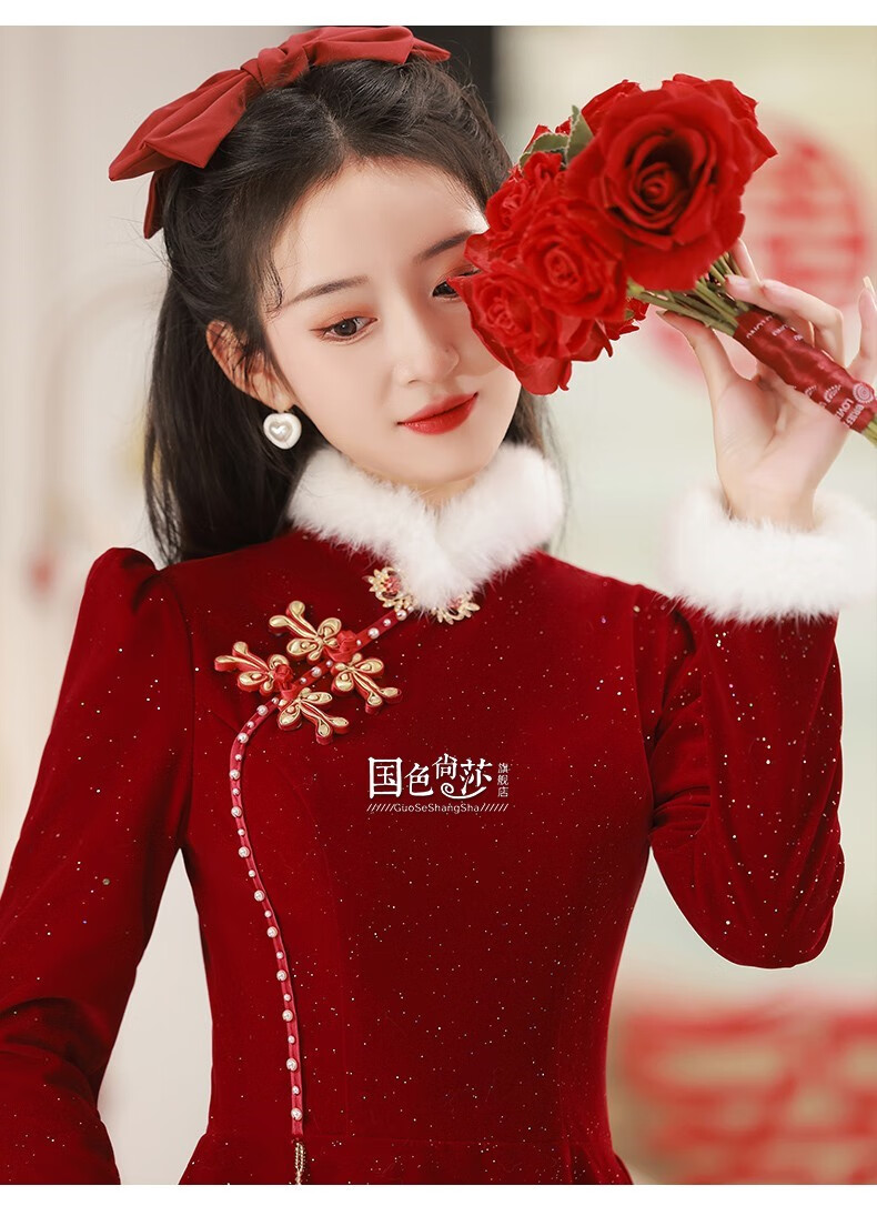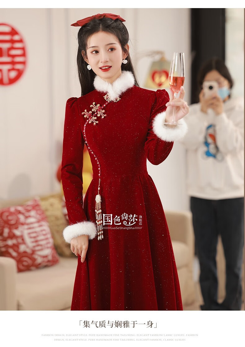 Lanka Roni Cheongsam Toast Wear Bride 2025 New Burgundy Winter Wedding Dress Women's Chinese Style Thick Style Engagement gs768 Burgundy Long Style M