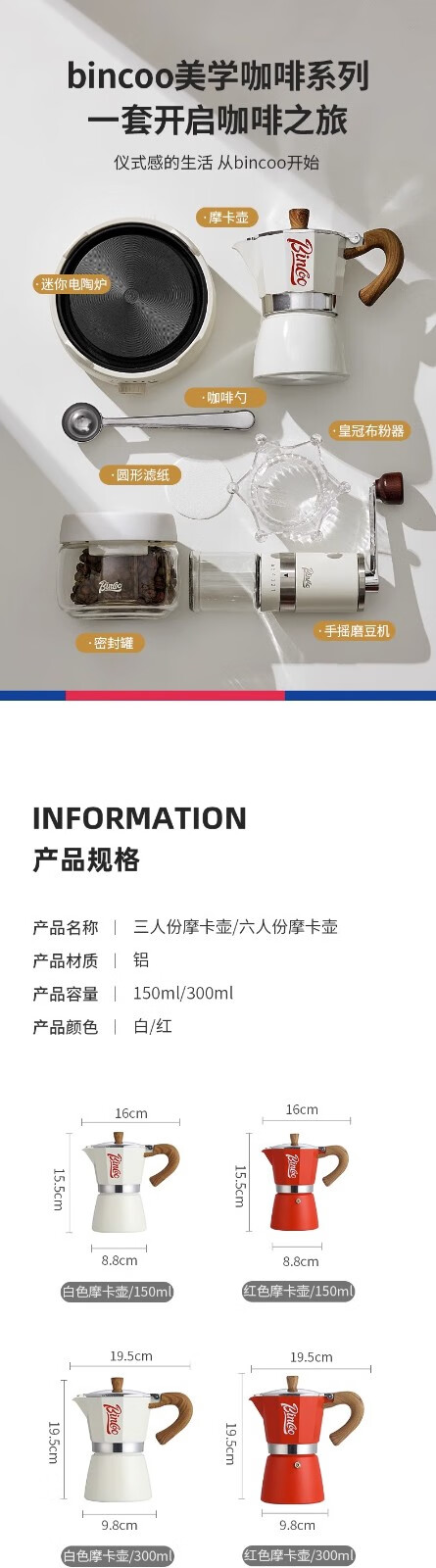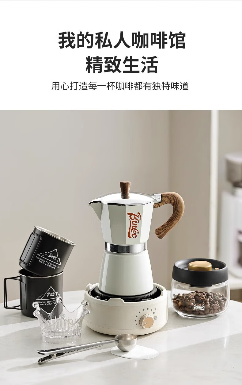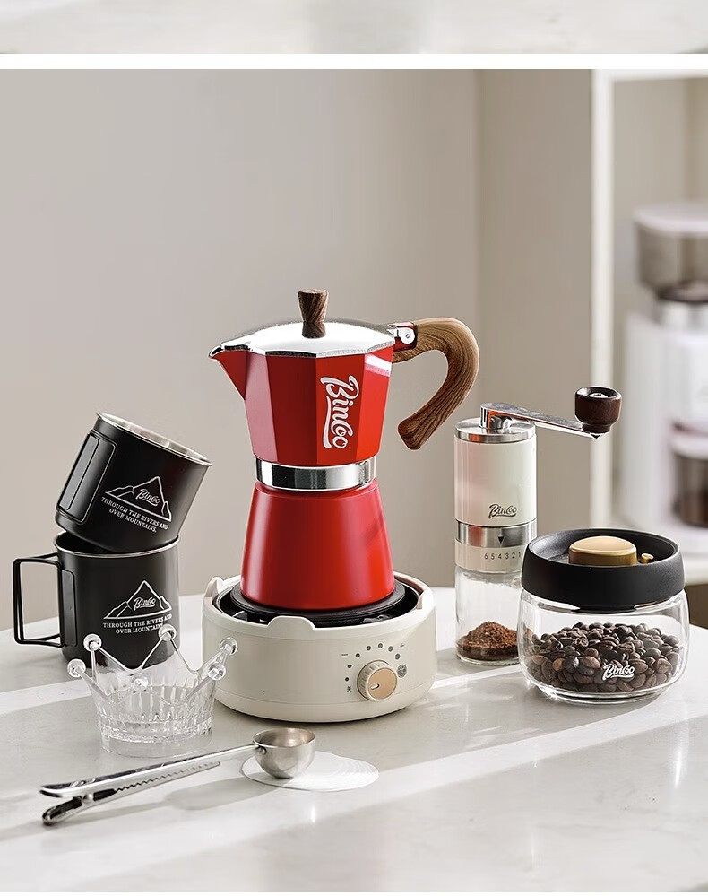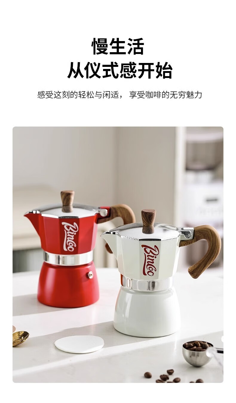 Bincoo coffee Moka pot household small espresso hand brewed coffee pot hand grinding coffee machine coffee utensils 6 servings red and white moka pot 3-piece set - 300ml