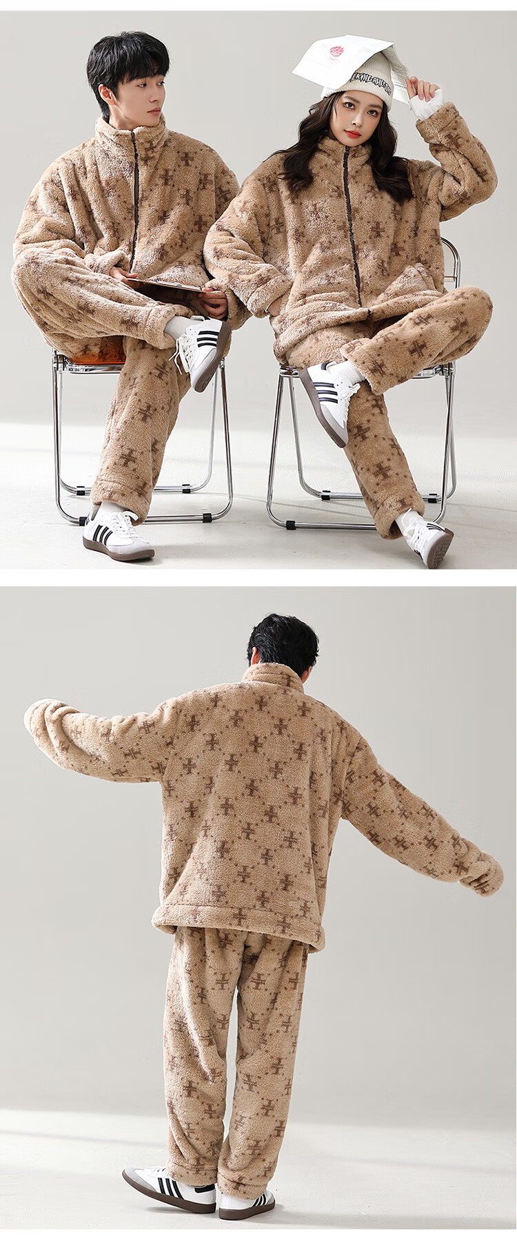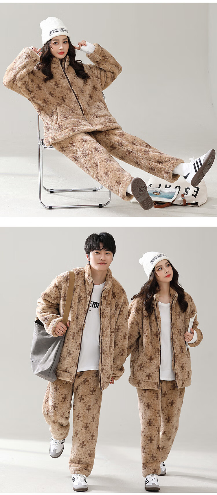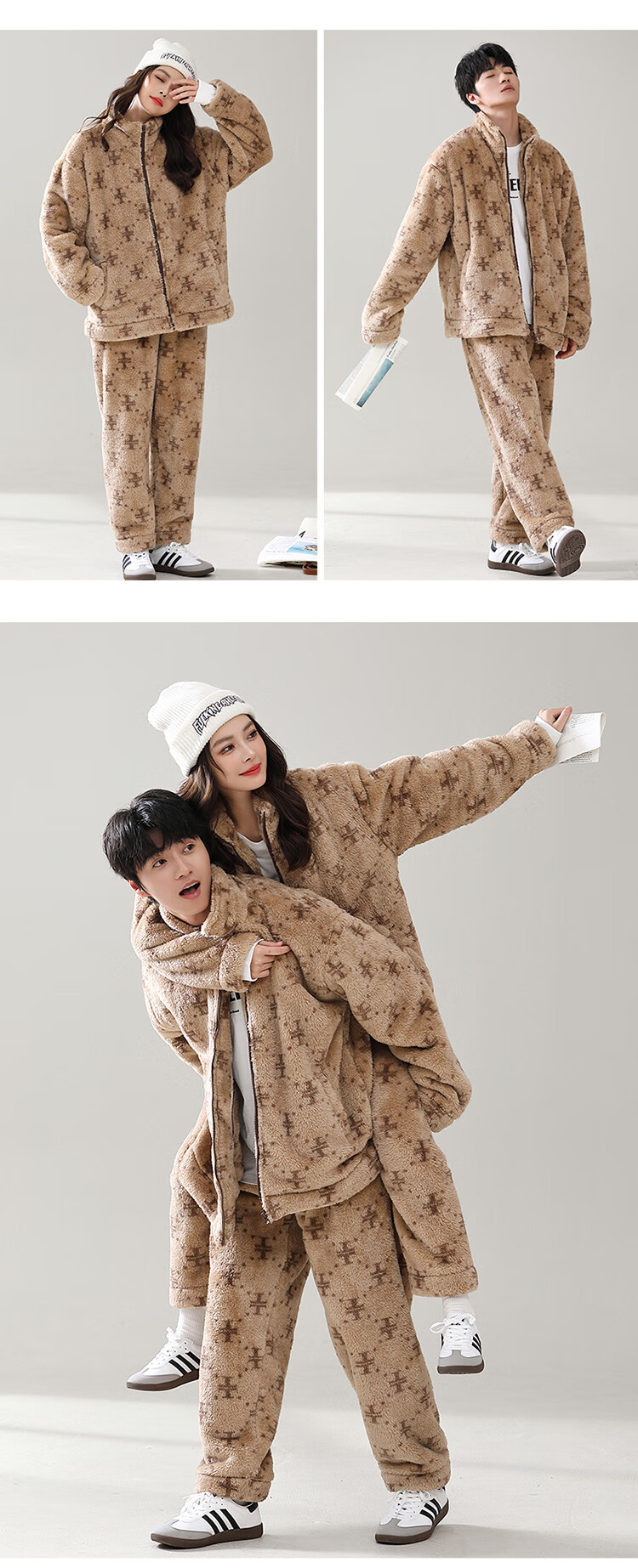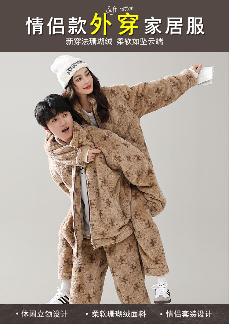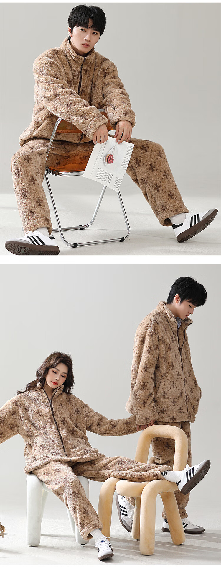 Tessgus Coral Velvet Pajamas Men's Winter Plus Velvet Thickened Suit Casual Large Size Couple Pajamas Flannel Women's Home Clothes Khaki - Men's L