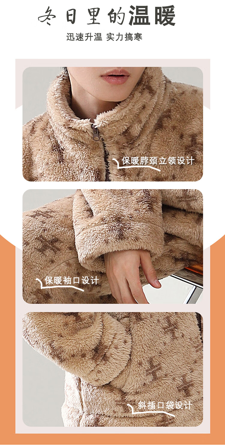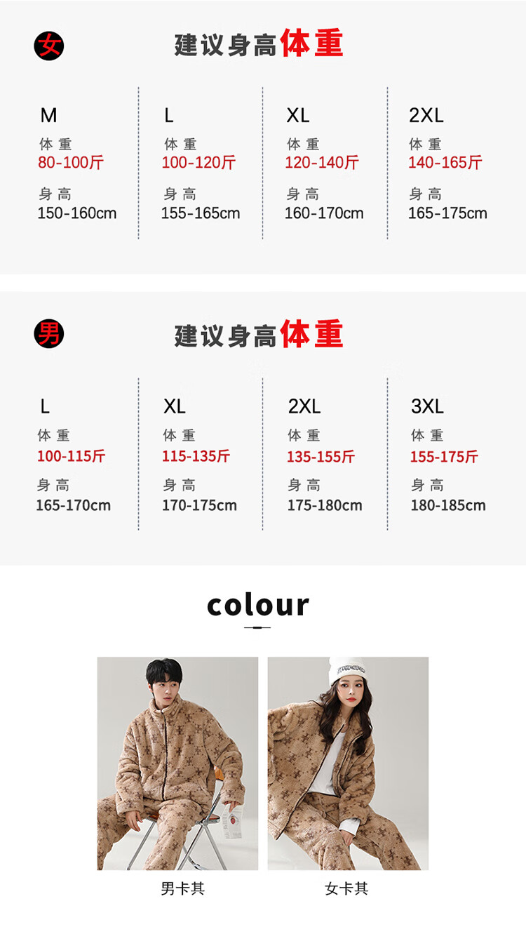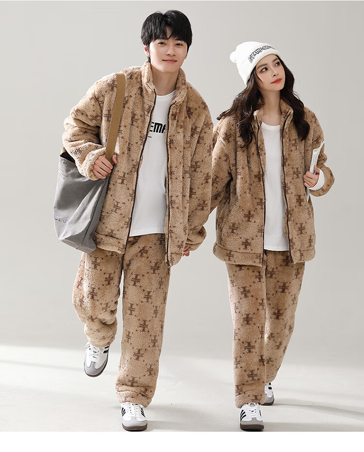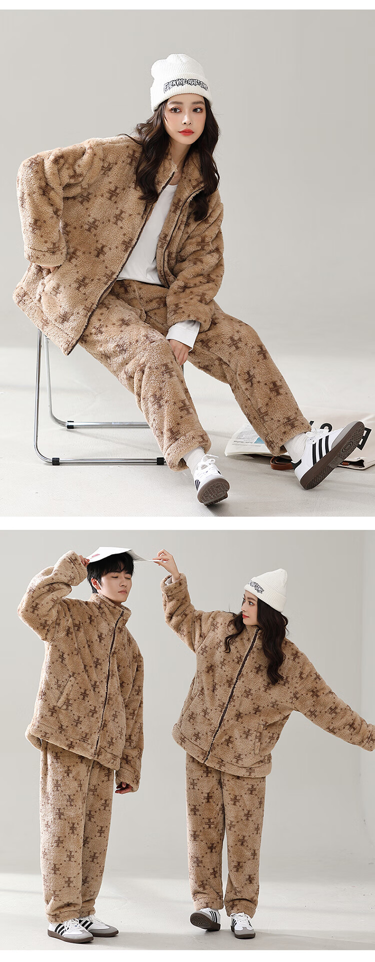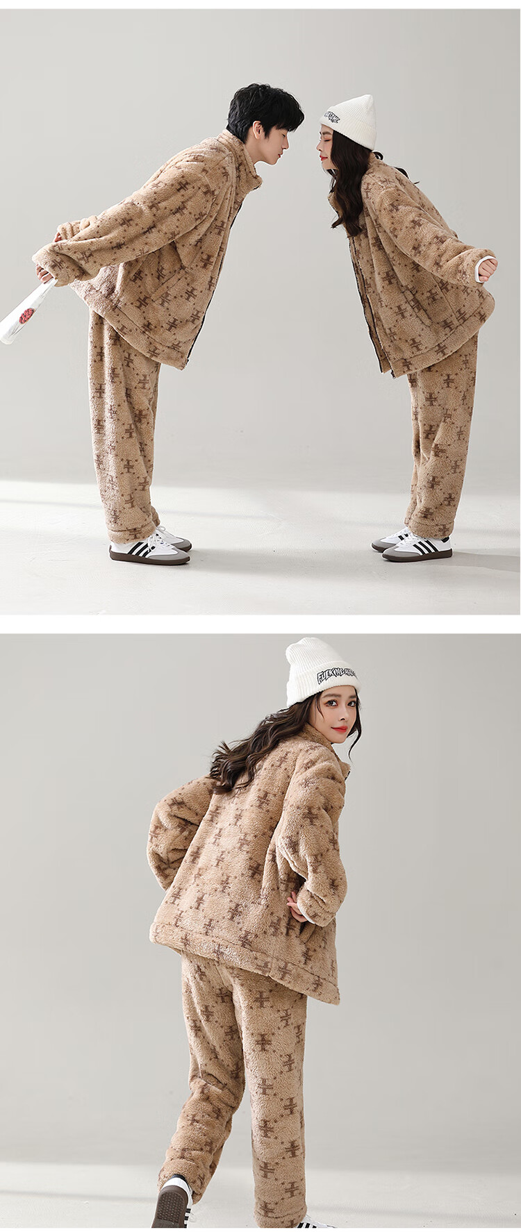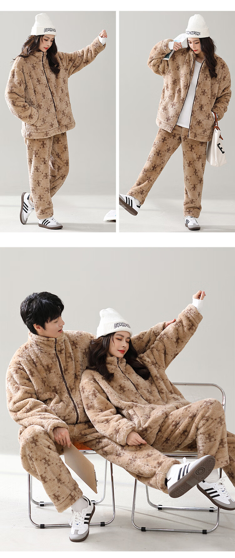 Tessgus Coral Velvet Pajamas Men's Winter Plus Velvet Thickened Suit Casual Large Size Couple Pajamas Flannel Women's Home Clothes Khaki - Men's L