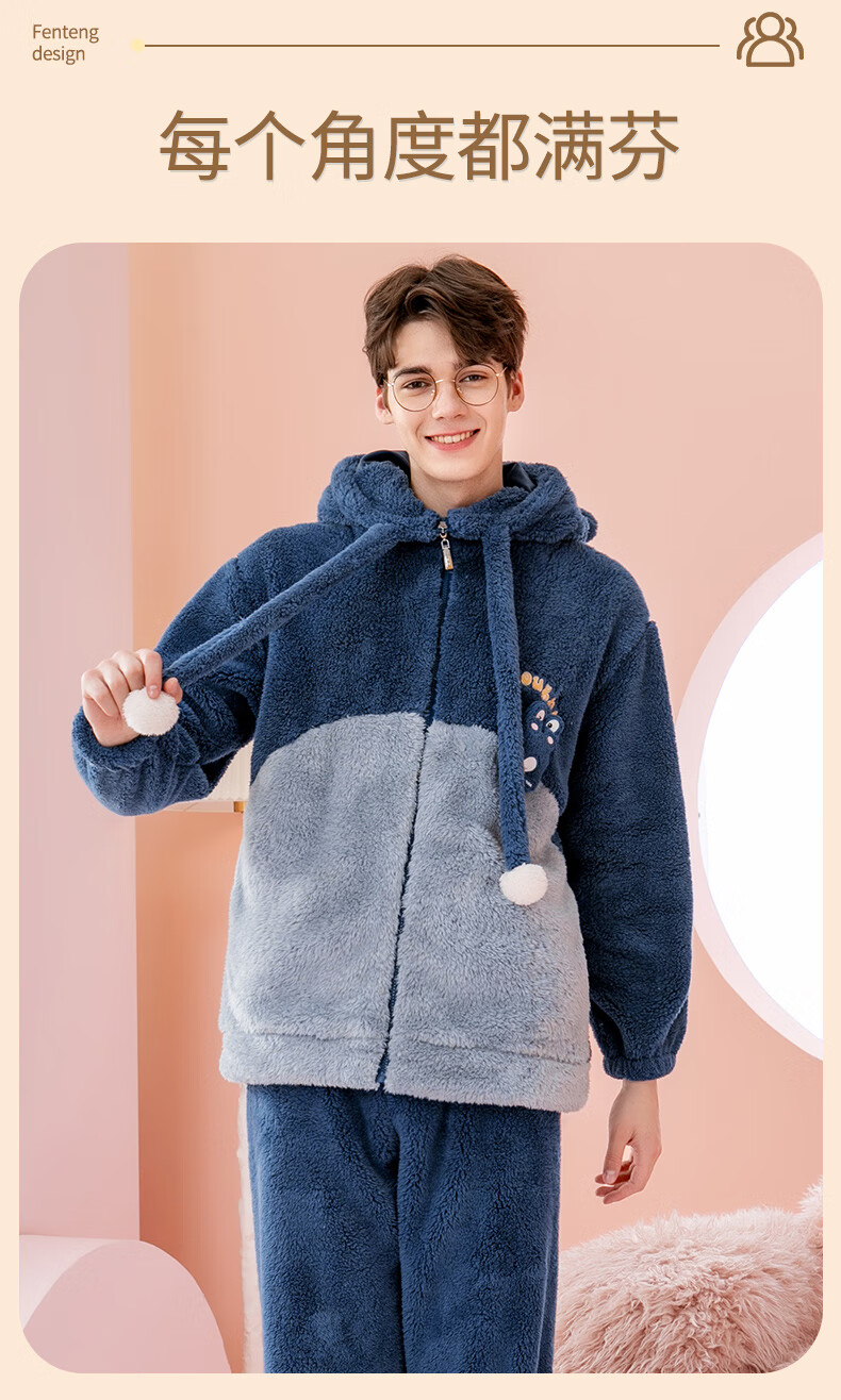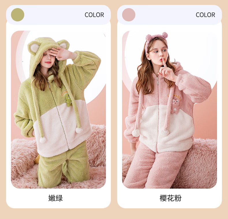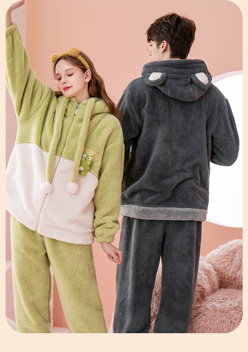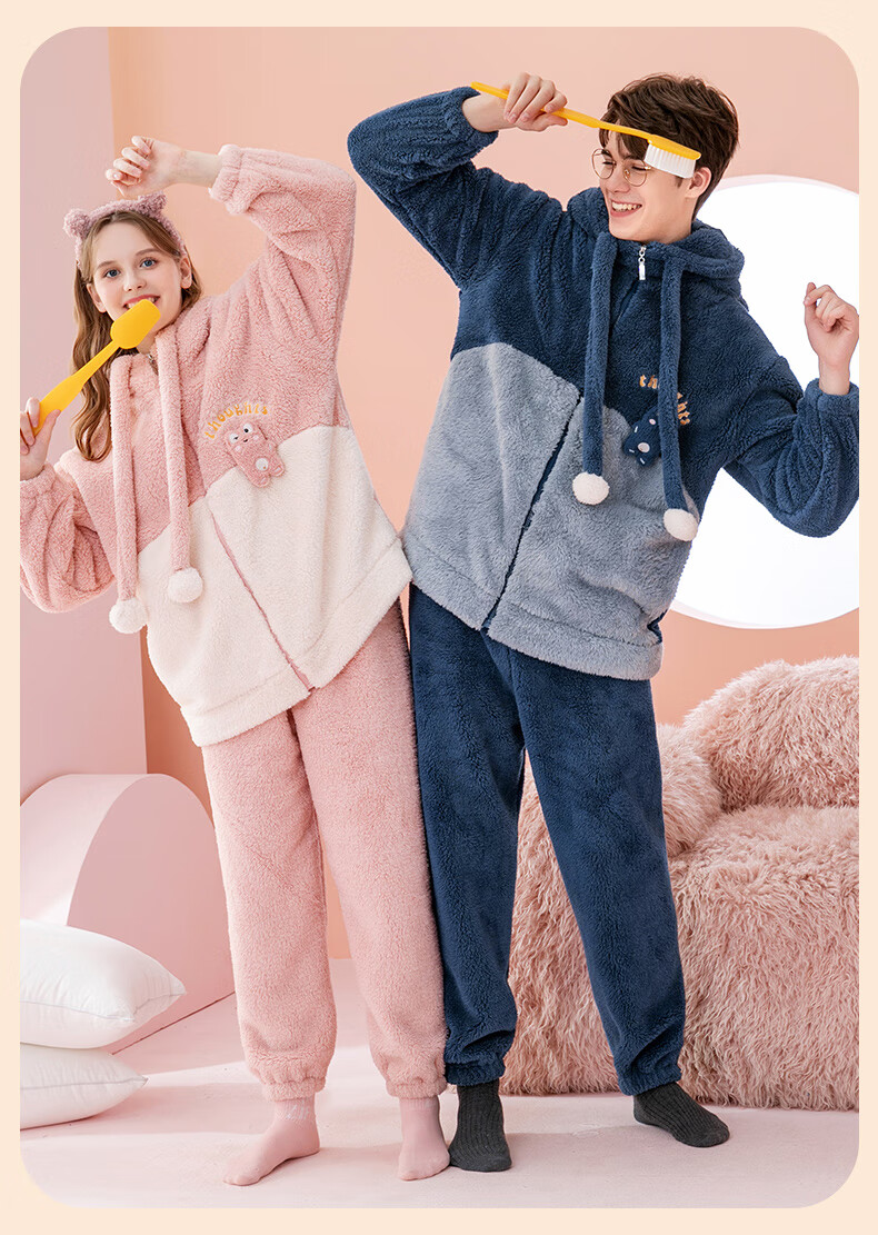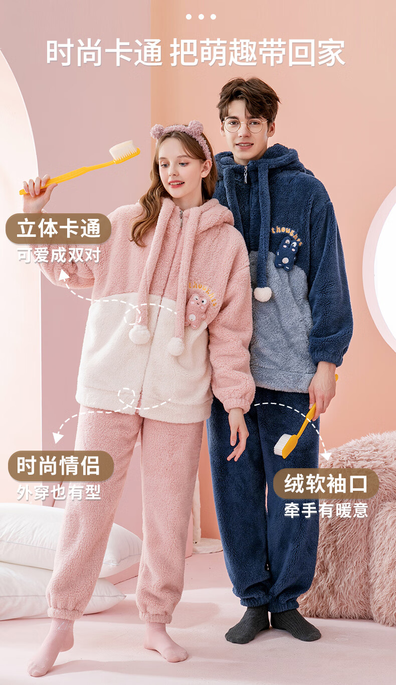 Fenten couple's pajamas autumn and winter thickened hooded coral velvet warm drawstring cartoon fashion home wear pajamas set cherry blossom pink (women's style) XL
