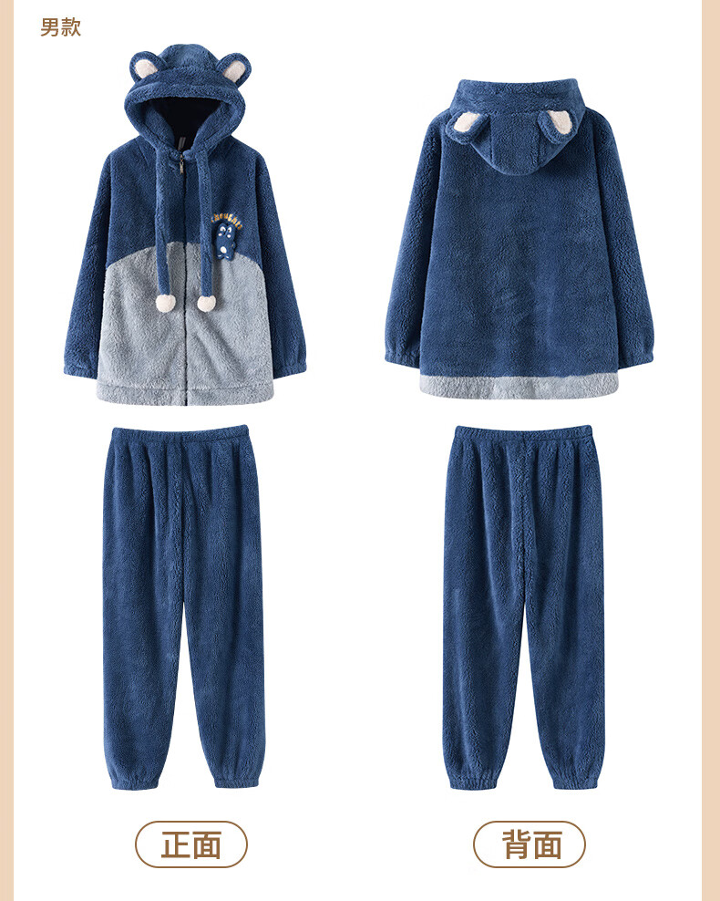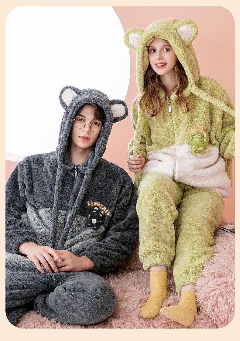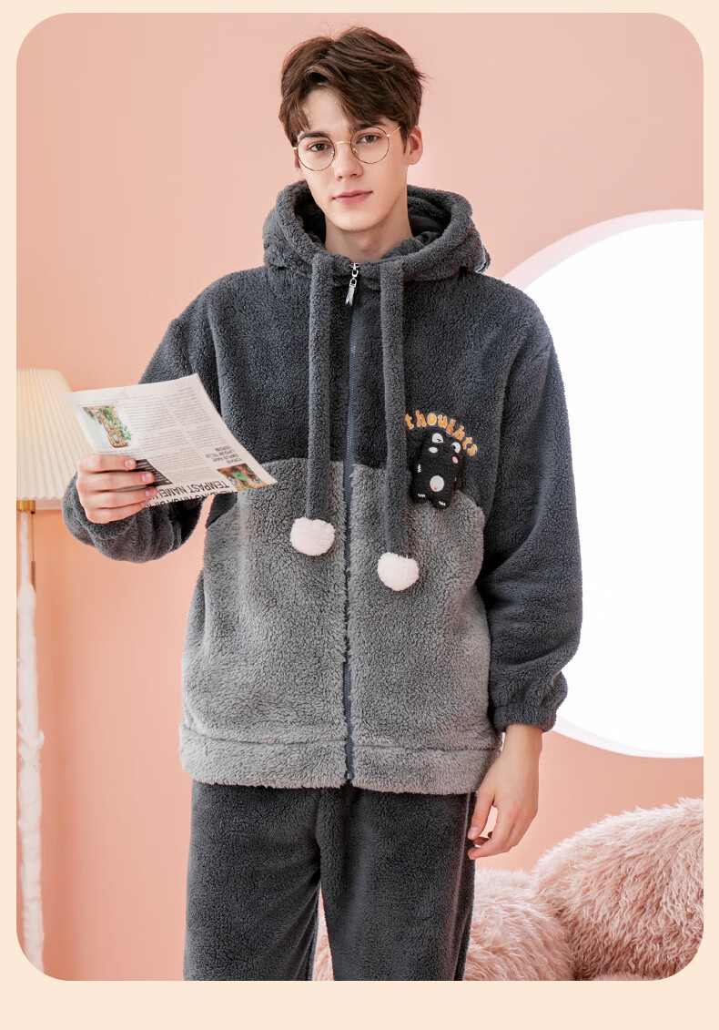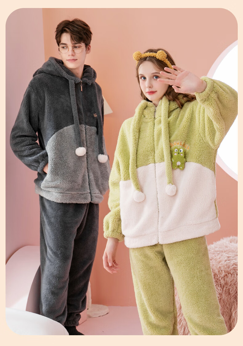 Fenten couple's pajamas autumn and winter thickened hooded coral velvet warm drawstring cartoon fashion home wear pajamas set cherry blossom pink (women's style) XL