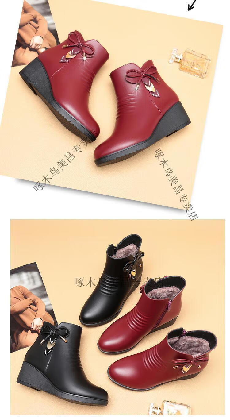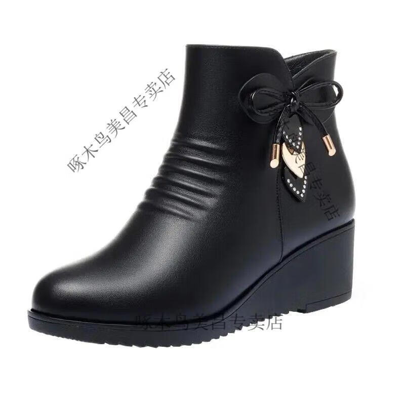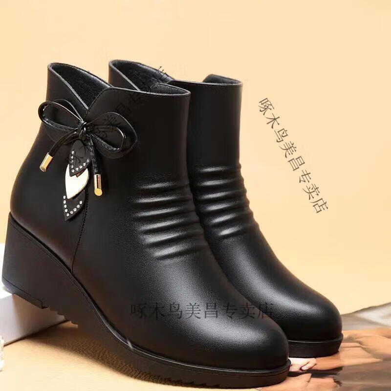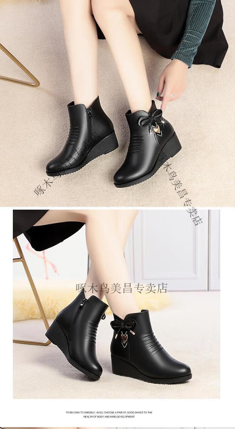 Woodpecker's new velvet cotton shoes for mothers, autumn and winter, middle-aged shoes, soft-soled short boots, wedge boots, leather shoes, velvet women's shoes, black 37