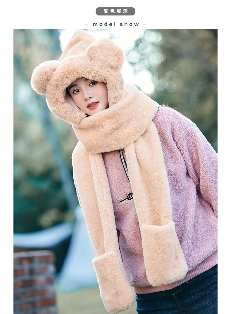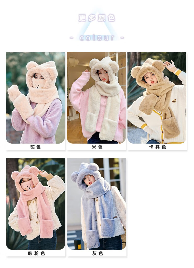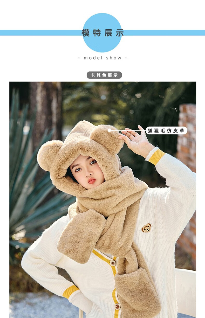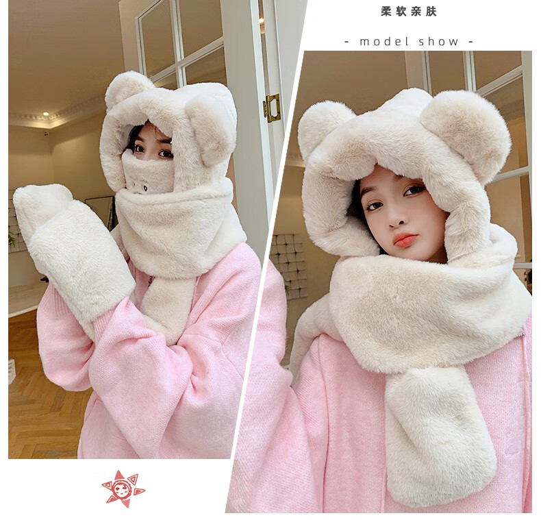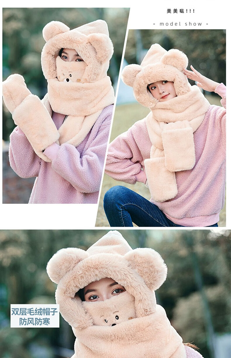 Pull back bear hat, scarf, gloves, one-piece women's winter cycling warm mask, neck scarf, four-piece set, hooded ear protection plus velvet, beige, one size fits all