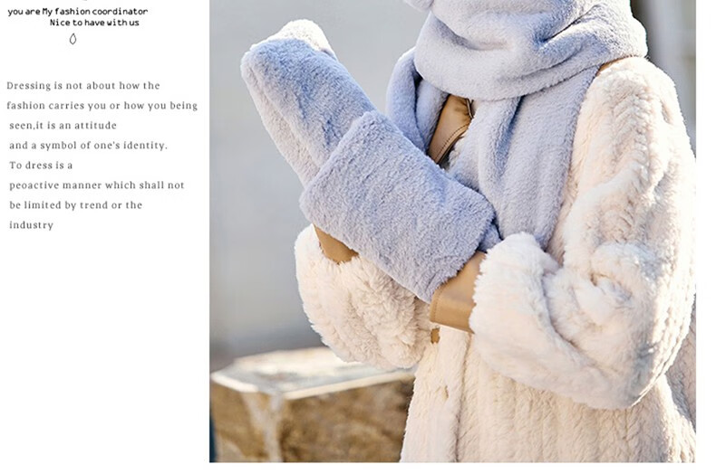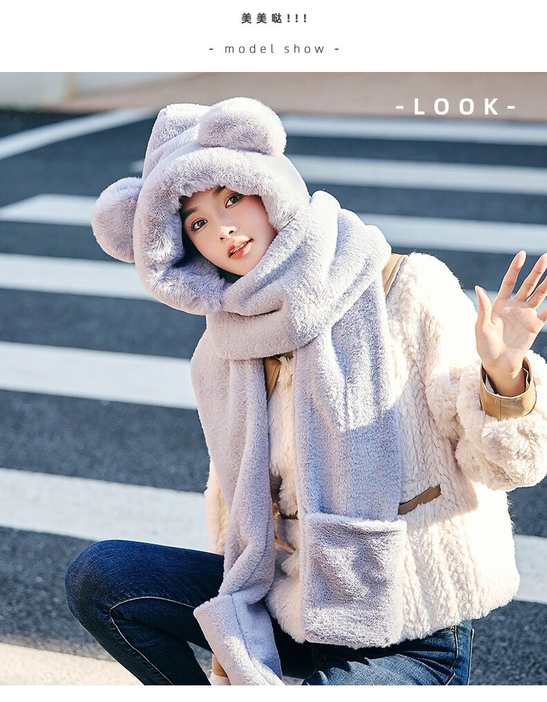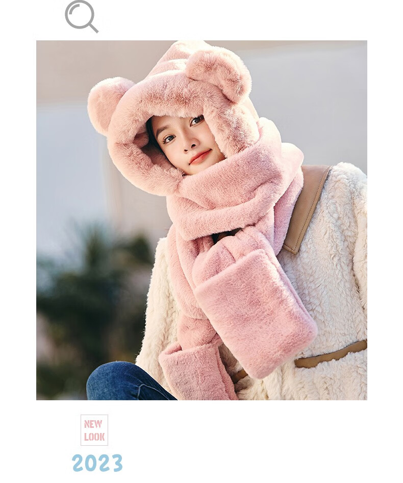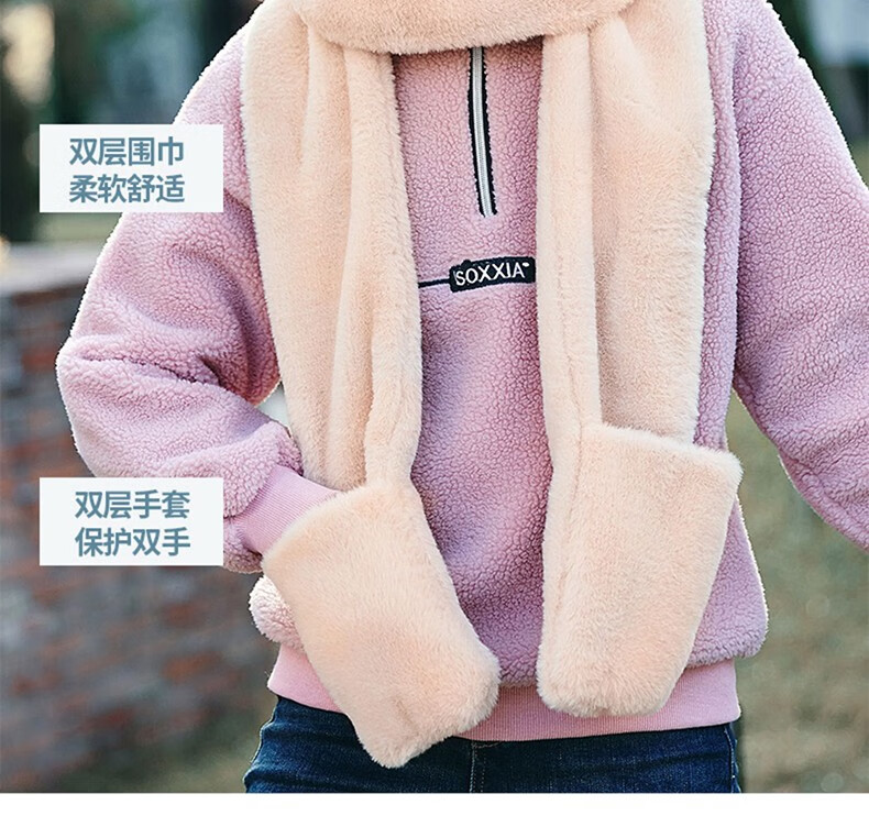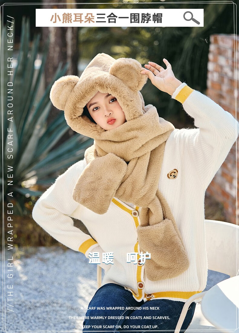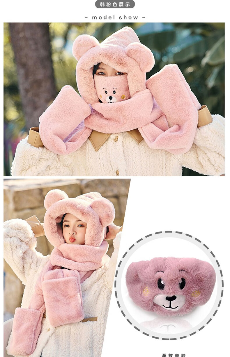 Pull back bear hat, scarf, gloves, one-piece women's winter cycling warm mask, neck scarf, four-piece set, hooded ear protection plus velvet, beige, one size fits all