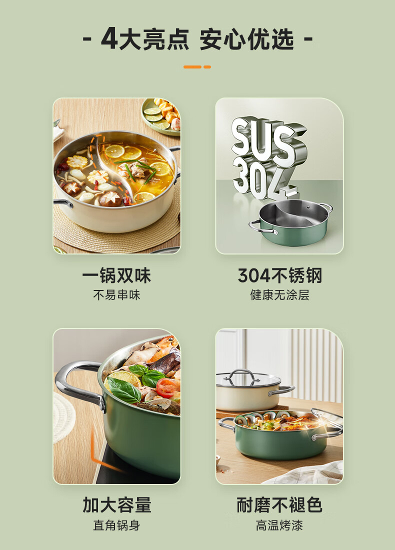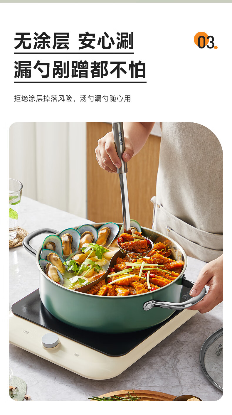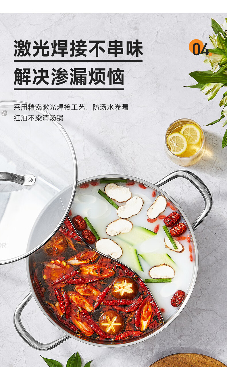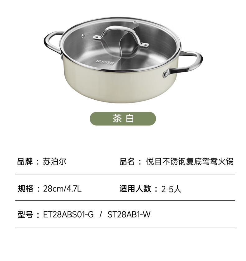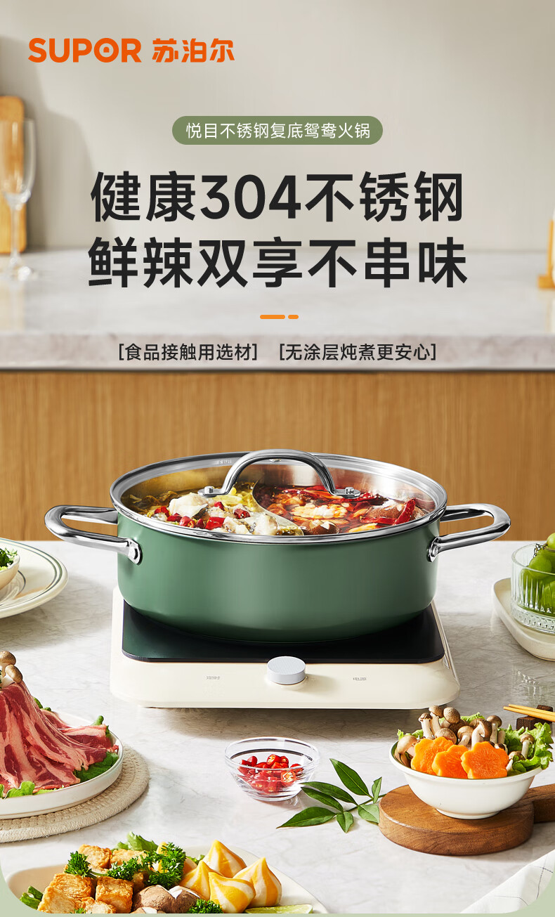 SUPOR hot pot 304 stainless steel mandarin duck pot double bottom thickened soup pot household easy-to-clean mutton open flame induction cooker universal ST28AB1-W mandarin duck pot white 28cm