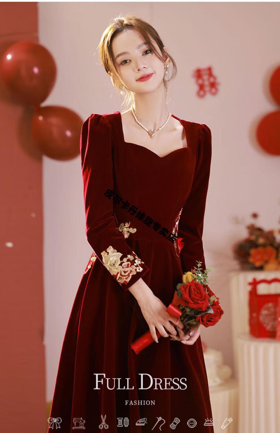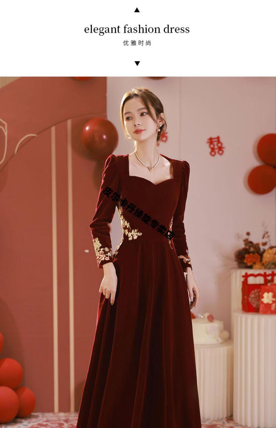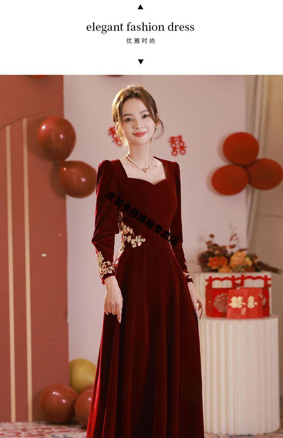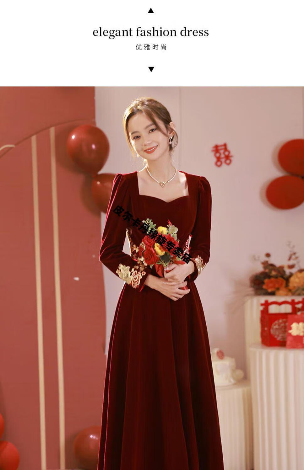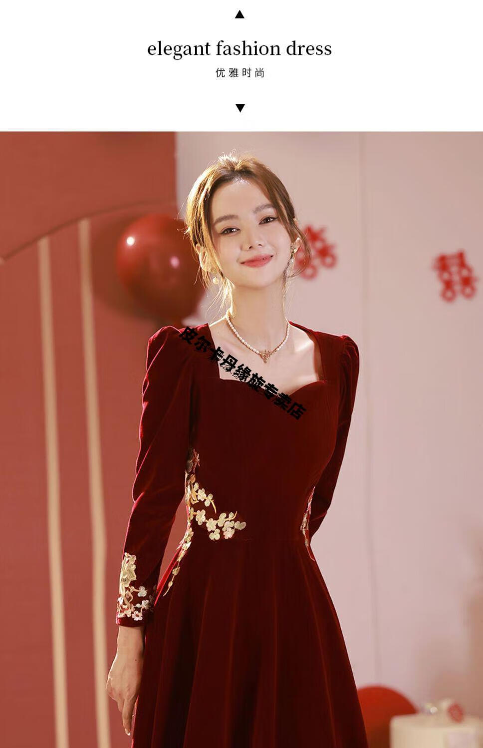 Pierre Cardin 23 New Toast Wear Bridal Red Wedding Winter High-end Velvet Engagement Dress Long Sleeve Autumn and Winter Women Burgundy L