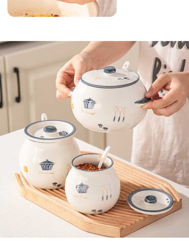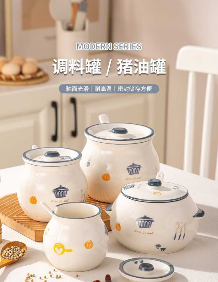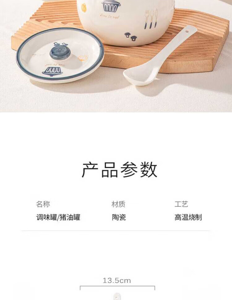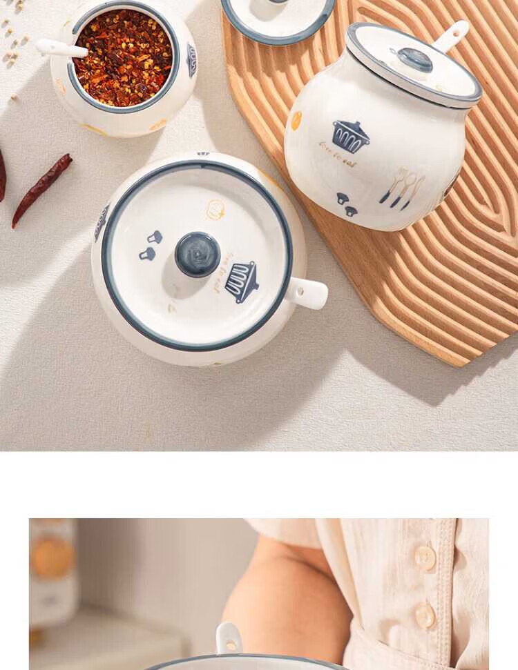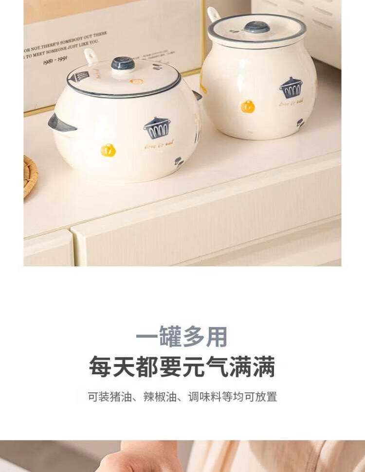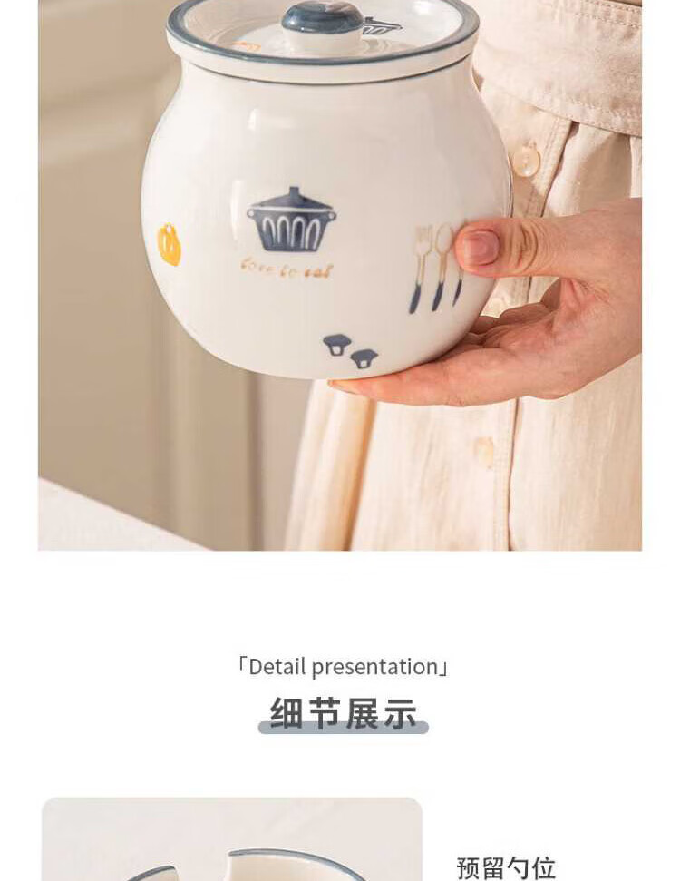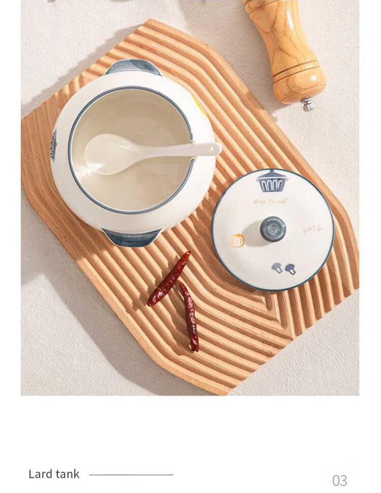 Man丂 double-eared lard jar with spoon large capacity 1.5L high temperature resistant and anti-scalding seasoning jar ceramic lard jar kitchen seasoning jar double-eared large lard jar with spoon white and blue
