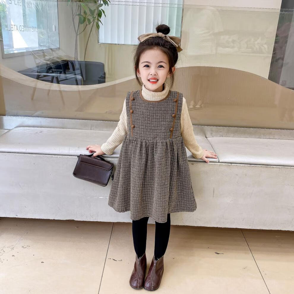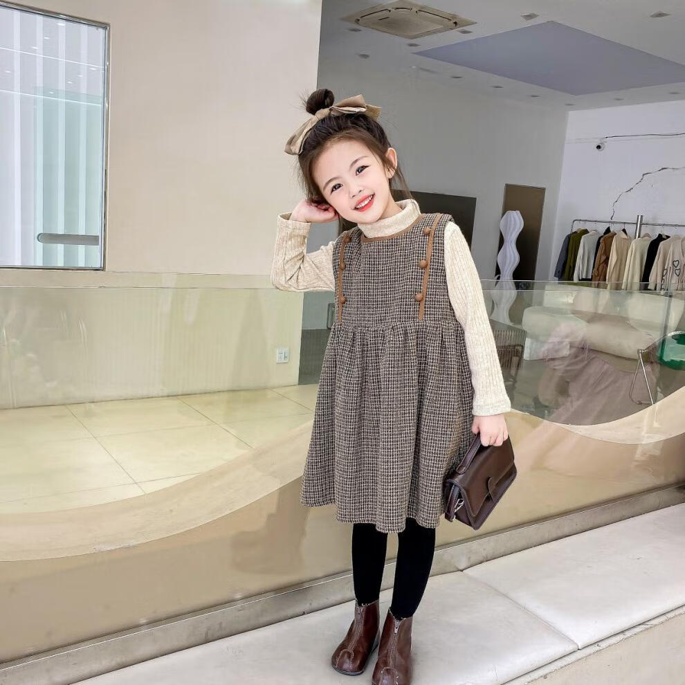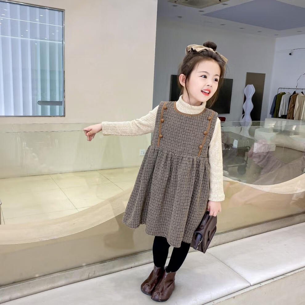 G.duck2025 New Children's Clothing Autumn and Winter Girls' Velvet Plaid Suspender Skirt Female Baby Western-style Tank Top Skirt Children's Skirt Skirt + Sweater Suit 120 cm Recommended height is about 110 cm