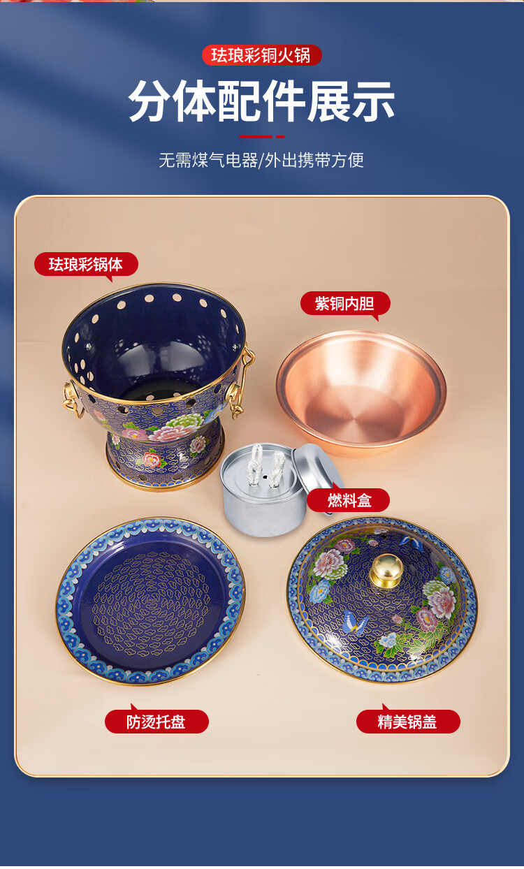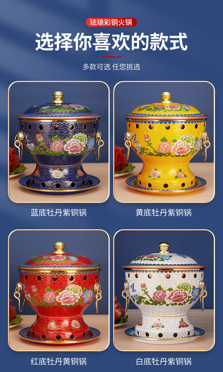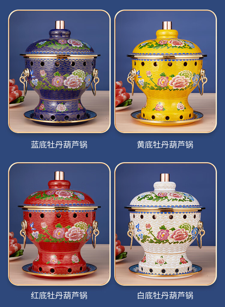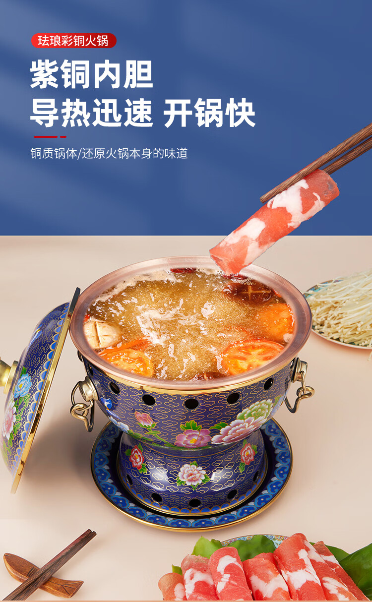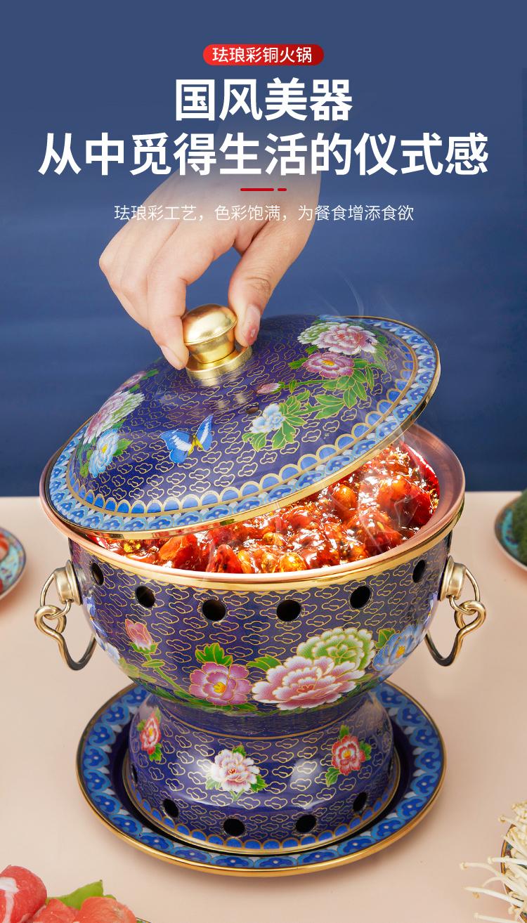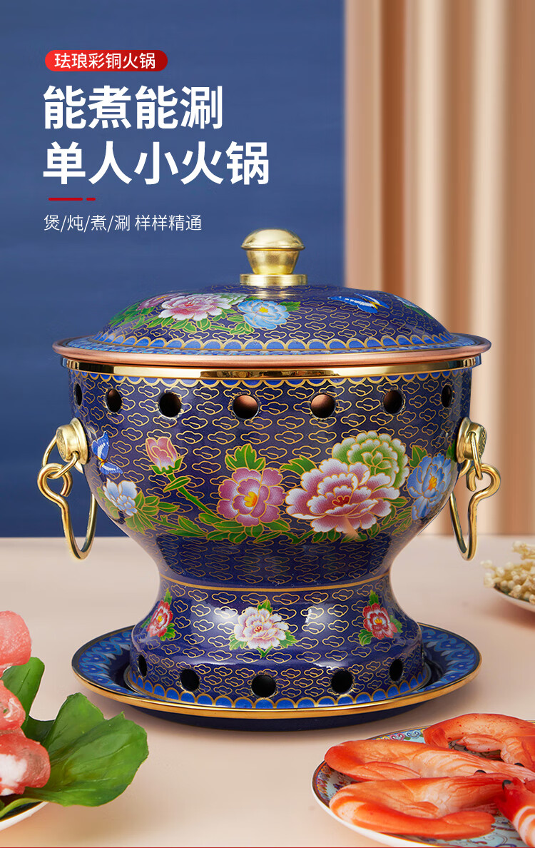Cloisonné copper hot pot, single household alcohol stove, enamel hot pot, small hot pot, one person, one pot, pure copper alcohol copper pot, extra thick blue bottom peony style (304 inner pot)