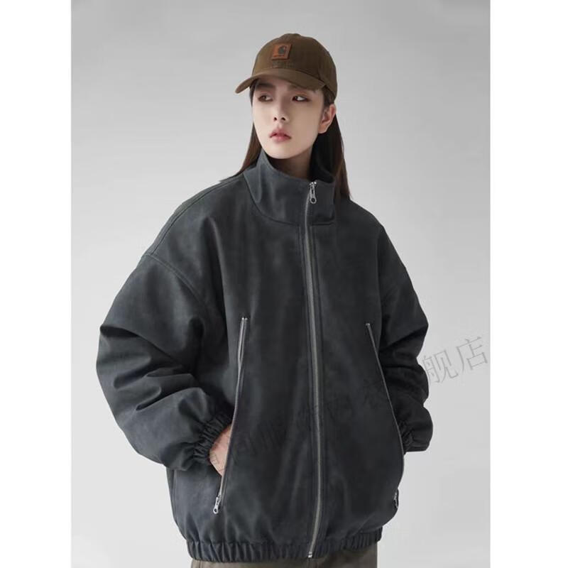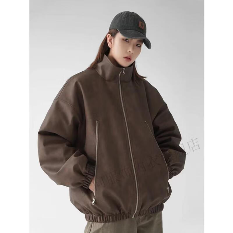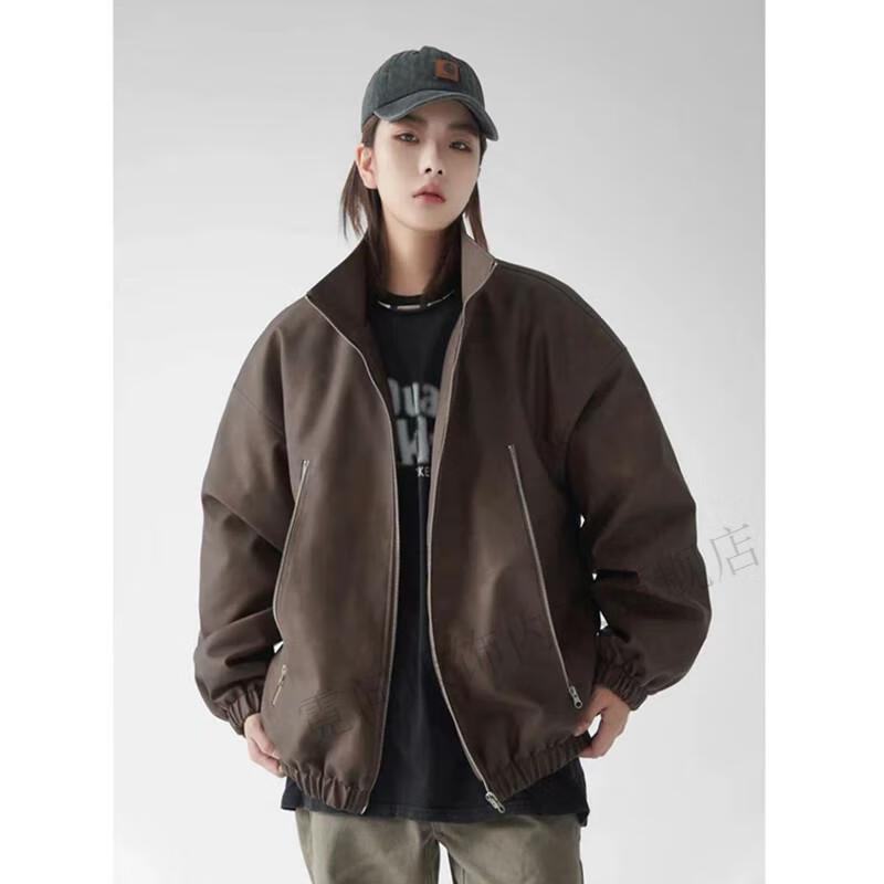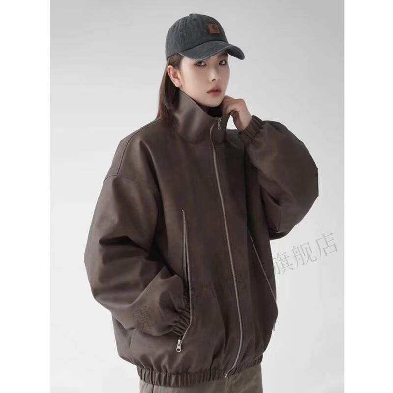 Niwen DUAB washed distressed PU leather stand-collar jacket American motorcycle quilted leather jacket oversize couple jacket men and women brown M