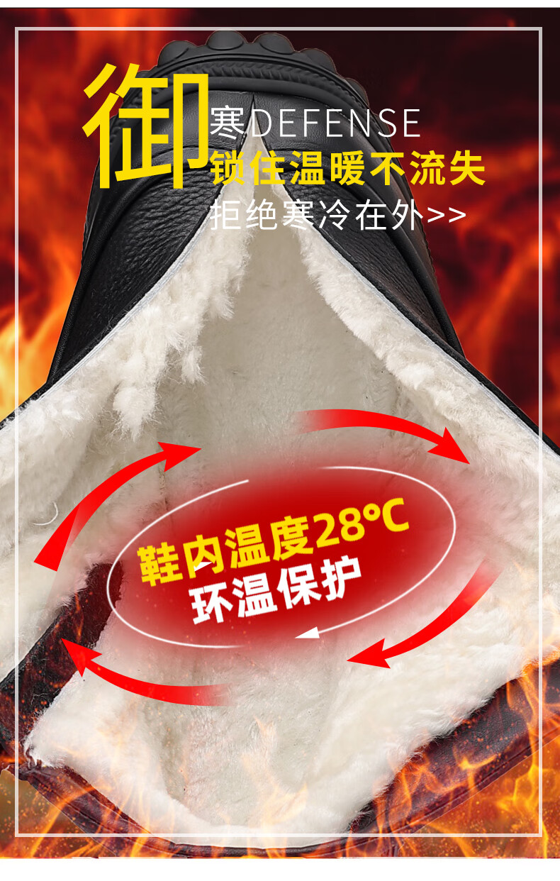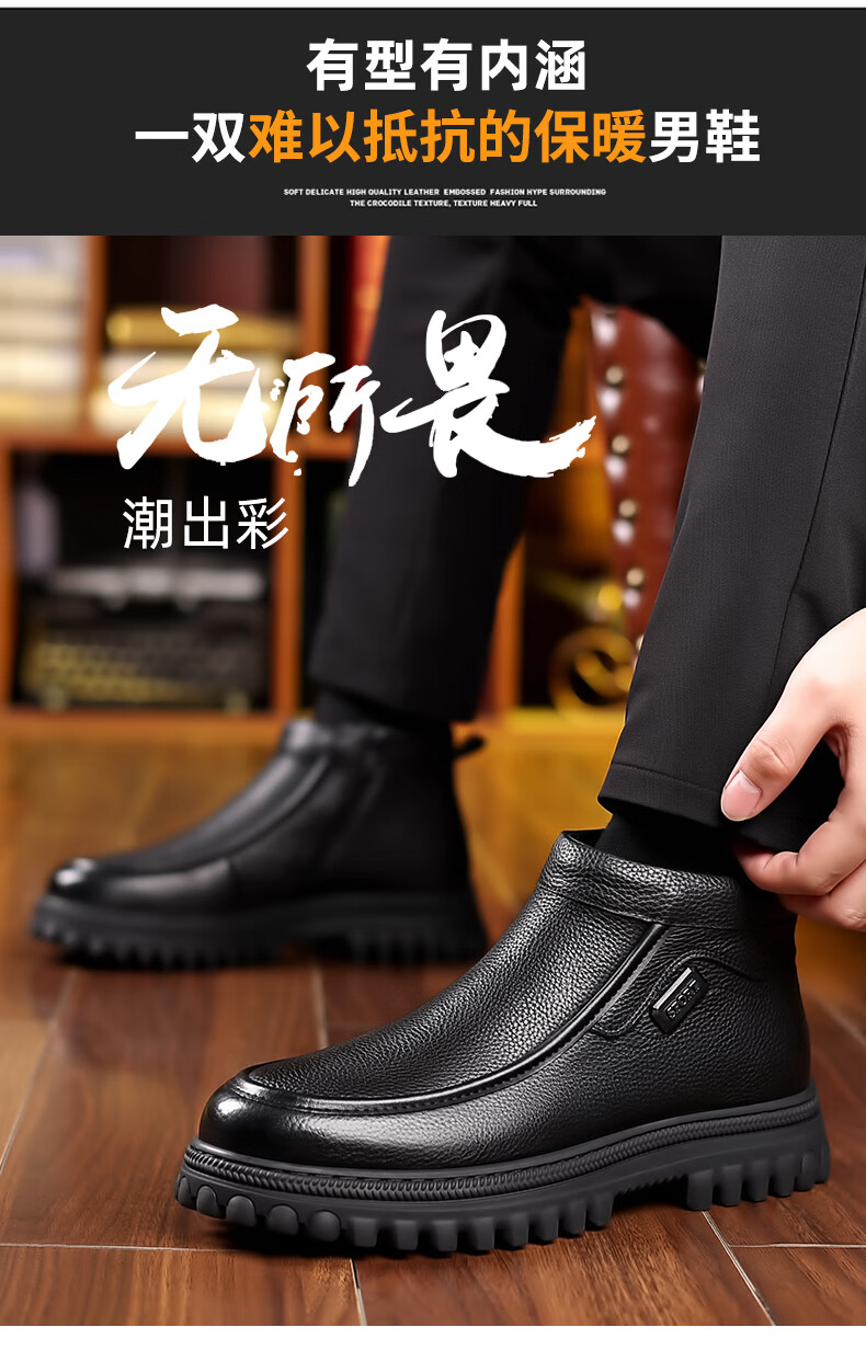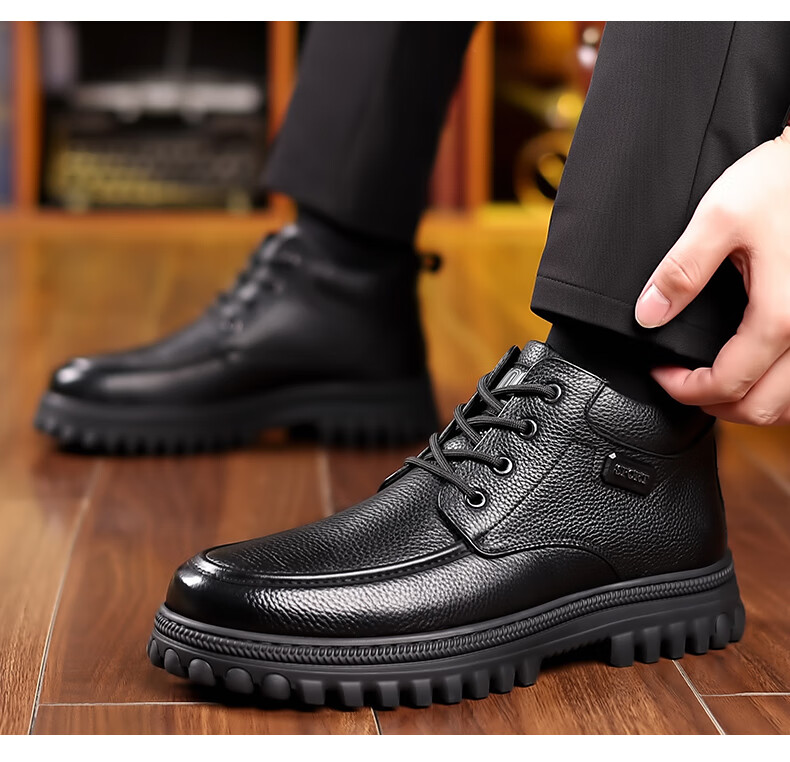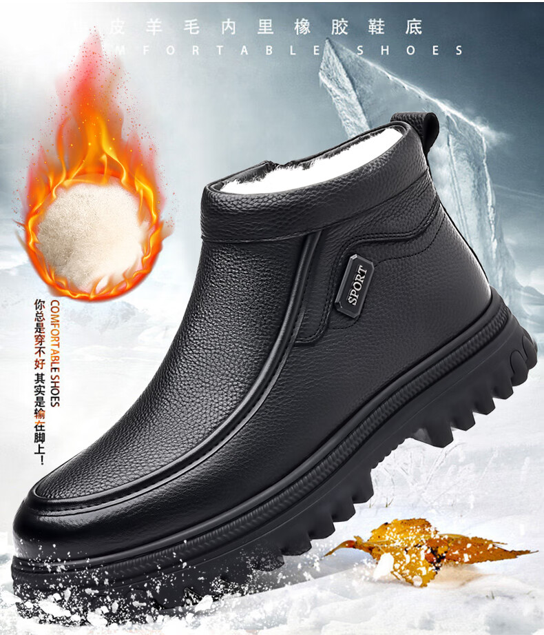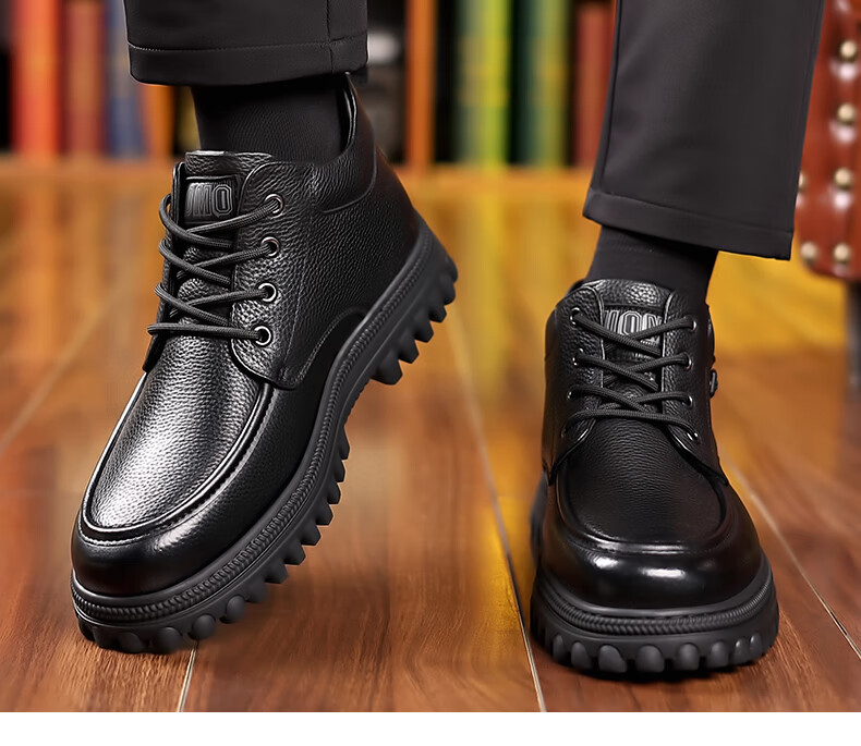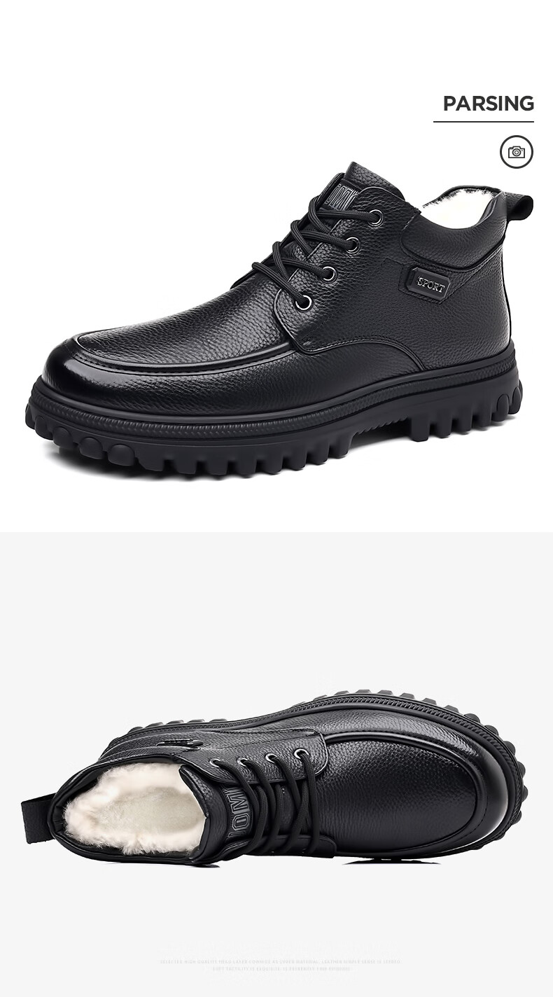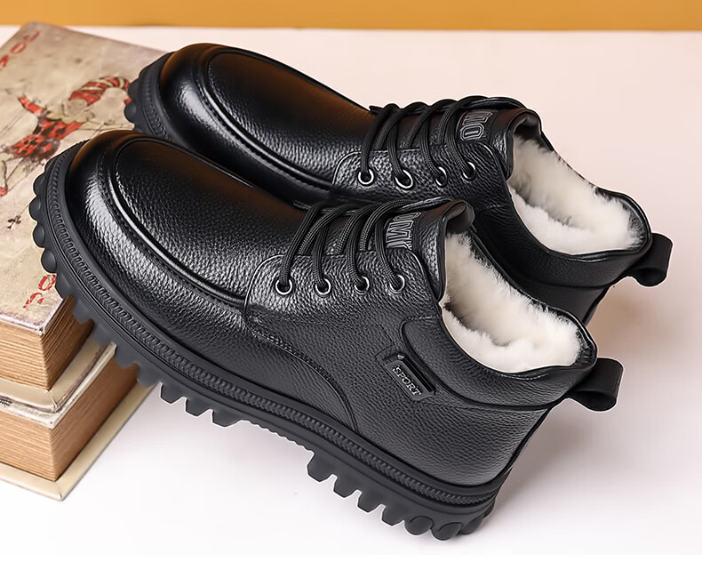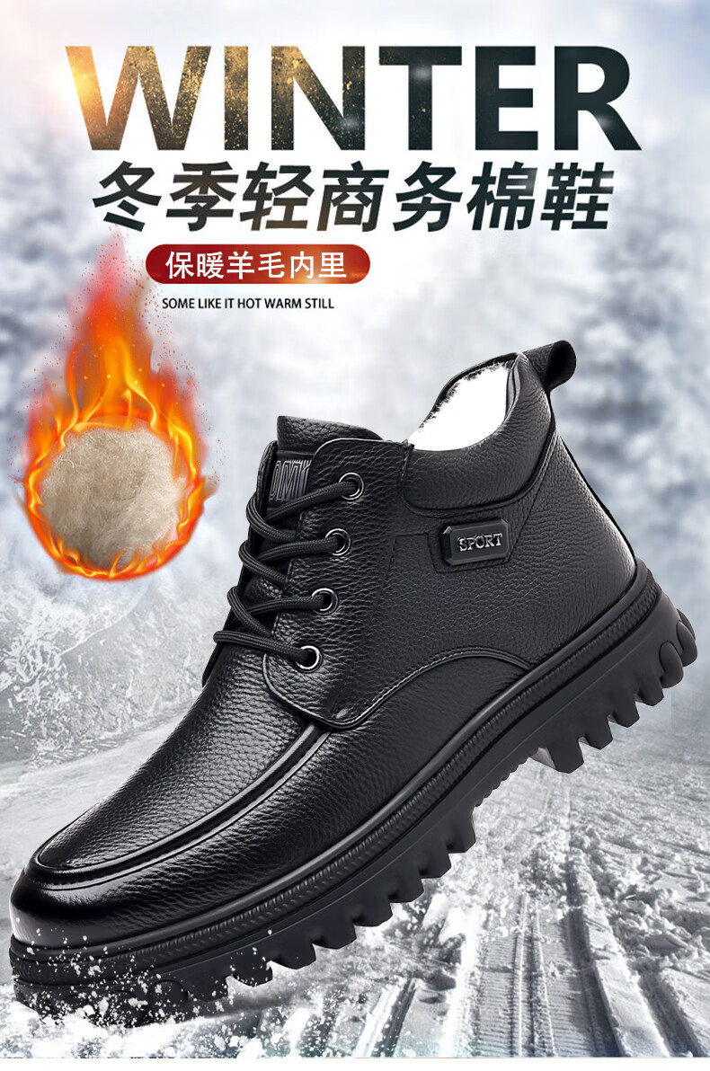 Woodpecker head-layer cowhide wool-lined high-top large cotton shoes formal leather shoes for men plus velvet casual warm middle-aged and elderly dad shoes black lace 41 (standard leather shoe size)
