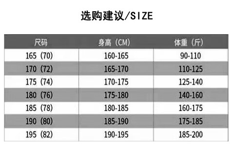 China (cm) 165 / 88-90 170 / 96-98 175 / 108-110 180 / 118-122 185 / 126-130