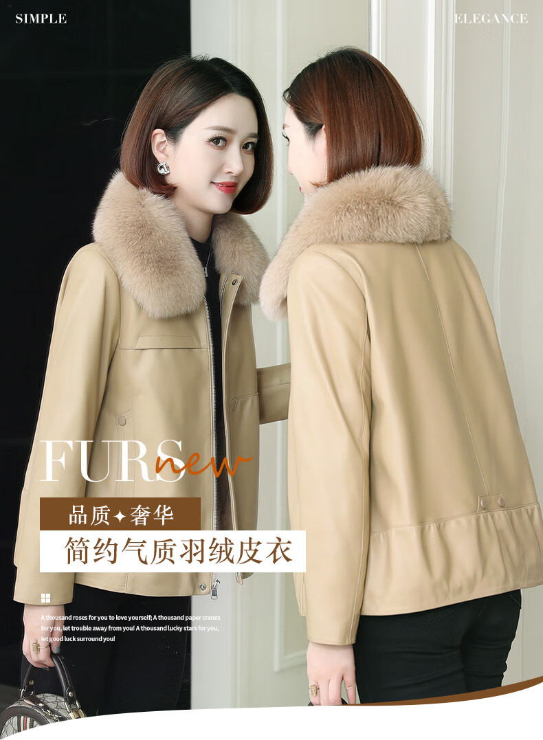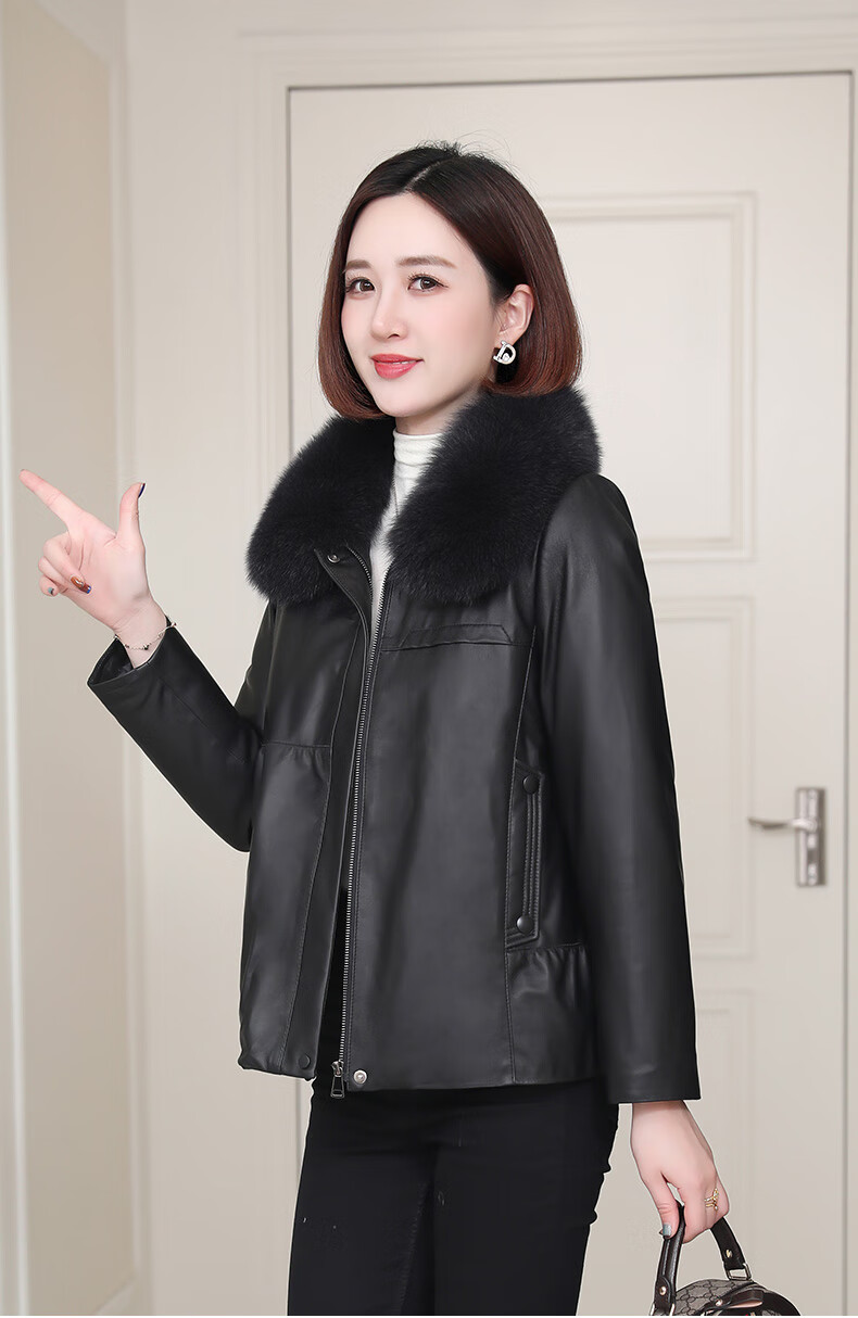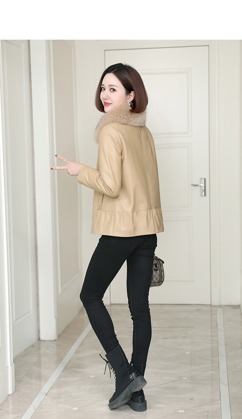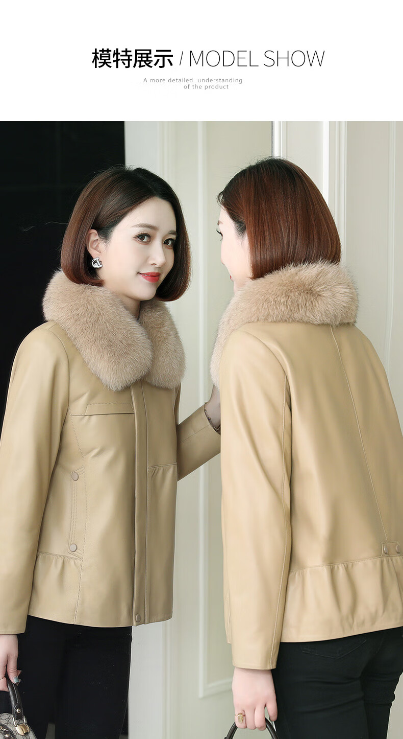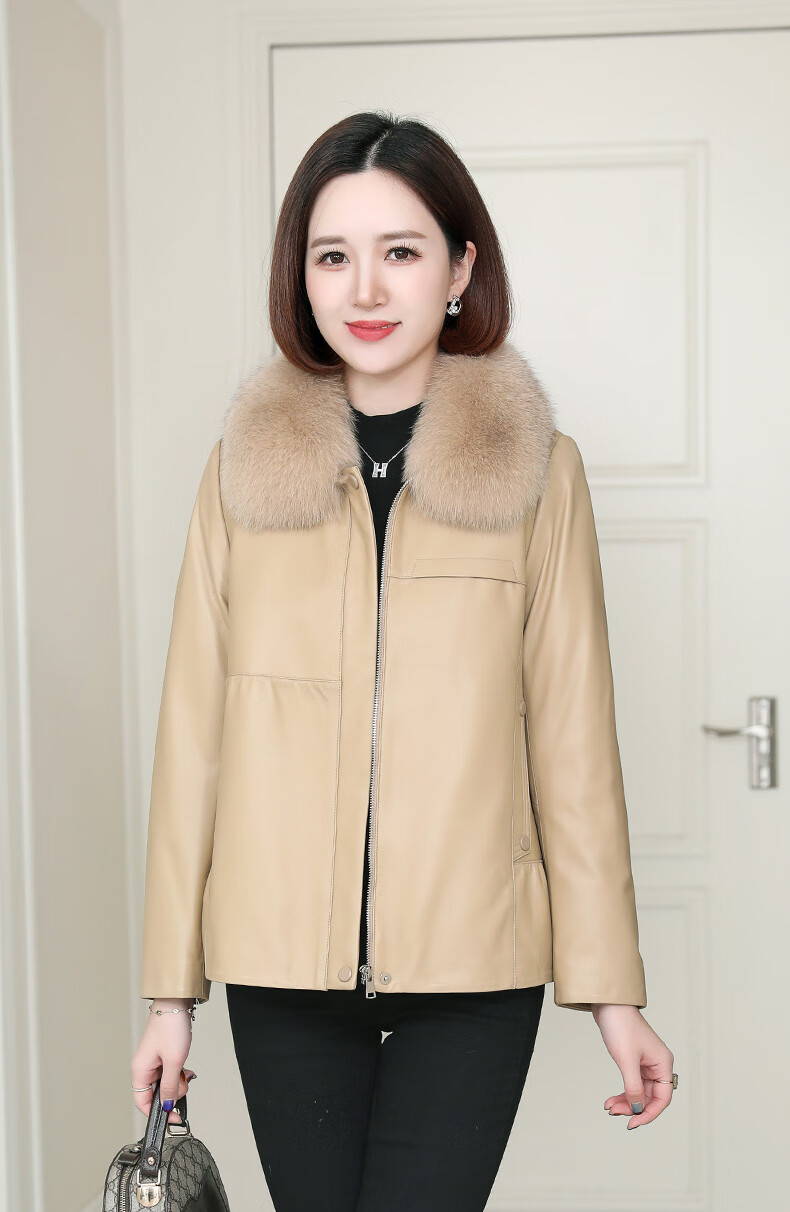 Lingfaner Haining genuine leather down jacket for women winter new fashion sheepskin jacket fox fur collar short leather jacket khaki L