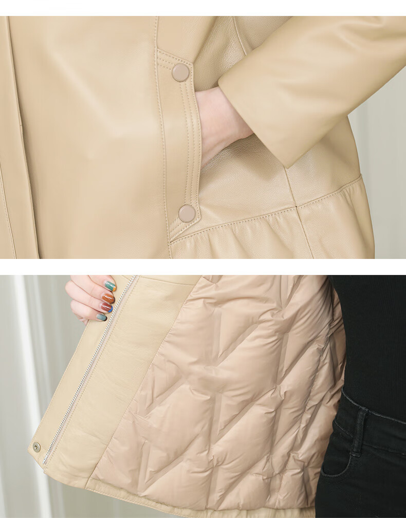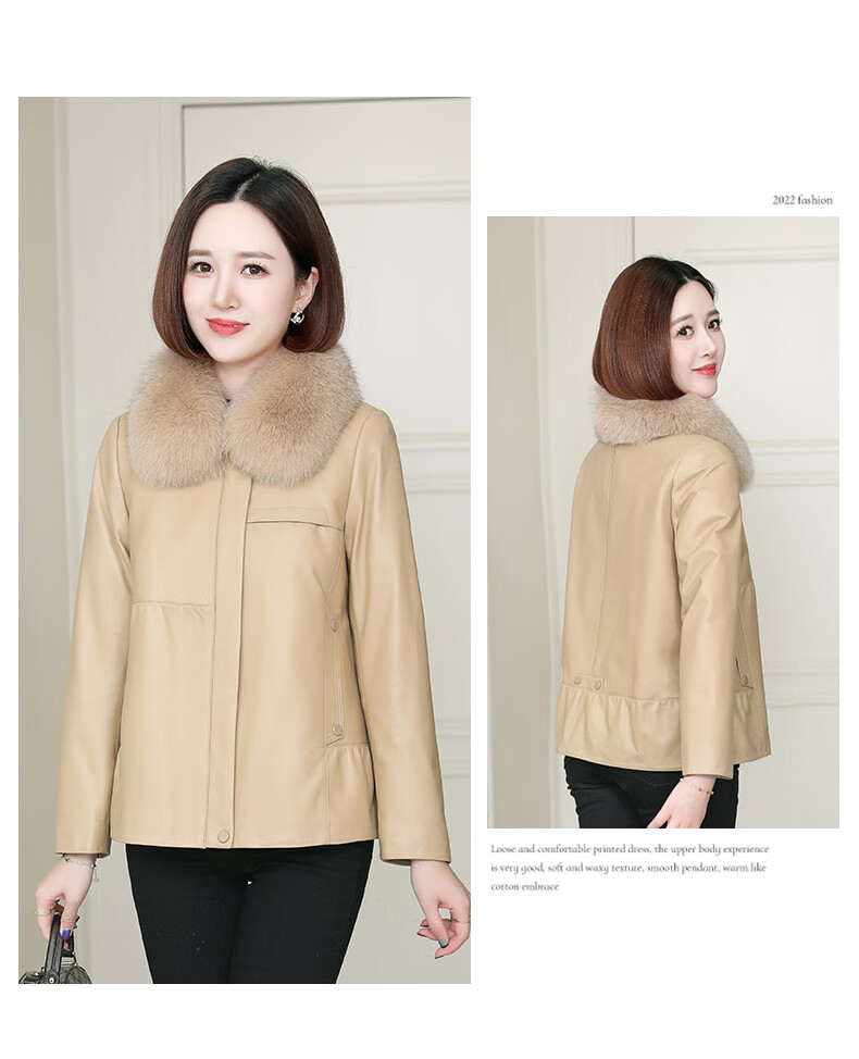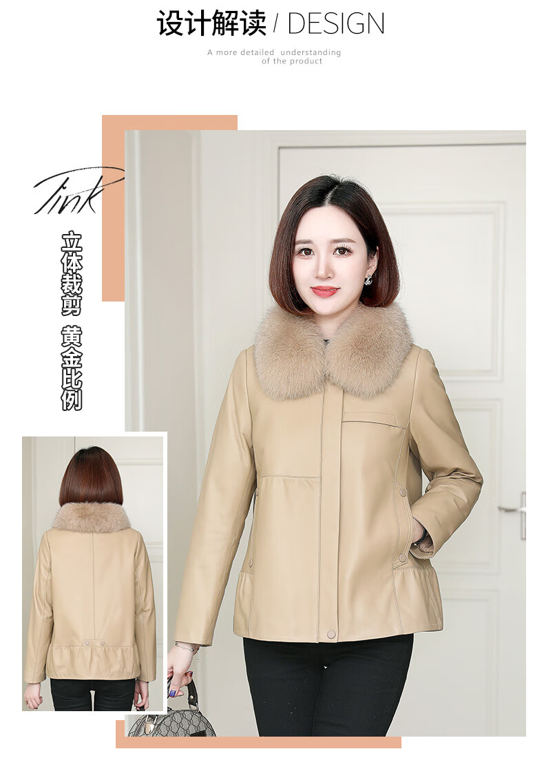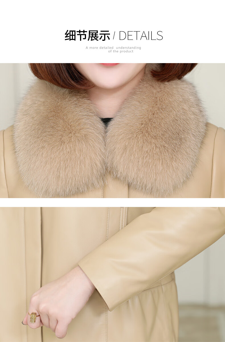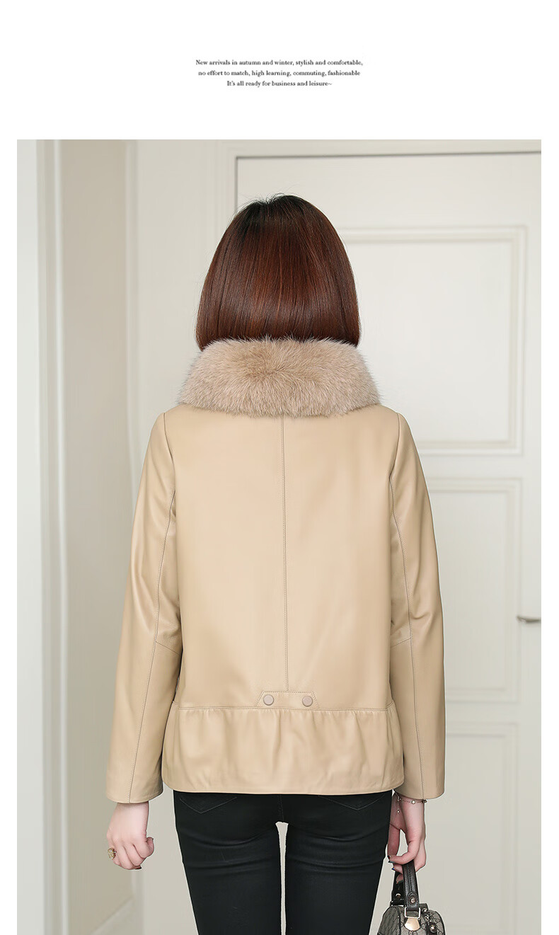 Lingfaner Haining genuine leather down jacket for women winter new fashion sheepskin jacket fox fur collar short leather jacket khaki L