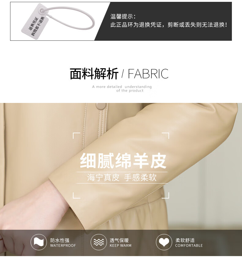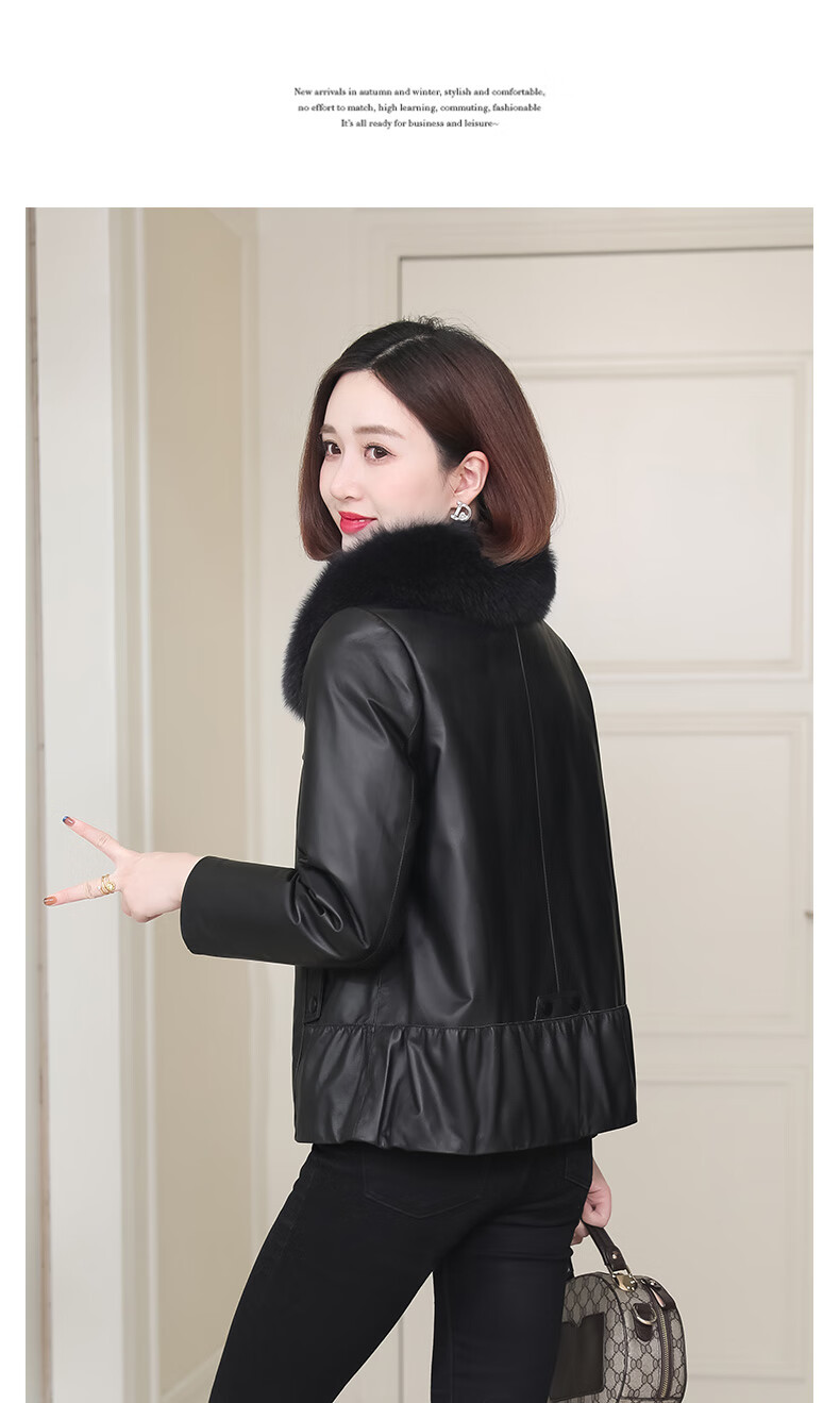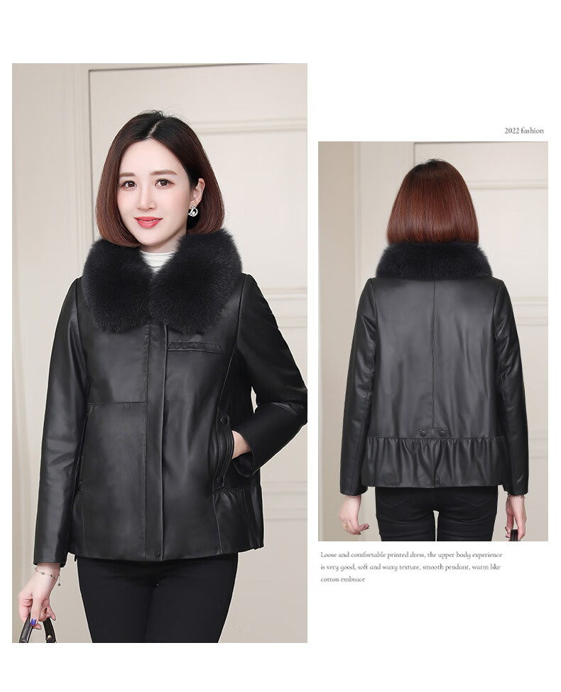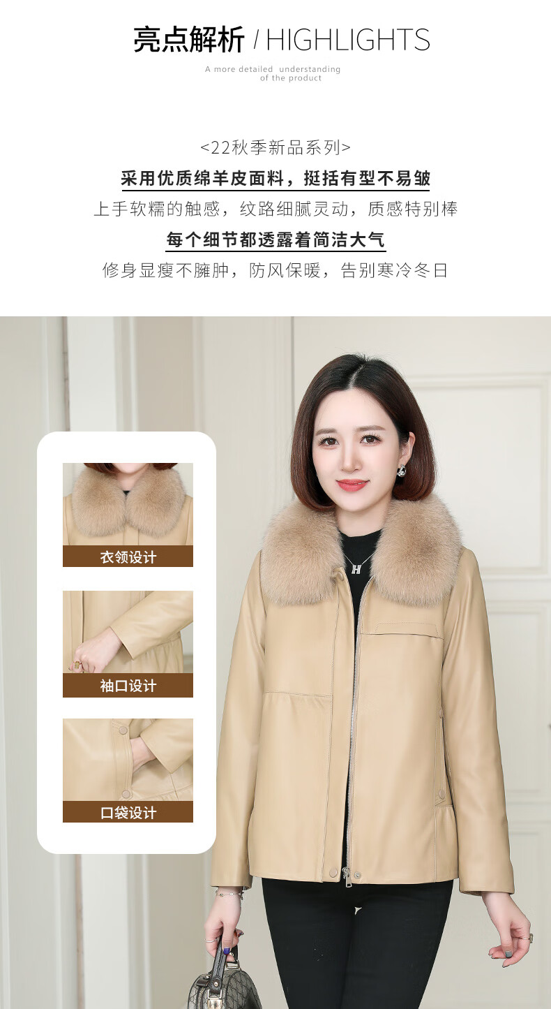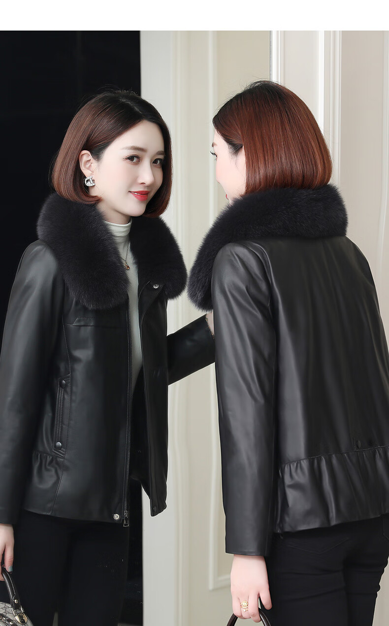 Lingfaner Haining genuine leather down jacket for women winter new fashion sheepskin jacket fox fur collar short leather jacket khaki L
