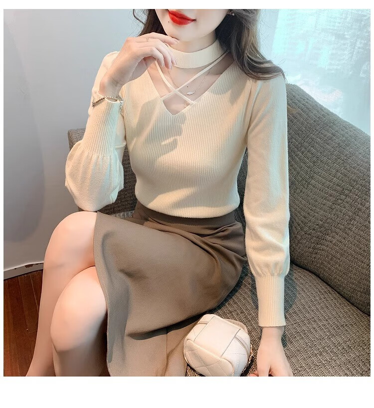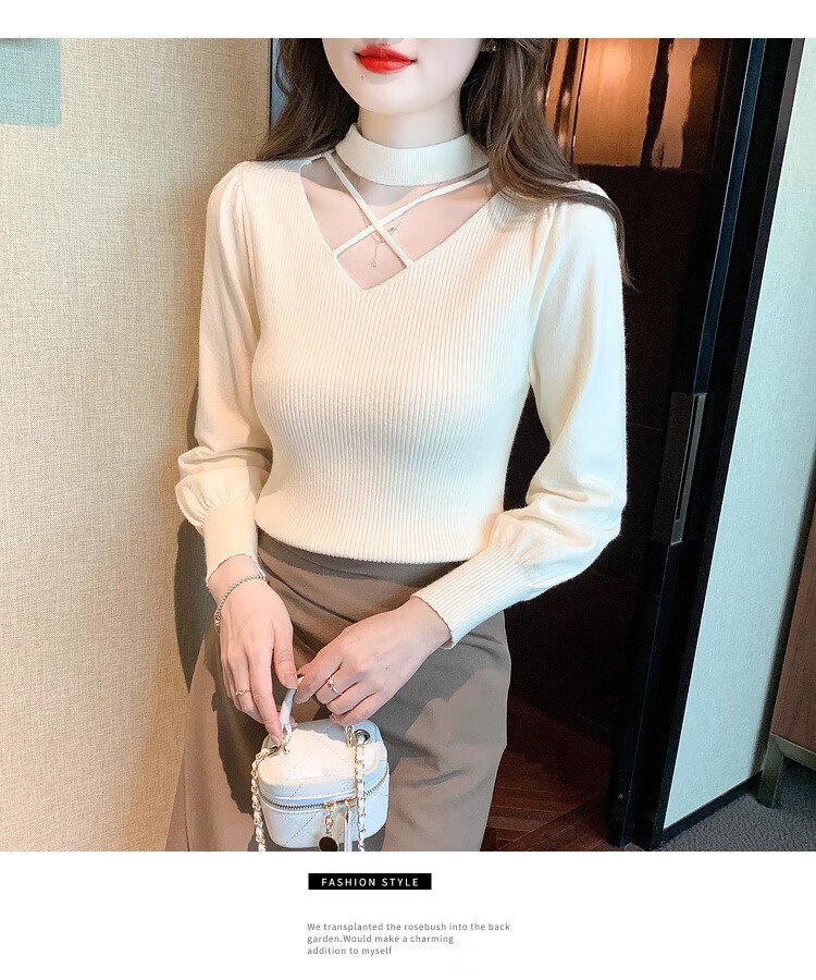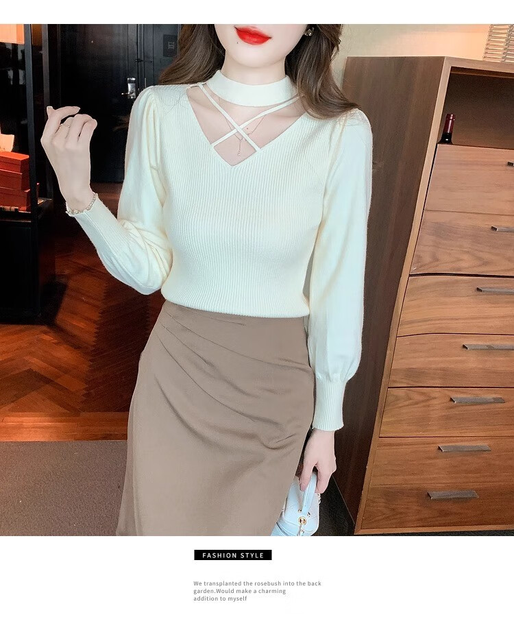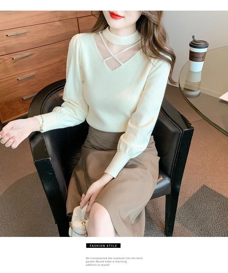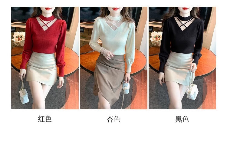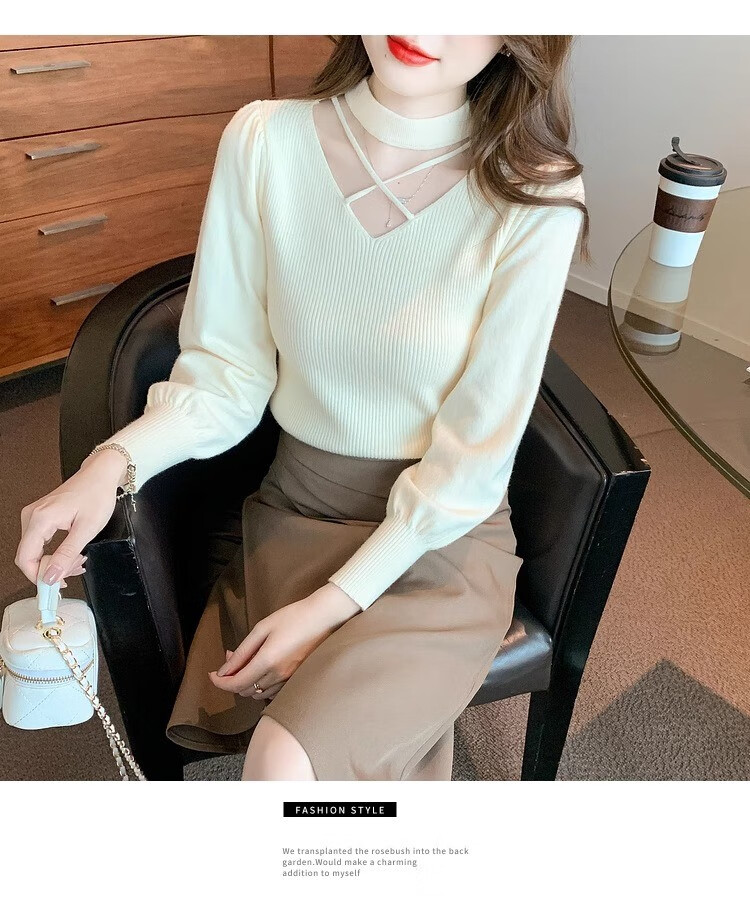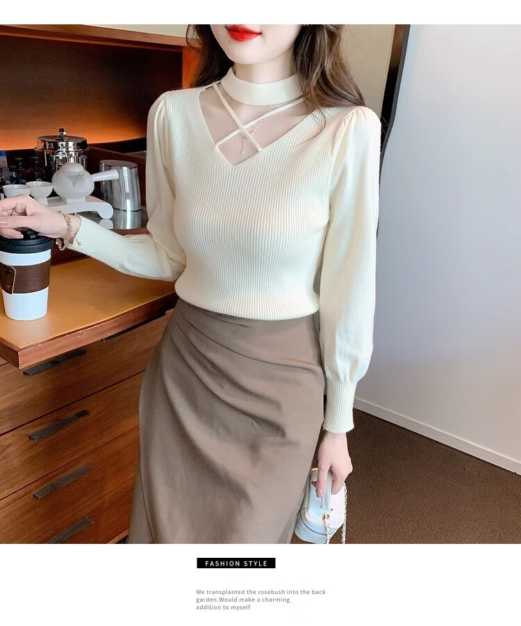 AEMAPE sexy hollow half turtleneck knitted bottoming shirt for women in autumn and winter fashionable style with lantern sleeve top and versatile sweater, apricot color, one size fits all (80-135Jin Jin is equal to 0.5 kg)