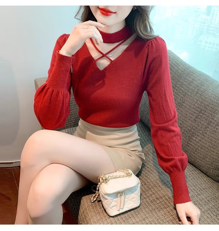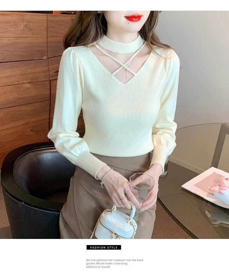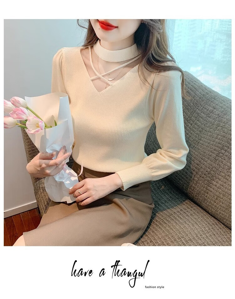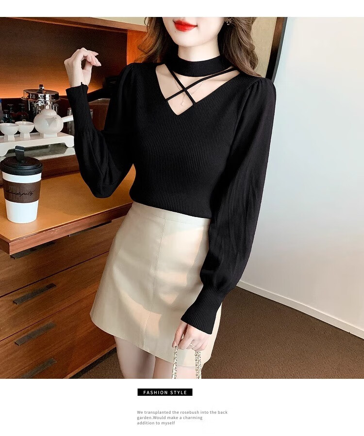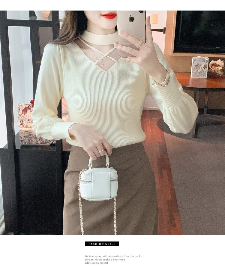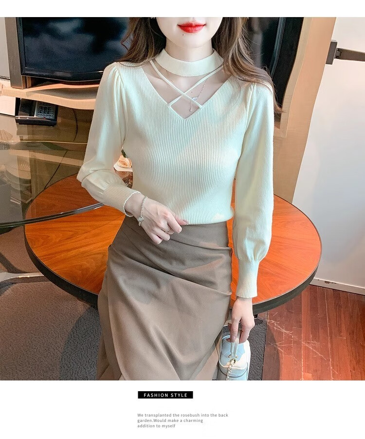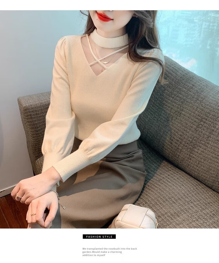AEMAPE sexy hollow half turtleneck knitted bottoming shirt for women in autumn and winter fashionable style with lantern sleeve top and versatile sweater, apricot color, one size fits all (80-135Jin Jin is equal to 0.5 kg)