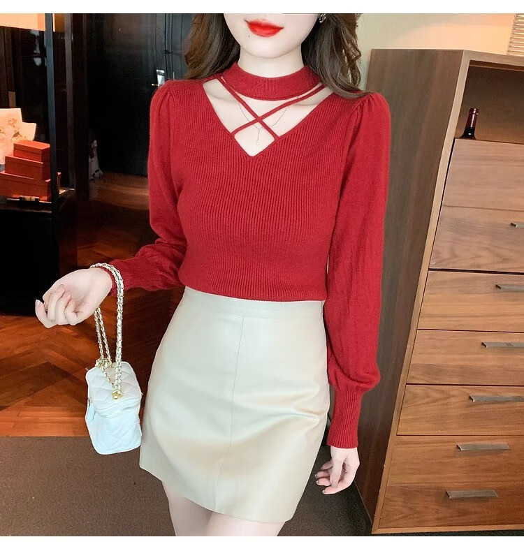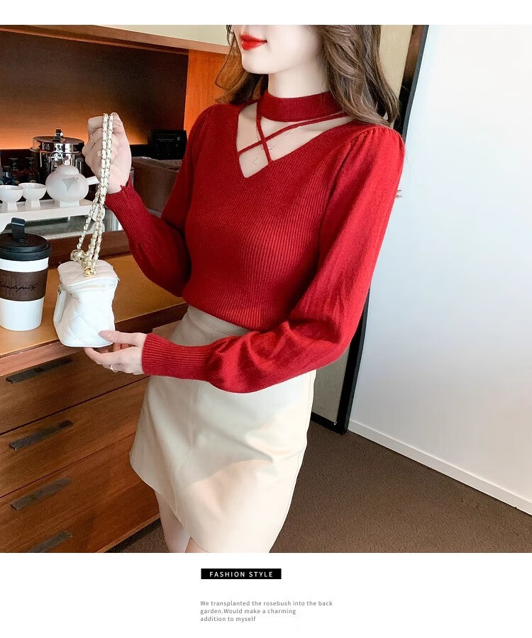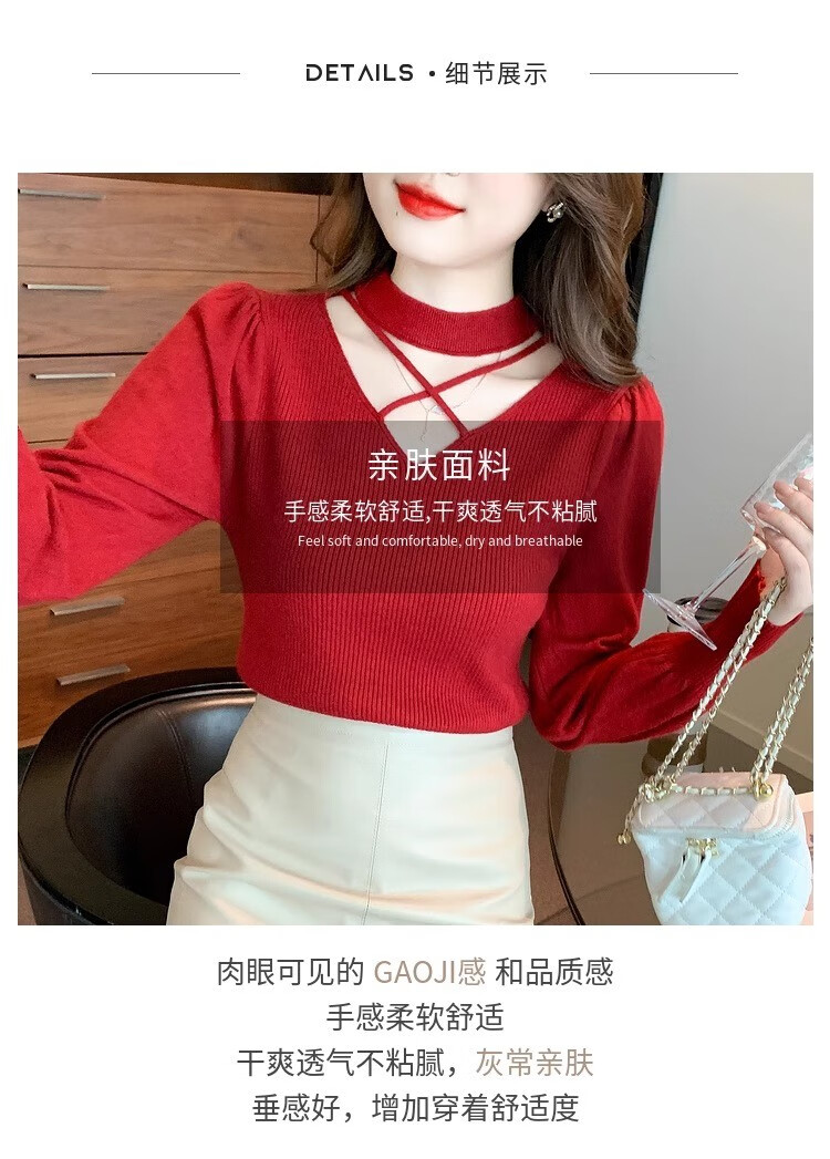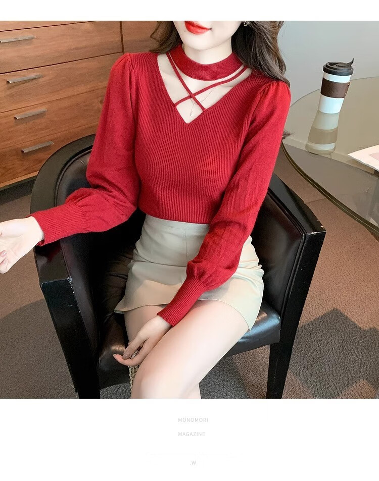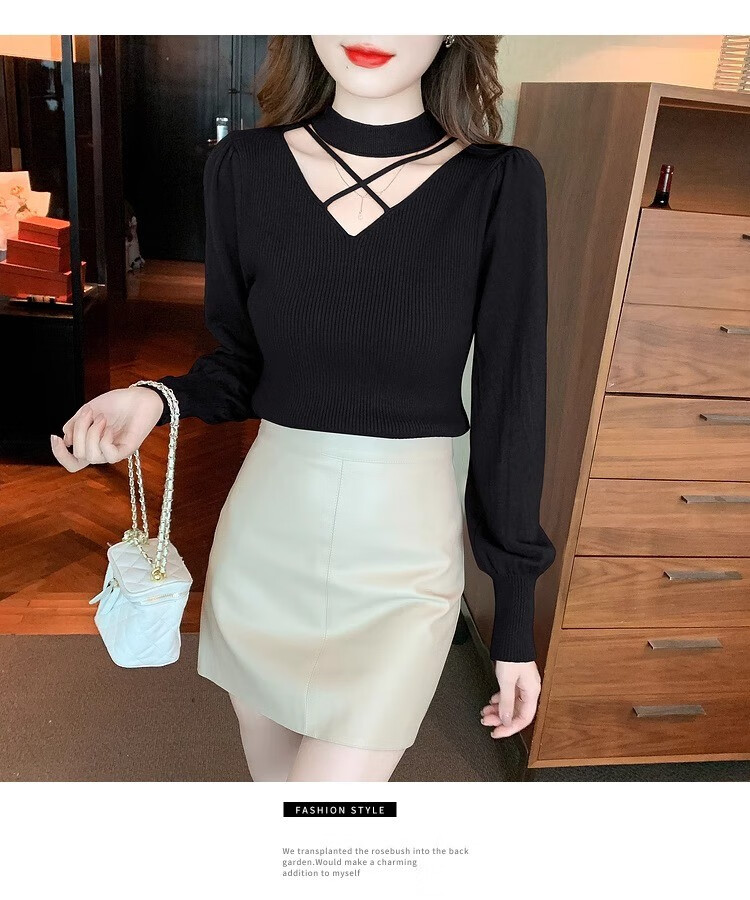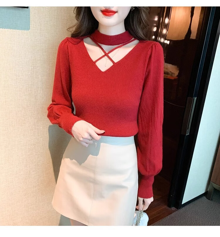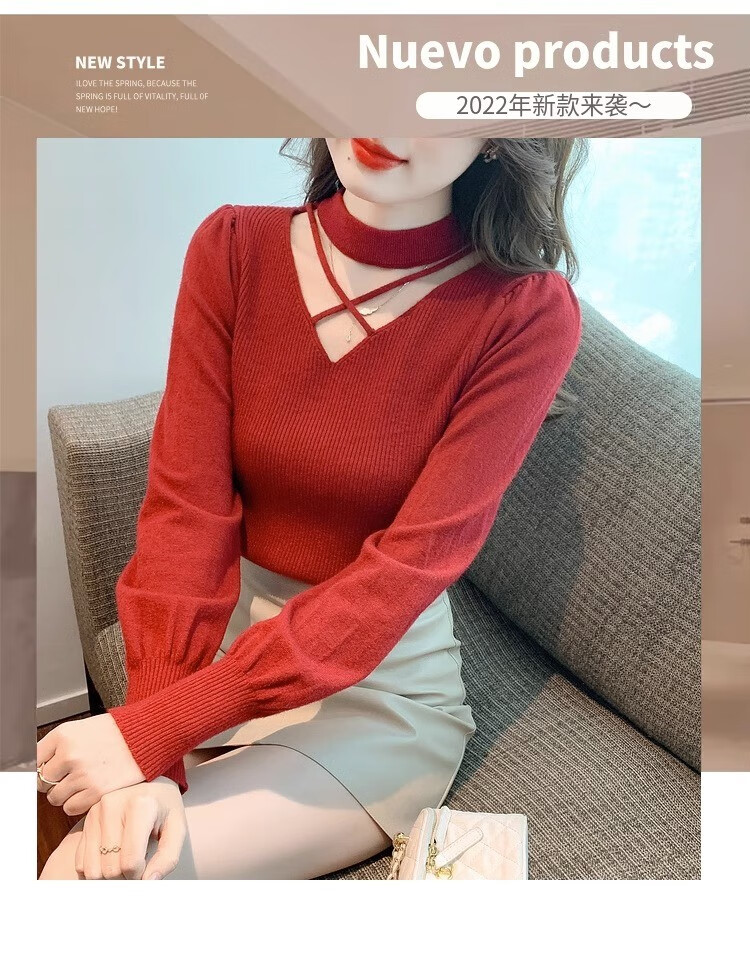 AEMAPE sexy hollow half turtleneck knitted bottoming shirt for women in autumn and winter fashionable style with lantern sleeve top and versatile sweater, apricot color, one size fits all (80-135Jin Jin is equal to 0.5 kg)