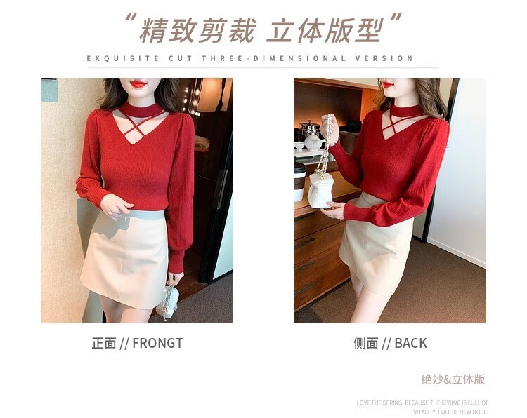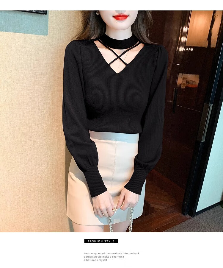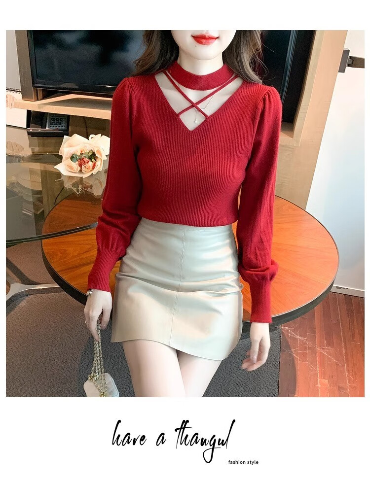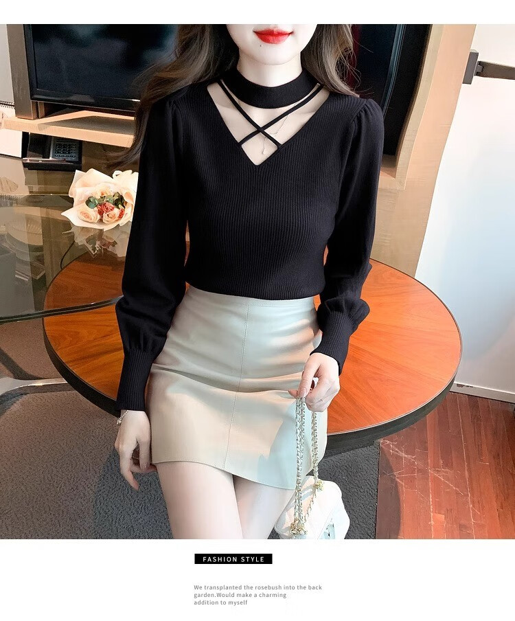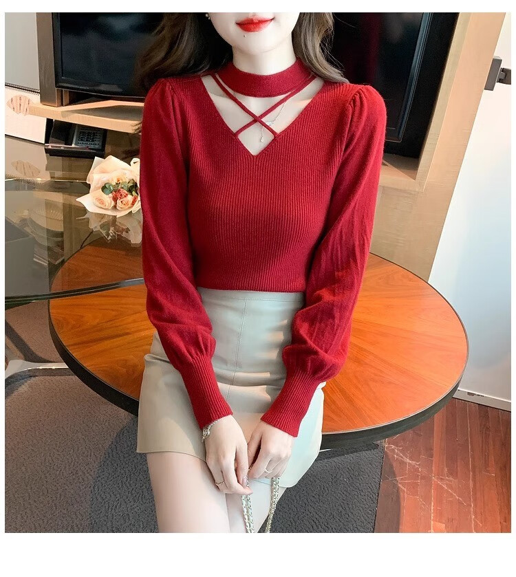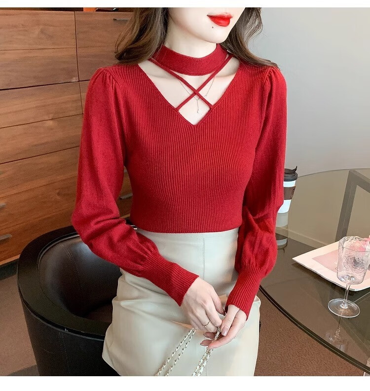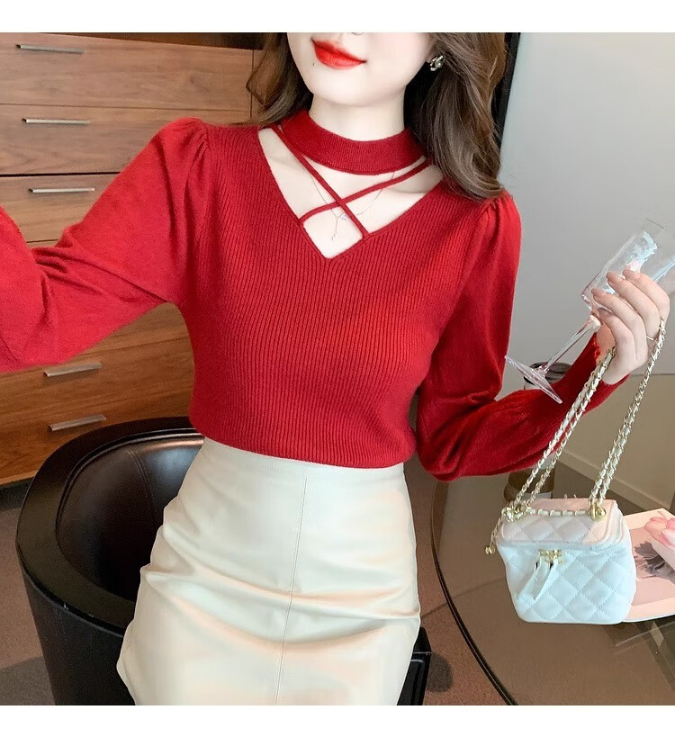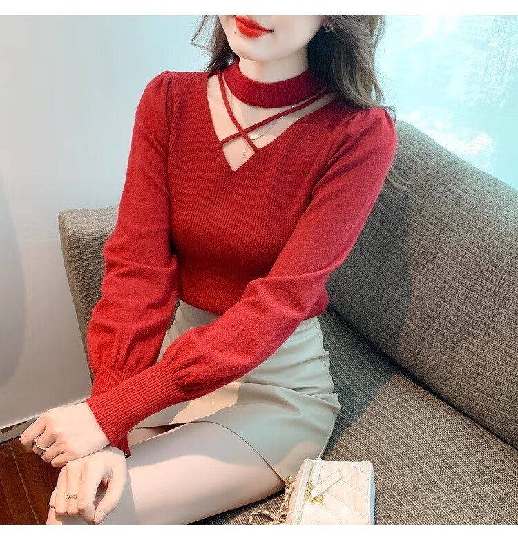 AEMAPE sexy hollow half turtleneck knitted bottoming shirt for women in autumn and winter fashionable style with lantern sleeve top and versatile sweater, apricot color, one size fits all (80-135Jin Jin is equal to 0.5 kg)