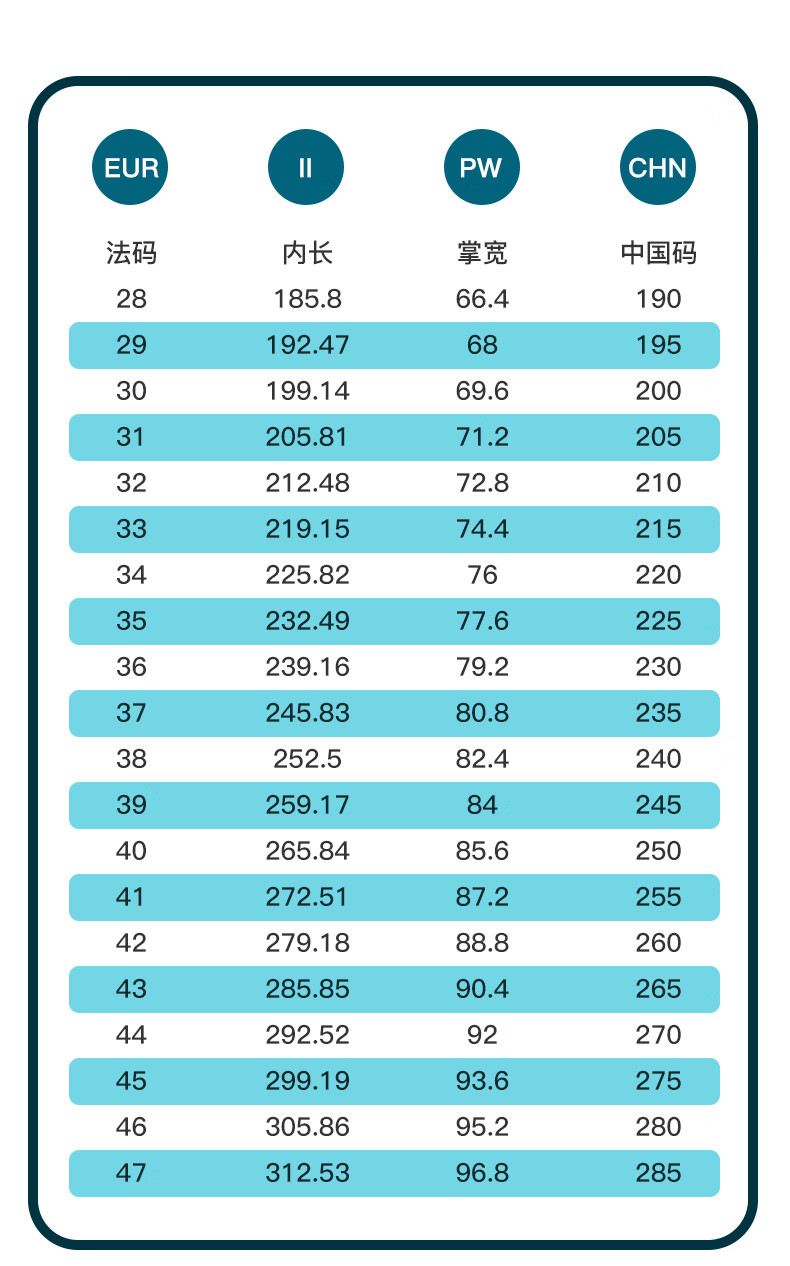 China (cm) 36 - 37 38 - 39 40 - 42 43 - 44 45 - 47
