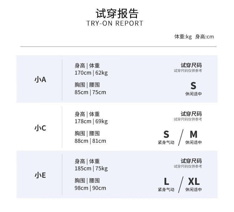 China (cm) 165 / 88-90 170 / 96-98 175 / 108-110 180 / 118-122 185 / 126-130