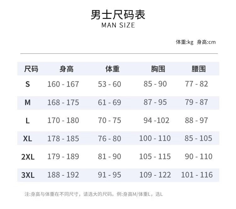 China (cm) 160-165/84-86 165-170 / 88-90 167-172 / 92-96 168-173 / 98-102 170-176 / 106-110