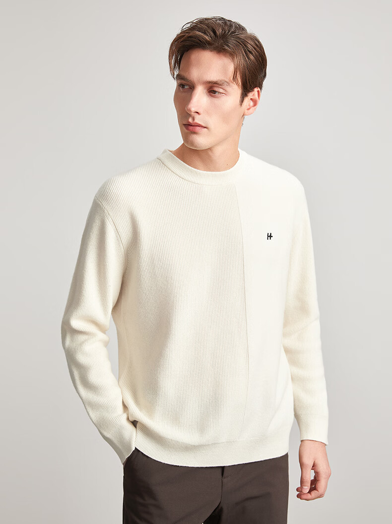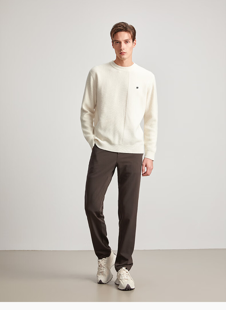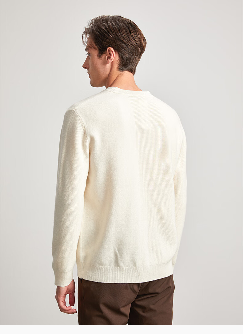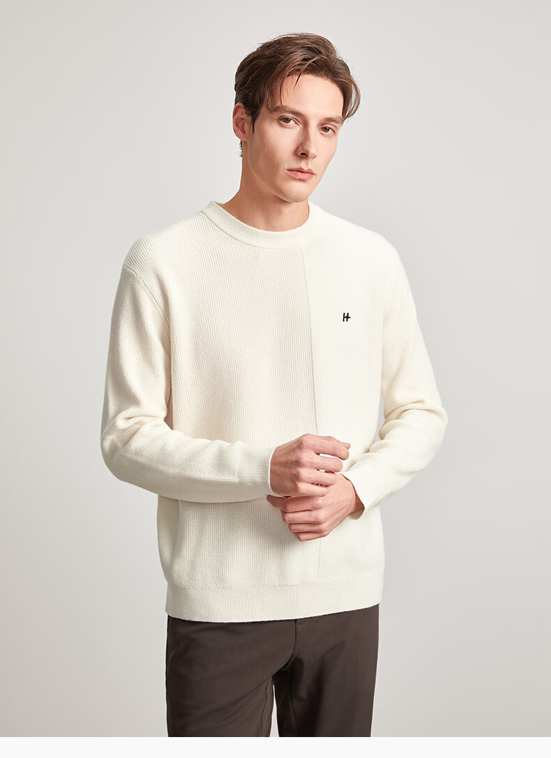 HECHTER 100% wool men's round neck wool sweater solid color skin-friendly, comfortable, warm and versatile sweater for men off-white - hot selling color M
