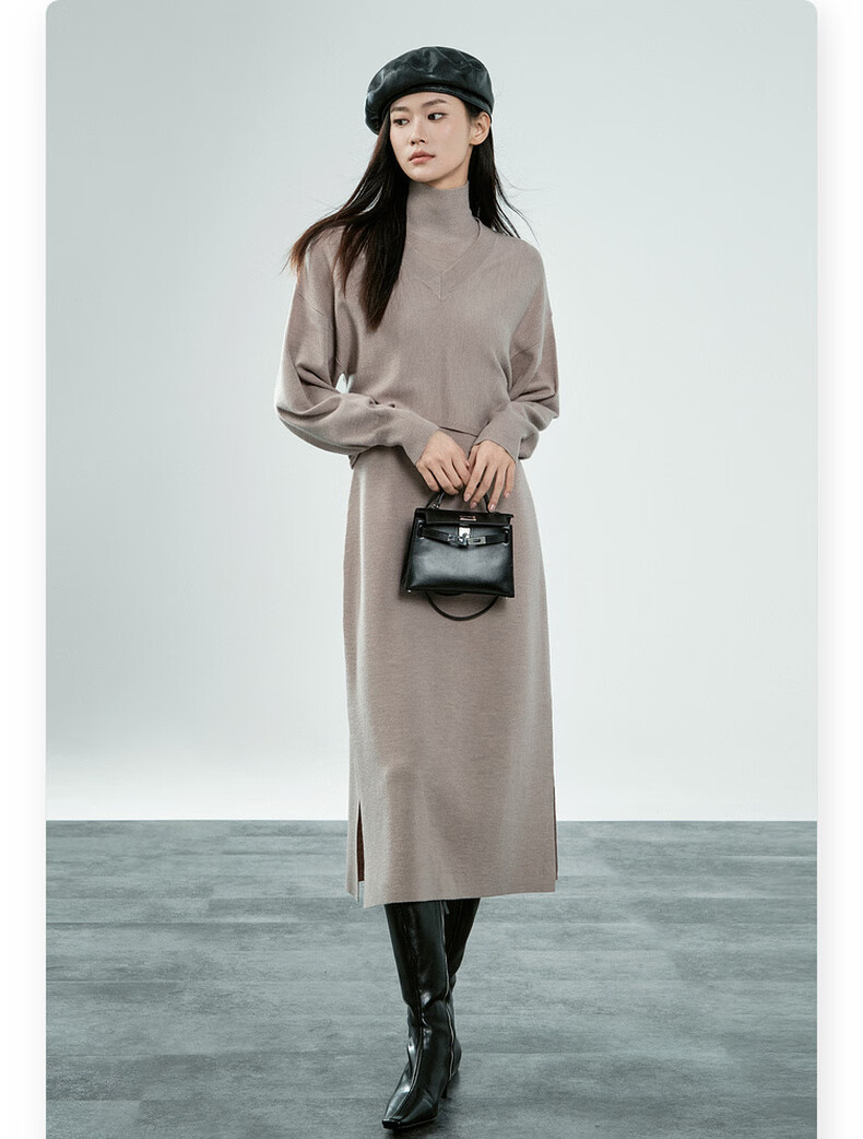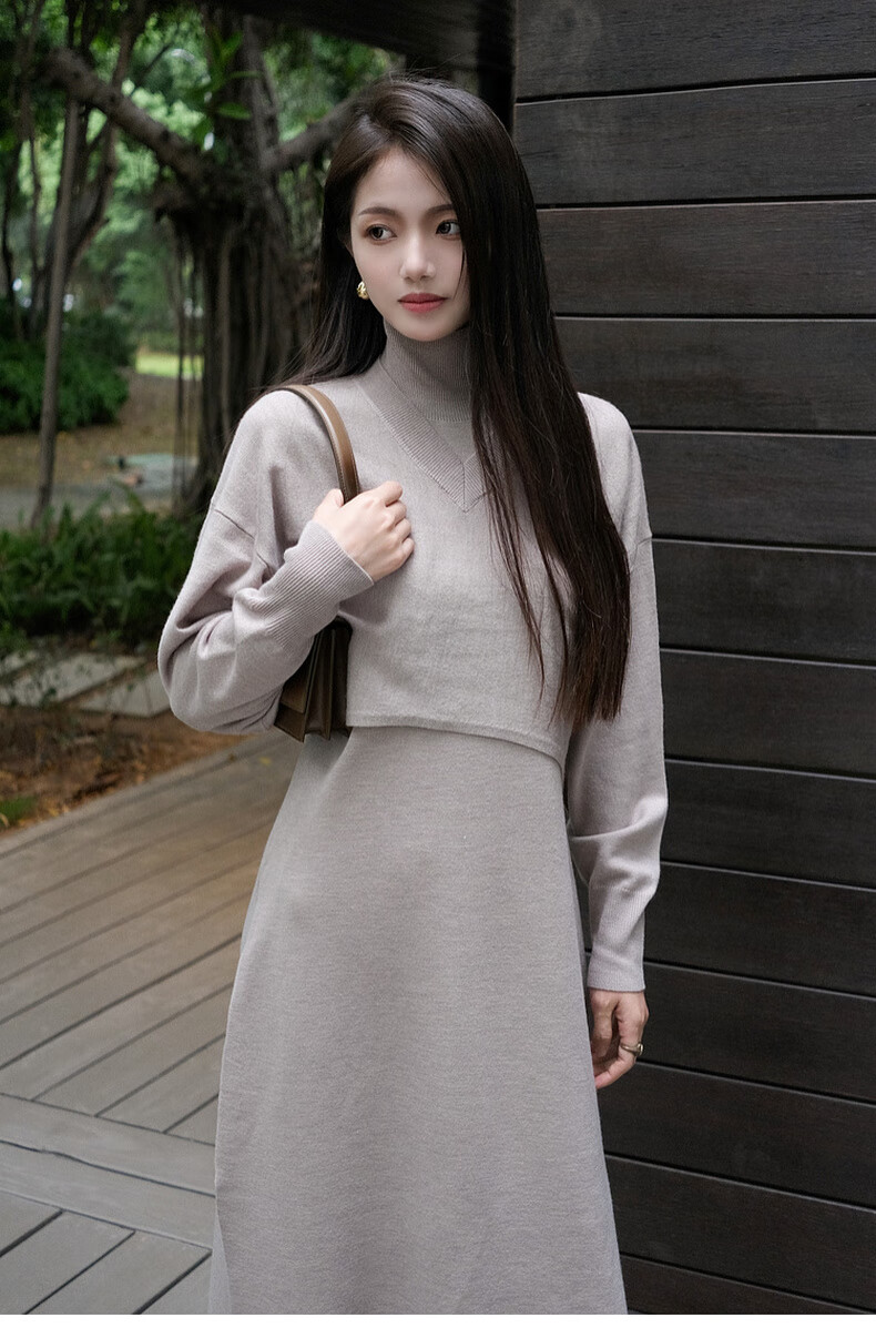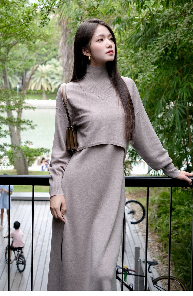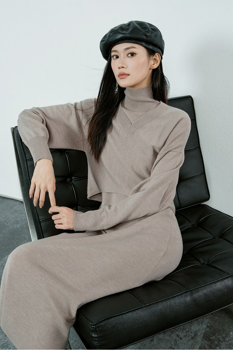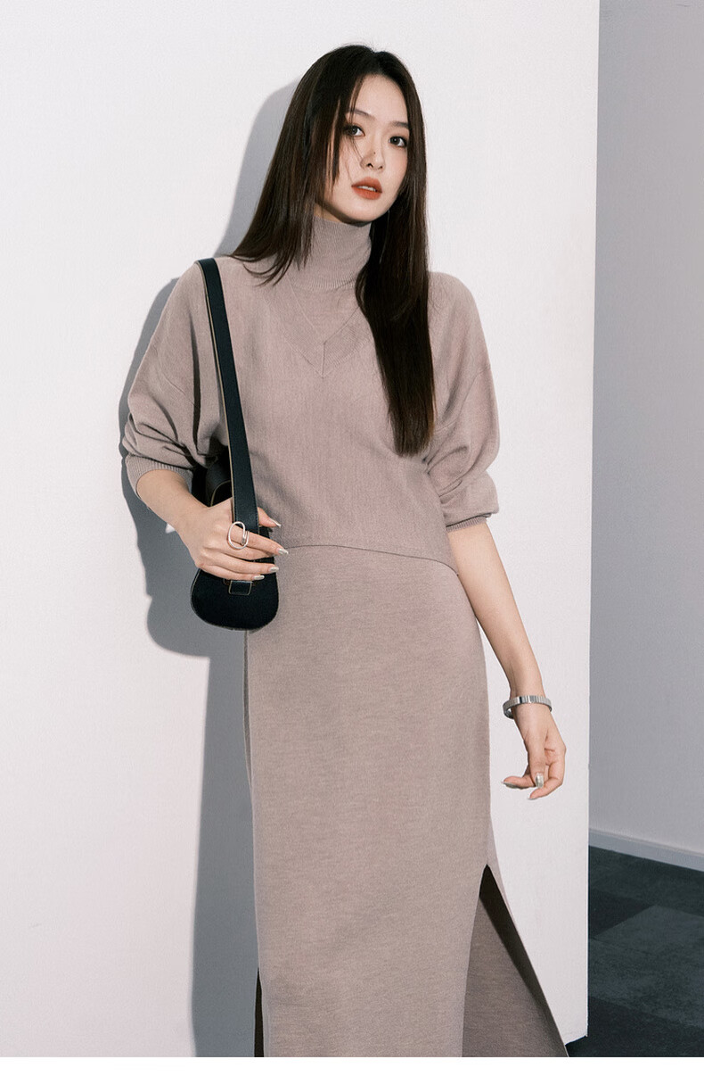 MEIYANG Champagne knitted wool suit Quiet and luxurious temperament V-neck long-sleeved sweater straight tank top skirt new sweater sweater light coffee (top) S