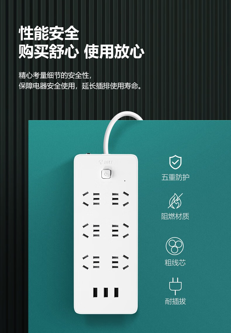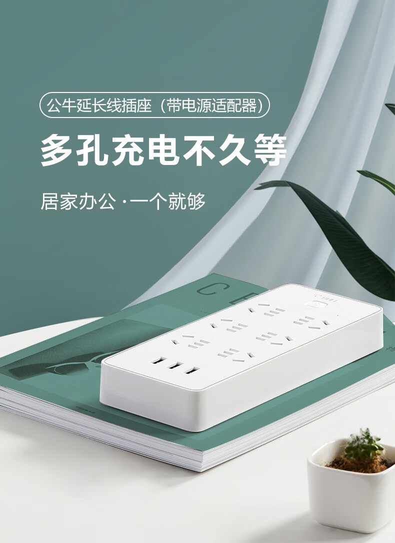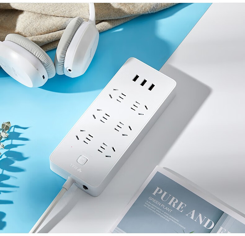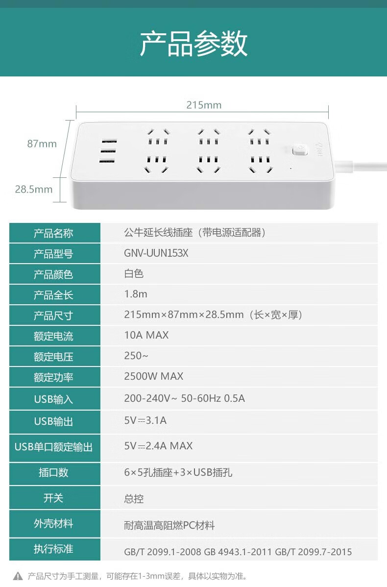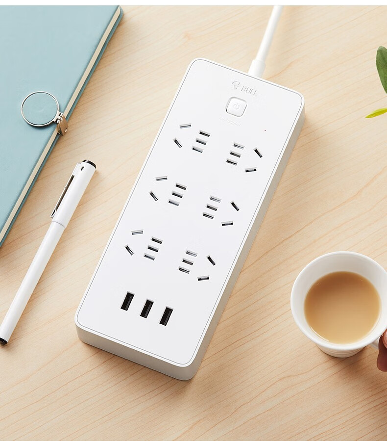 Bull plug strip UUN153X boxed white USB socket Xiaobai, total length 1.8 meters, 3*USB+6*five holes+master control switch