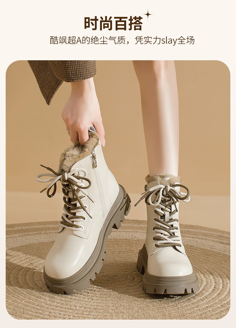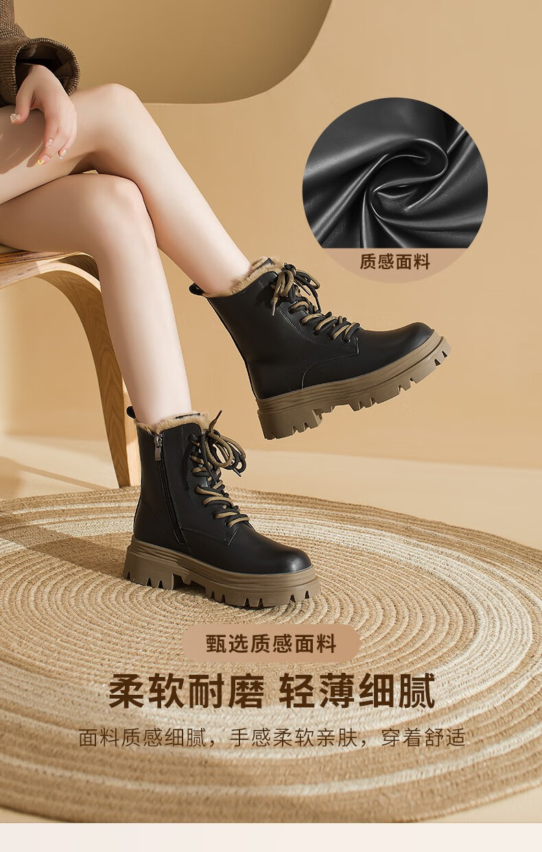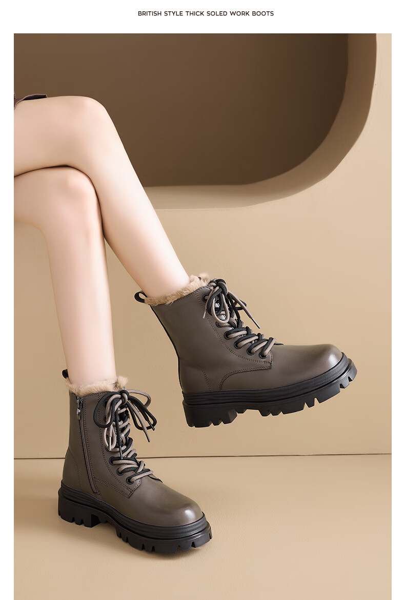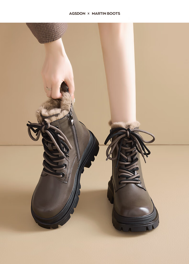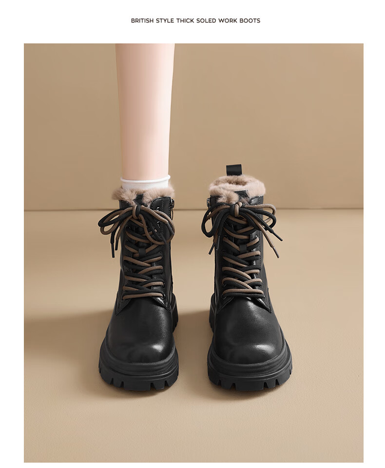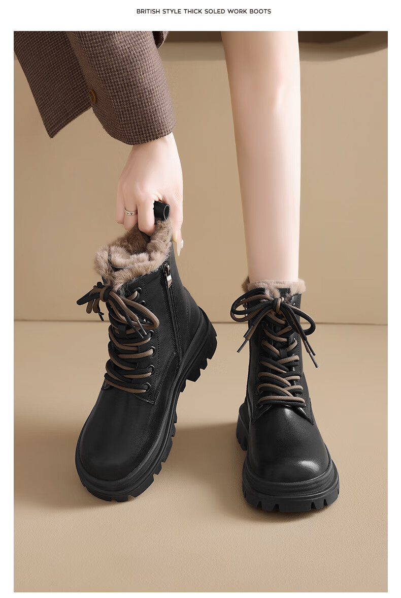 Augushiden Martin boots for women 2025 new winter plus velvet warm thick-soled snow boots British style mid-calf short boots cotton shoes 634217 meters khaki thick velvet 37