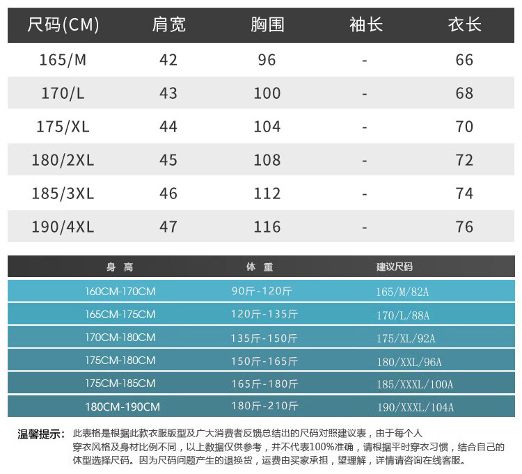 China (cm) 165 / 88-90 170 / 96-98 175 / 108-110 180 / 118-122 185 / 126-130