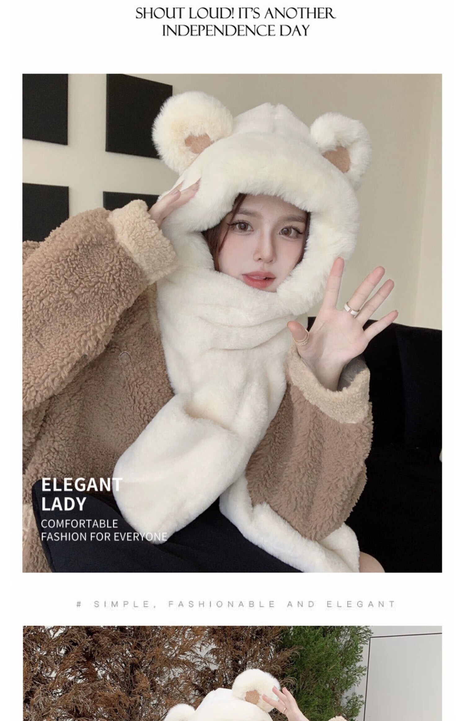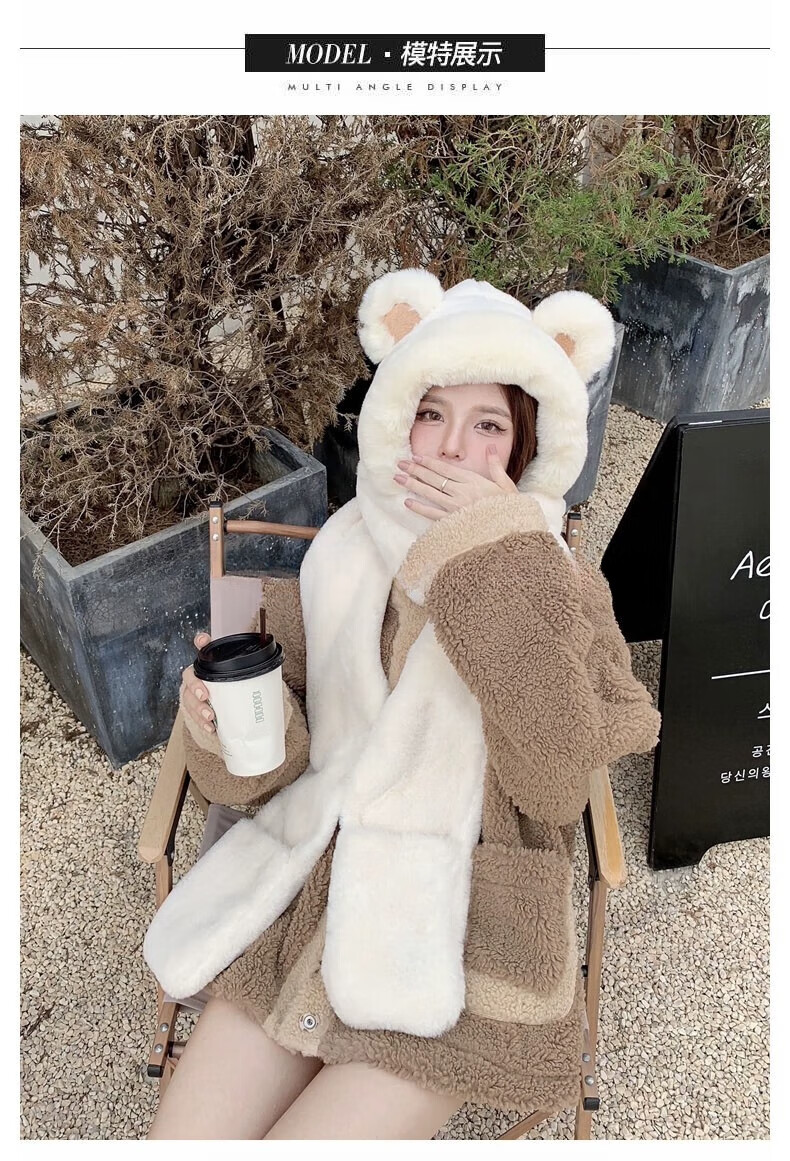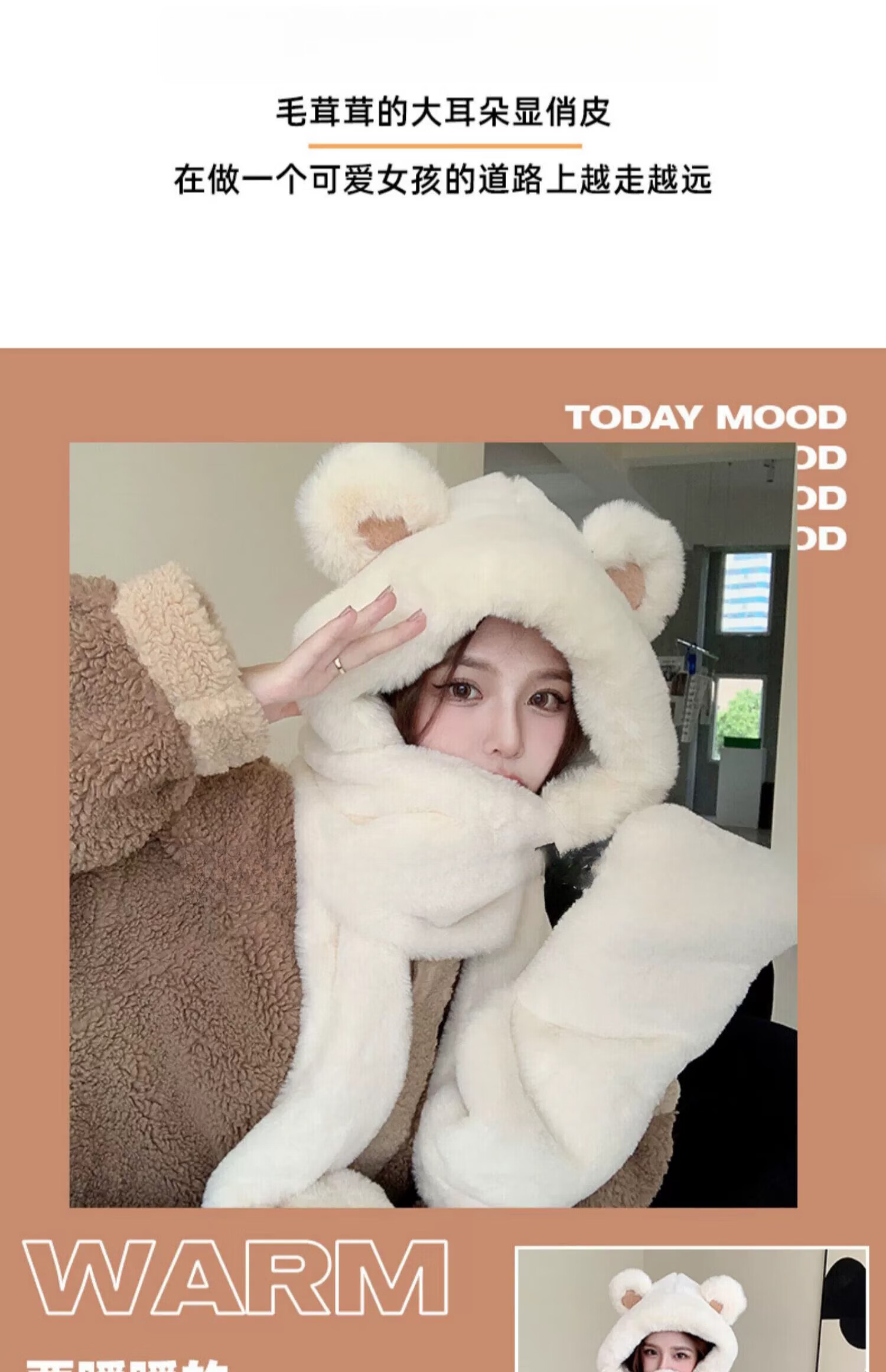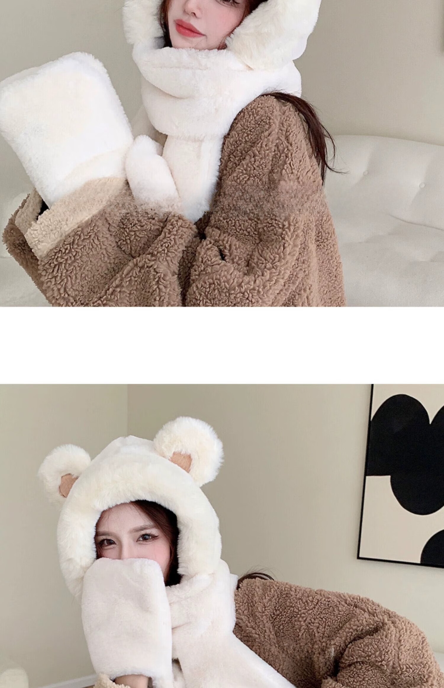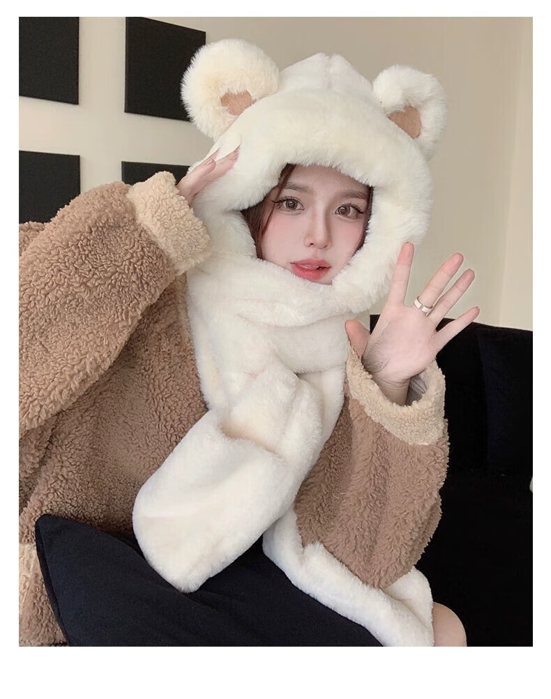 QIPEIER Bear Hat Autumn and Winter Women's Scarf Gloves One-piece Hooded Winter Scarf Cute Warm Plush Winter Three-piece Set BNTZ-464 White