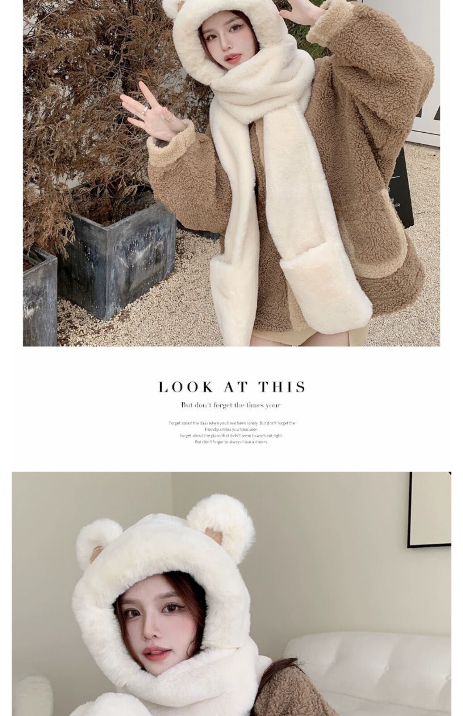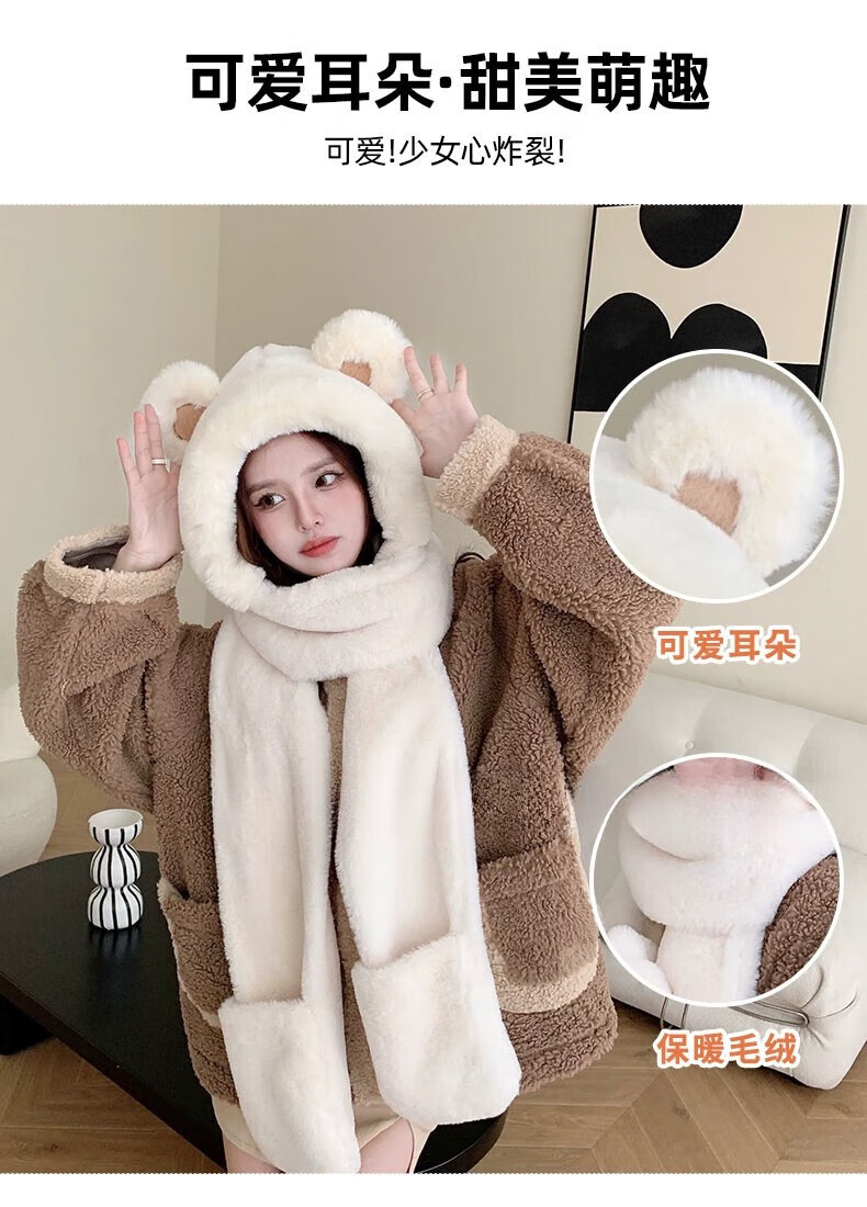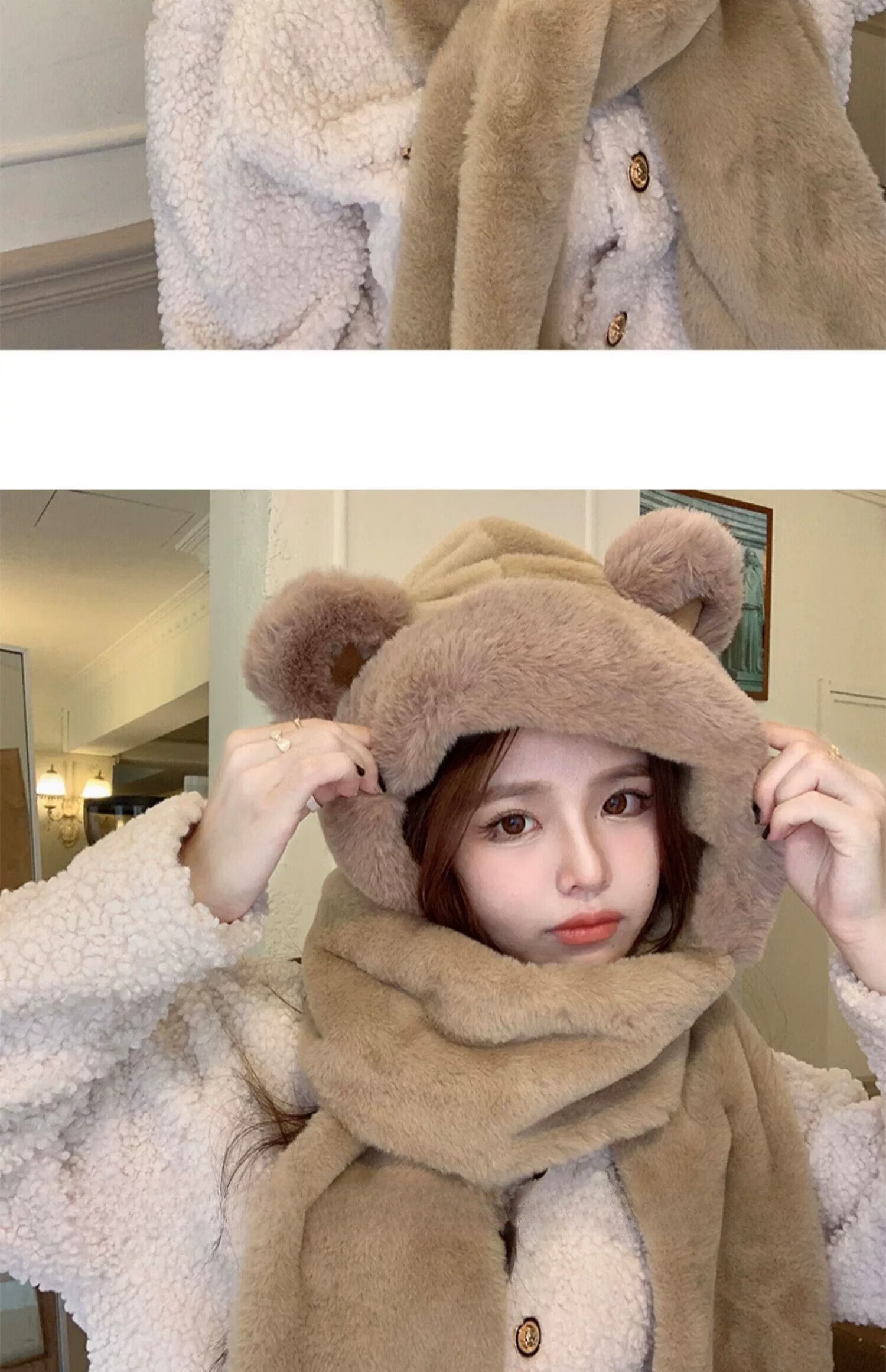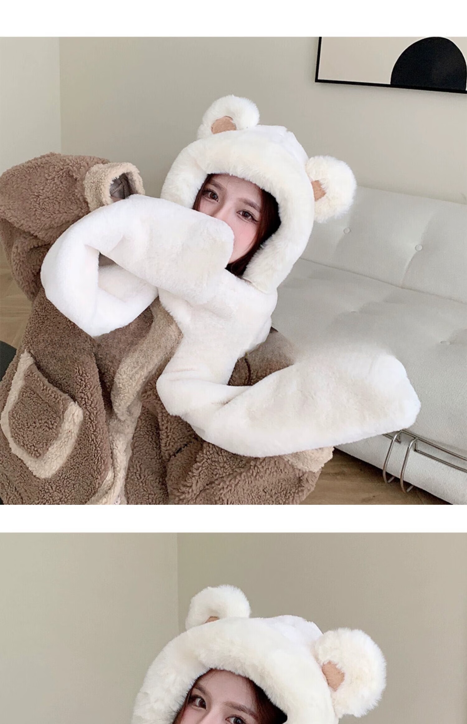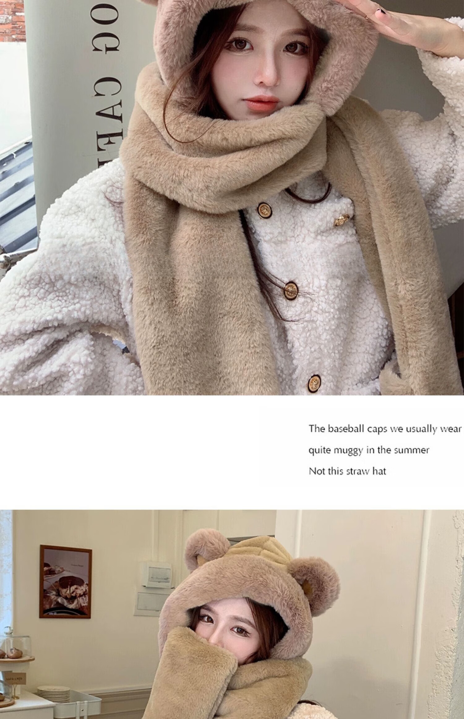 QIPEIER Bear Hat Autumn and Winter Women's Scarf Gloves One-piece Hooded Winter Scarf Cute Warm Plush Winter Three-piece Set BNTZ-464 White