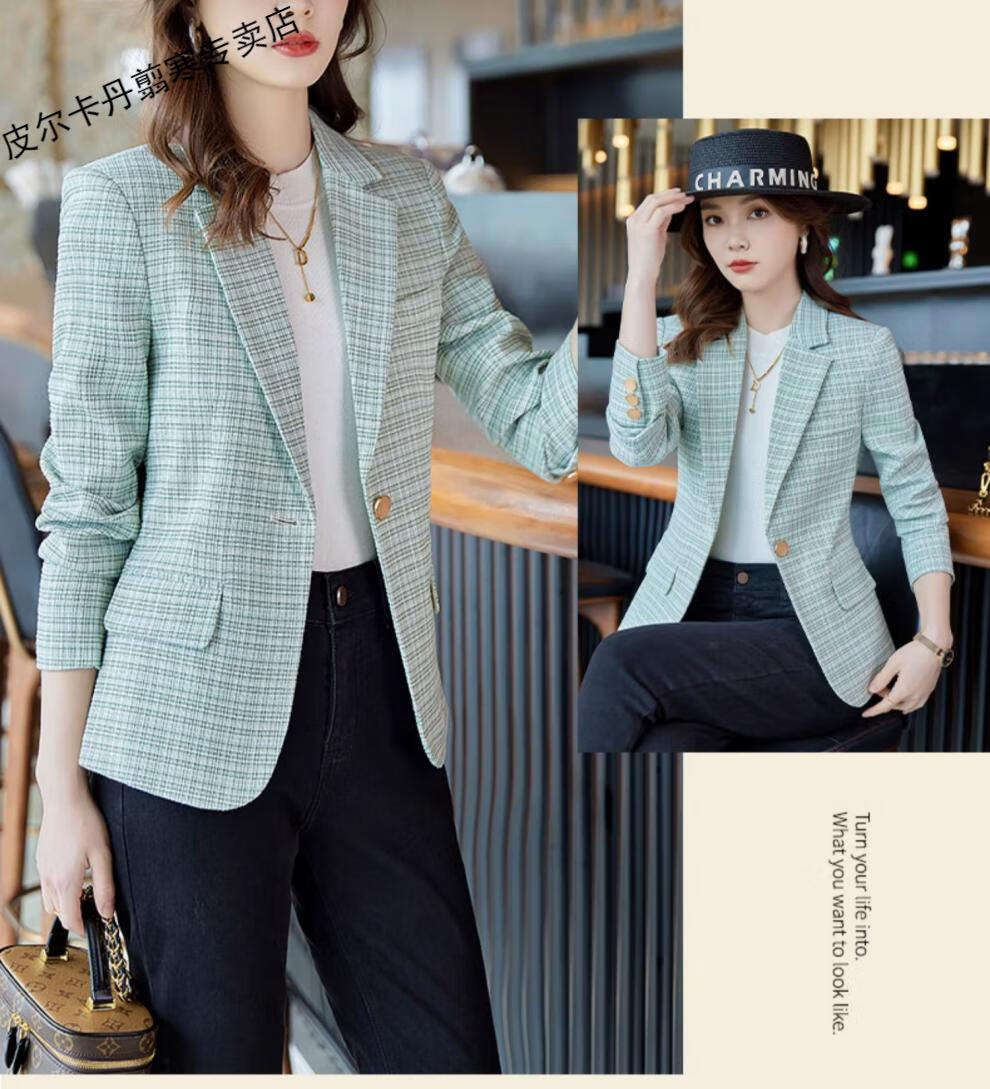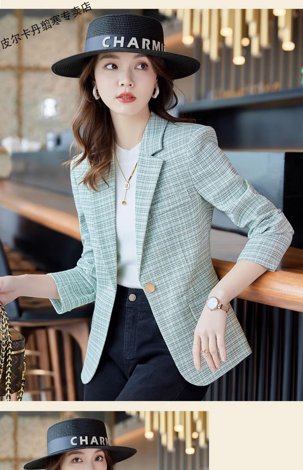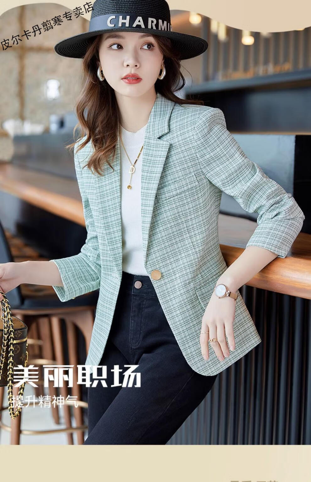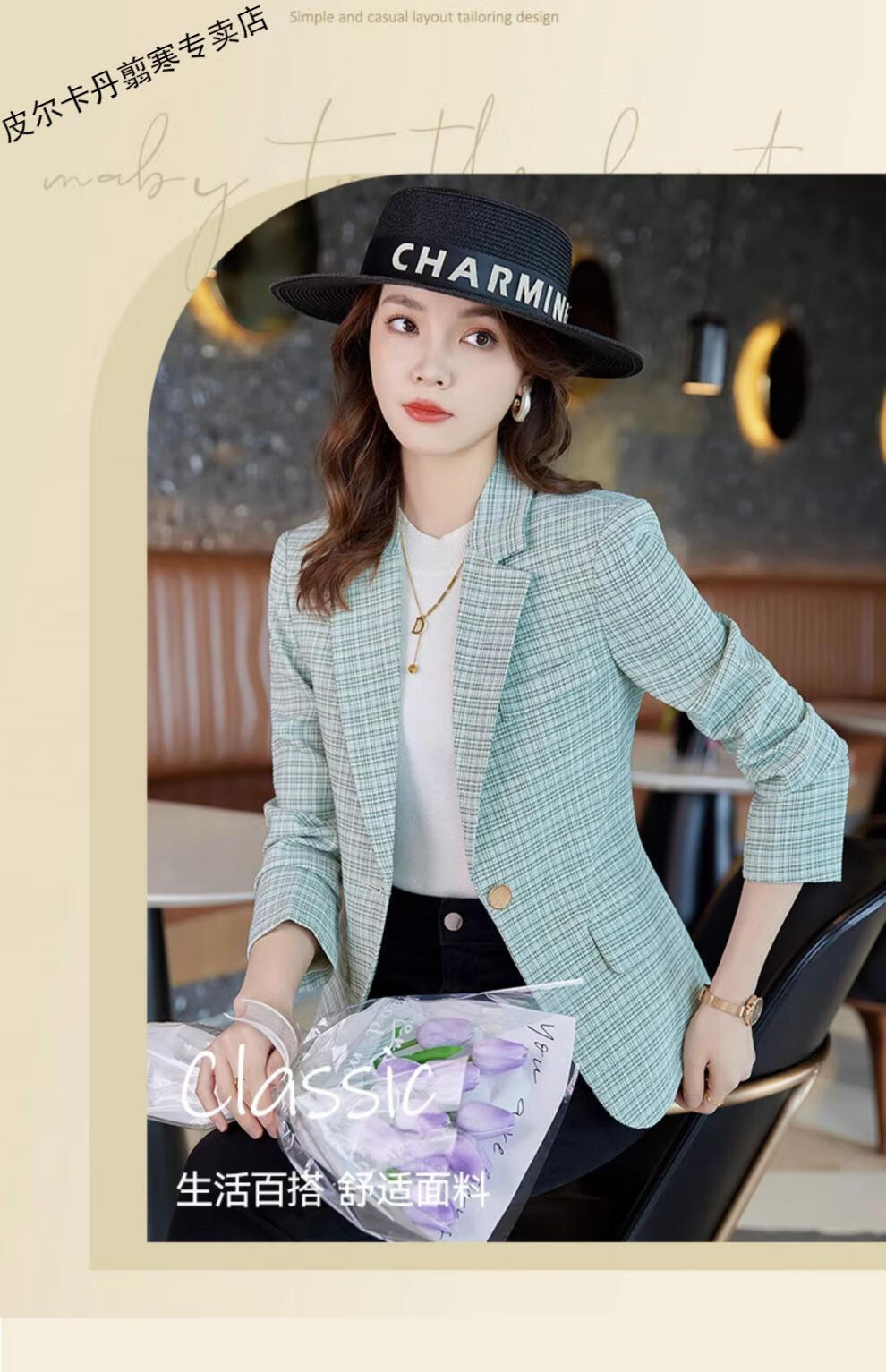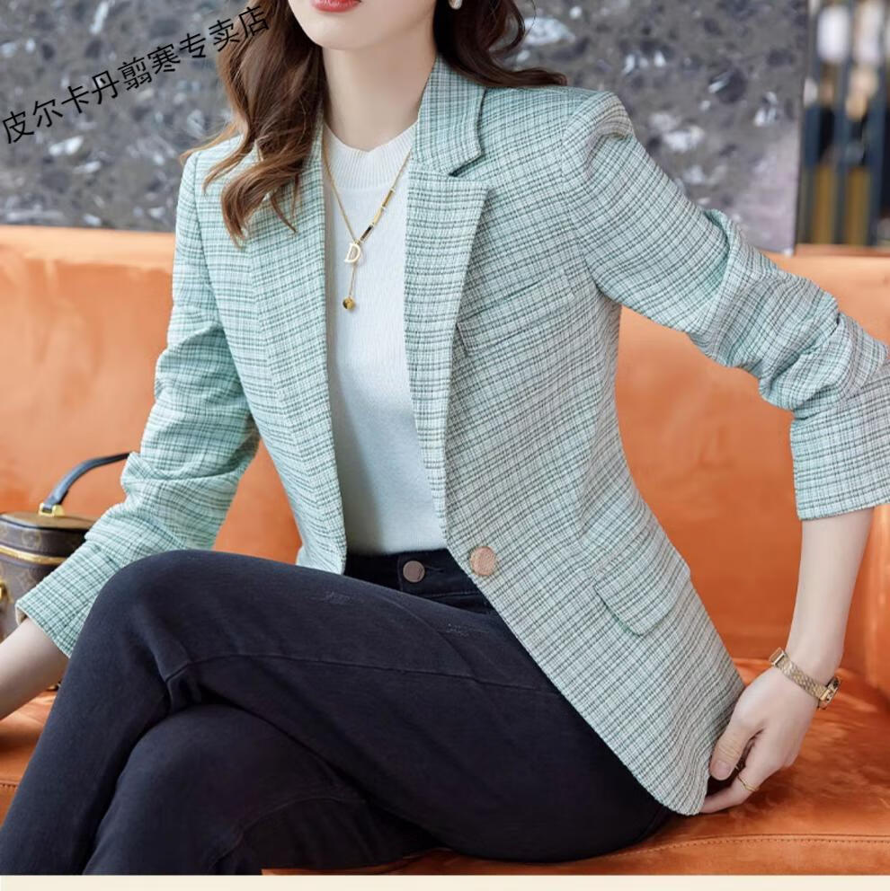 Pierre Cardin Plaid Small Suit Women's Short Fashion Casual Long Sleeve Women's Professional Suit Cardigan Jacket New Temperament Top Green Suit (Coat Women) XL 116-125Jin Jin equals 0.5 kg
